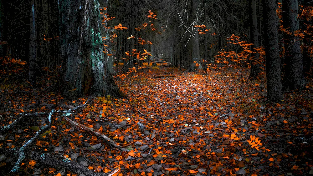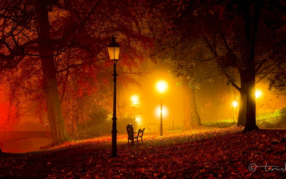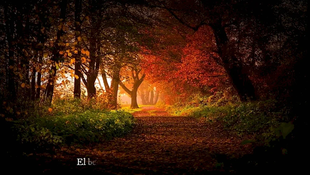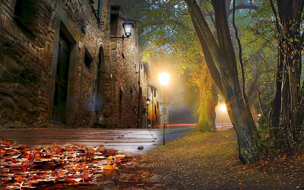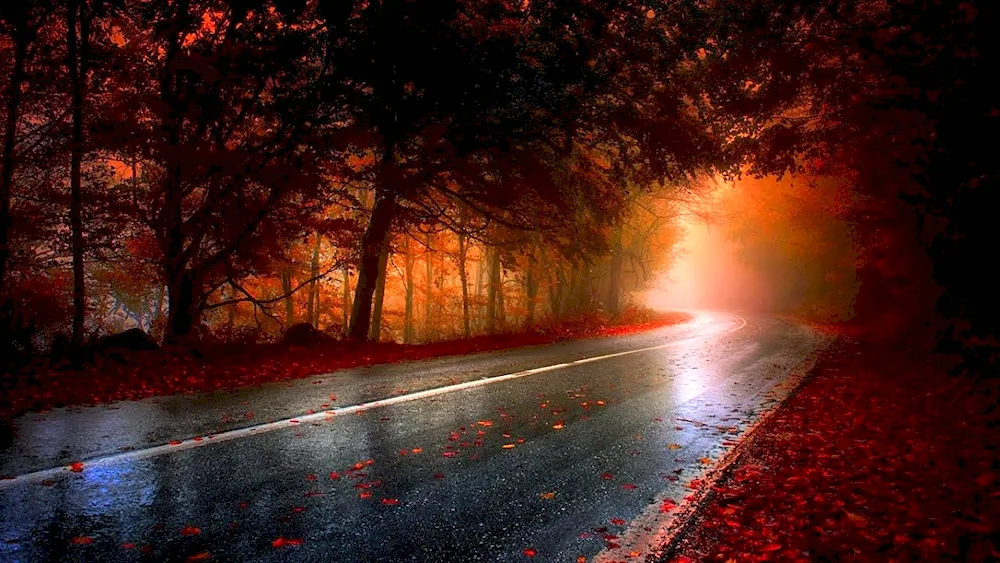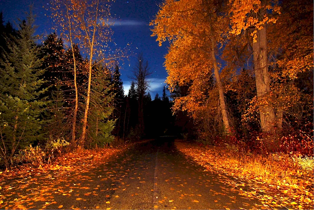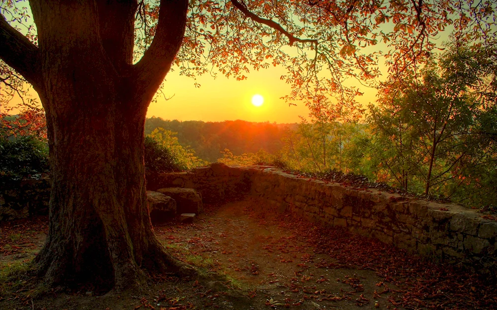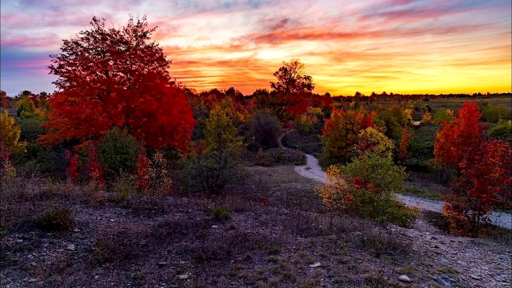 Evening in Autumn: A stunning photo of colorful leaves falling from the trees against a backdrop of a pink and purple sky, creating a peaceful and serene atmosphere. In another image, a cozy bonfire is burning in the midst of a forest, casting a warm glow on the surrounding trees and enhancing the beauty of the season.