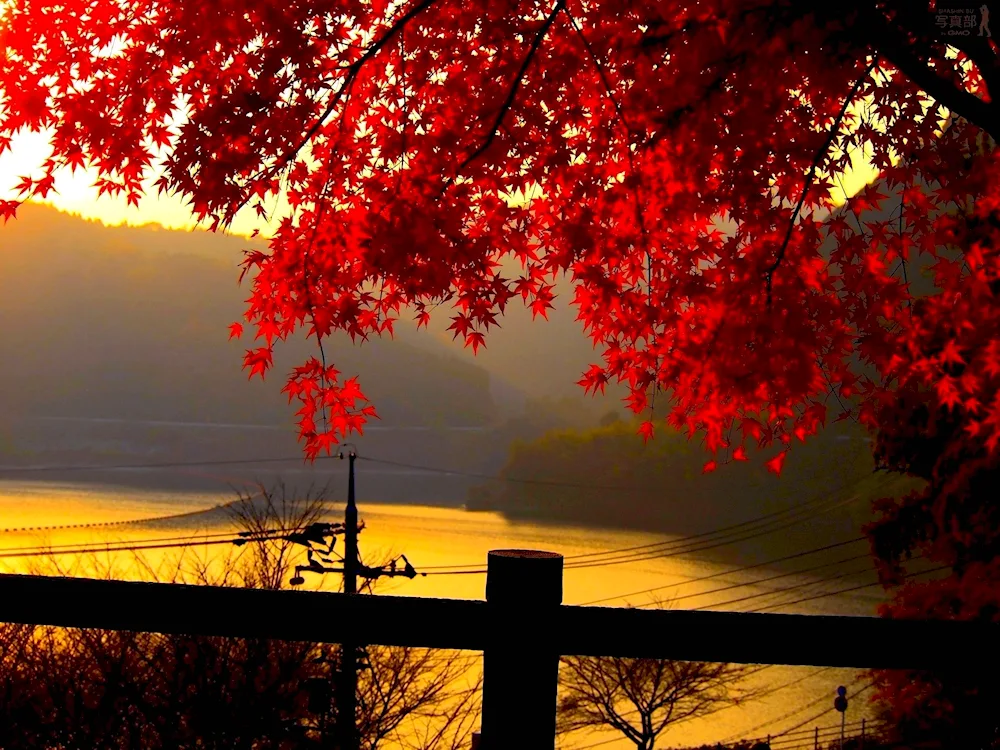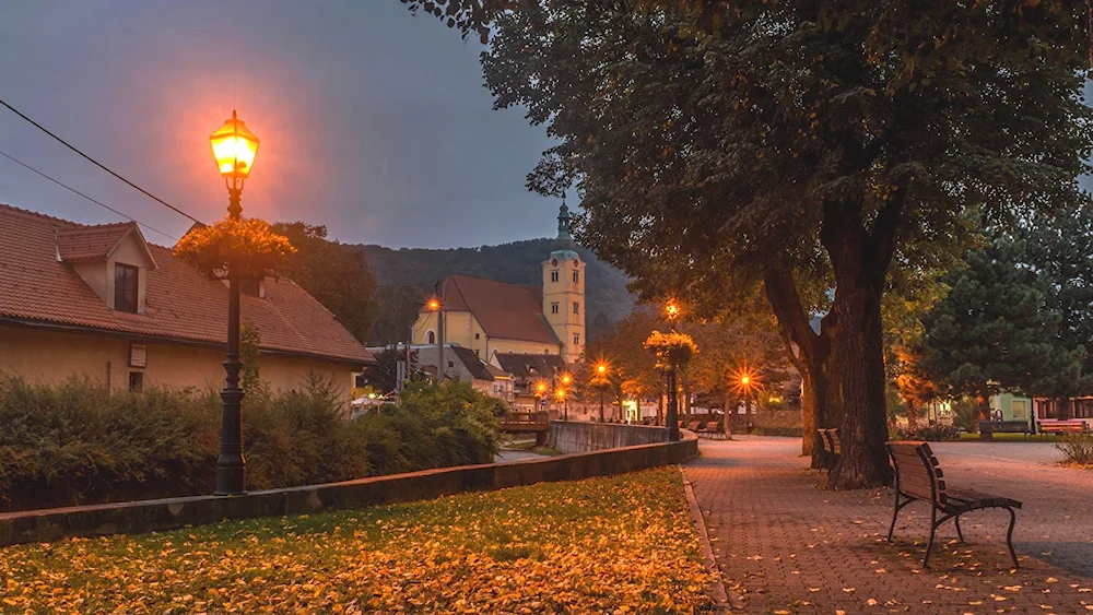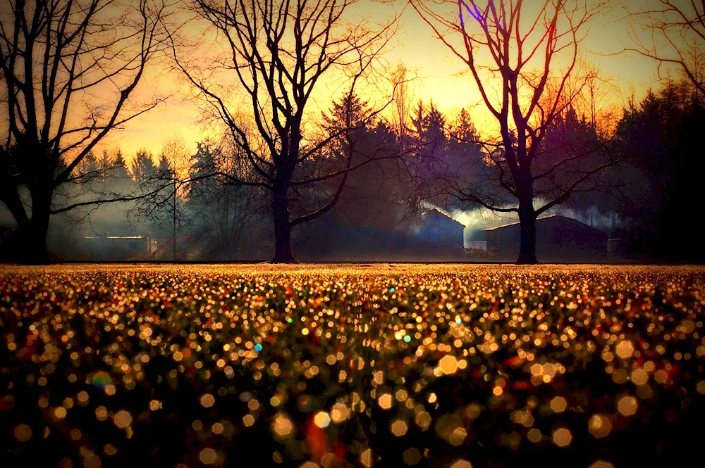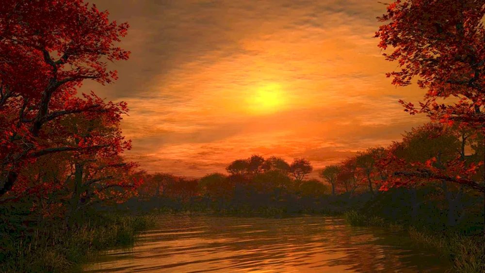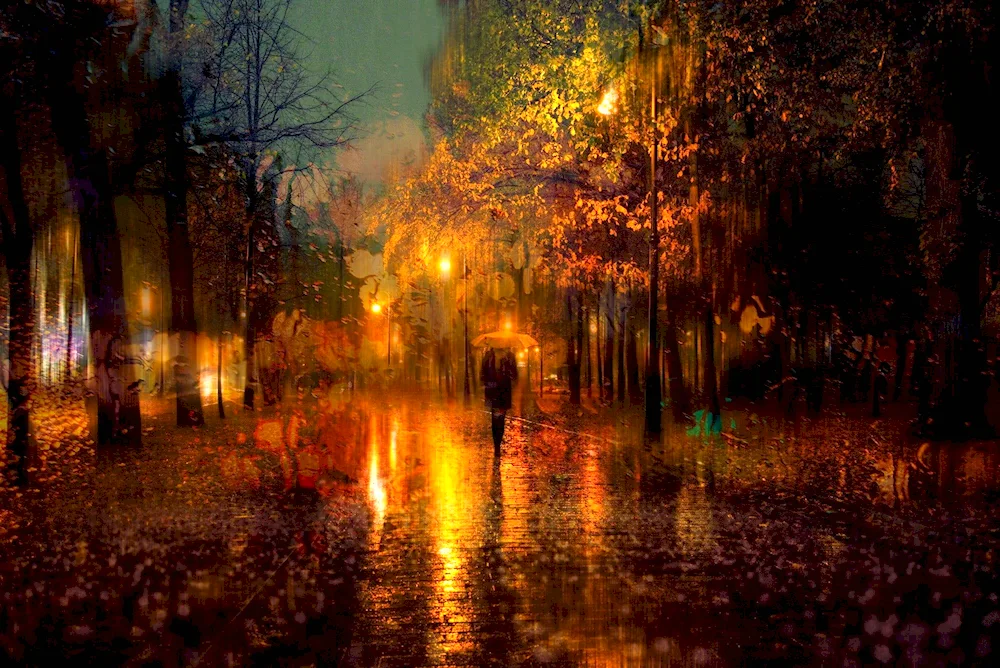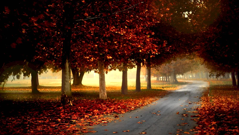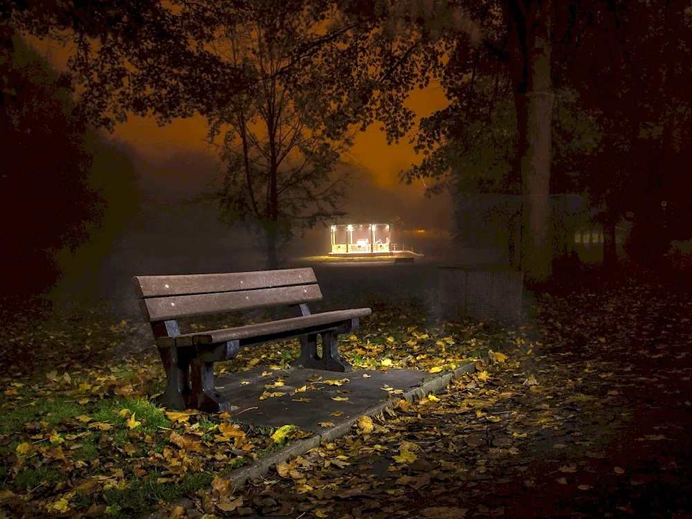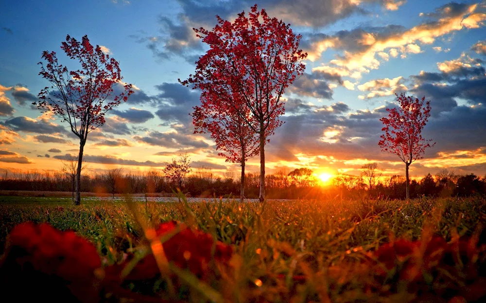 Evening in Autumn: A stunning photo of colorful leaves falling from the trees against a backdrop of a pink and purple sky, creating a peaceful and serene atmosphere. In another image, a cozy bonfire is burning in the midst of a forest, casting a warm glow on the surrounding trees and enhancing the beauty of the season.