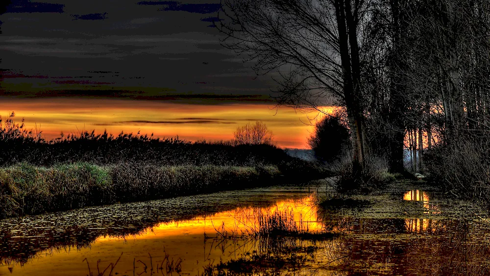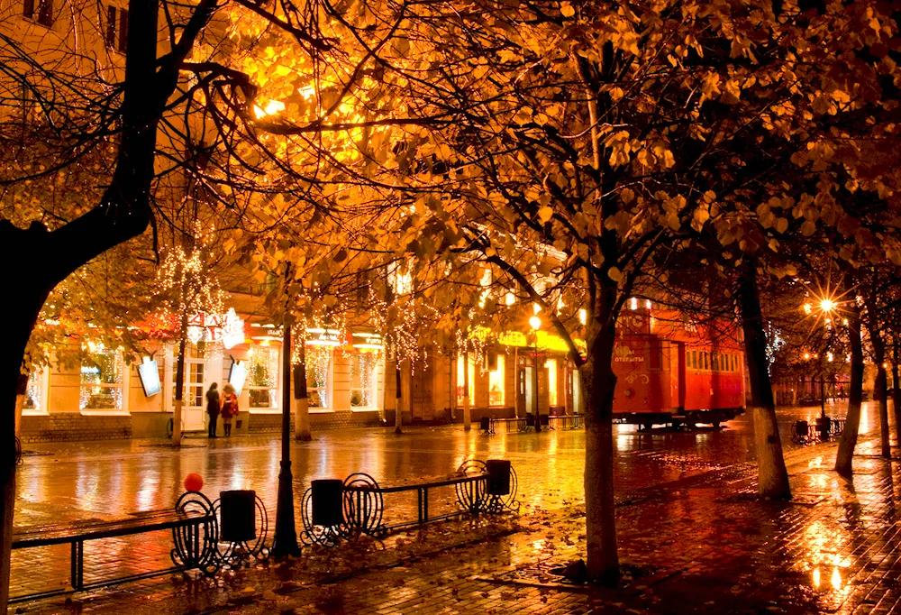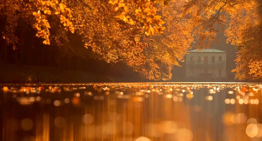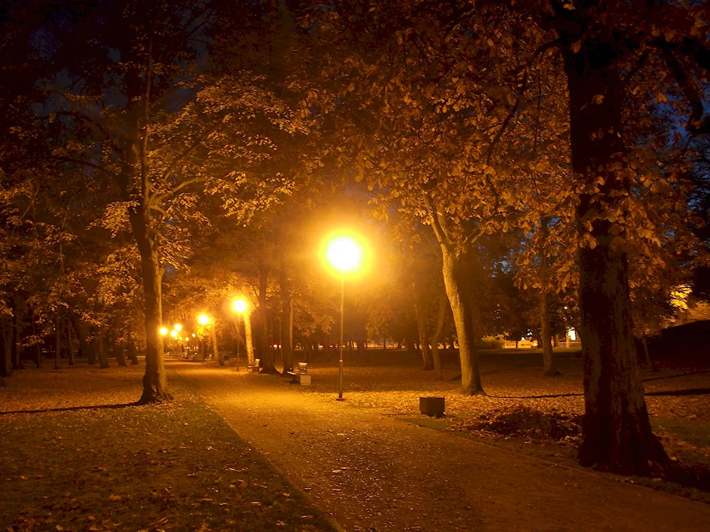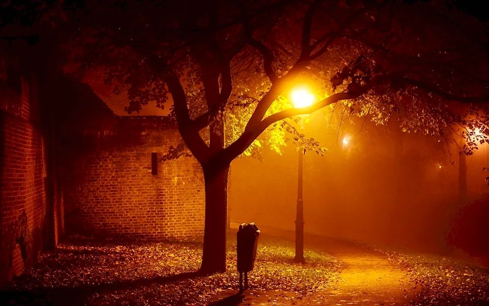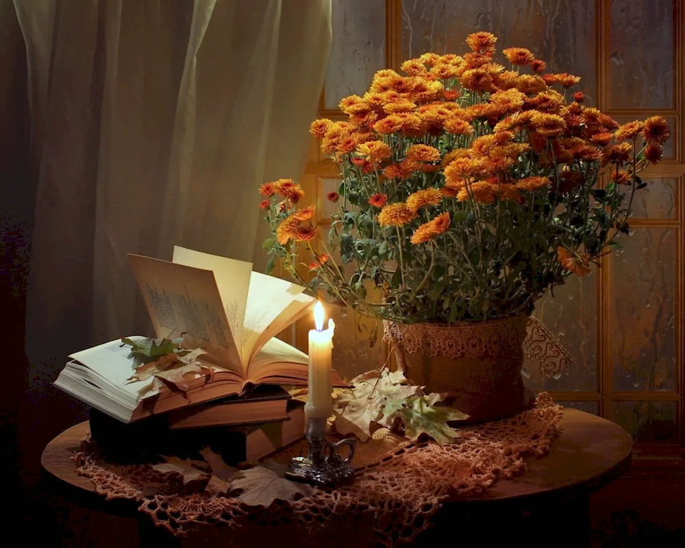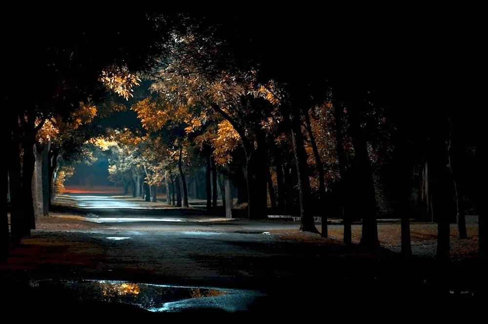 Evening in Autumn: A stunning photo of colorful leaves falling from the trees against a backdrop of a pink and purple sky, creating a peaceful and serene atmosphere. In another image, a cozy bonfire is burning in the midst of a forest, casting a warm glow on the surrounding trees and enhancing the beauty of the season.