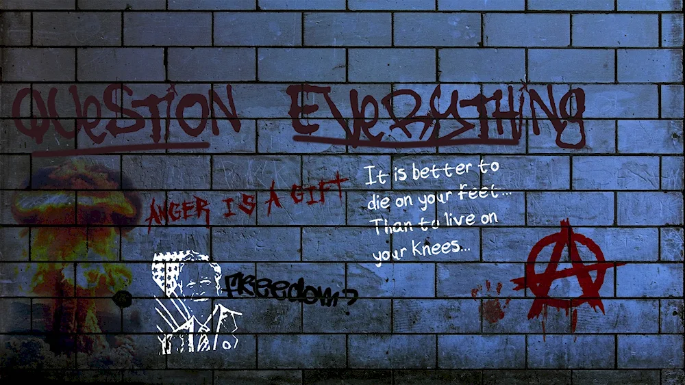 Background anarchy Anarchy in the Background: A chaotic collage of graffiti, torn posters, and protest signs scattered across a city wall. The images capture the raw energy and defiance of a community in turmoil.
