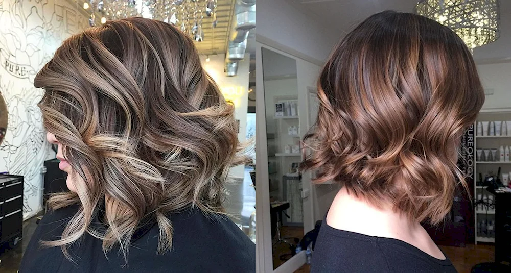 Photos of a gorgeous balayage bob hairstyle on dark hair, showcasing a blend of subtle caramel and honey highlights for a stunning and natural look. The images capture the sleek and modern style of the bob haircut paired with the soft and dimensional coloring of the balayage technique, perfect for anyone looking to enhance their dark locks with a touch of warmth and depth.