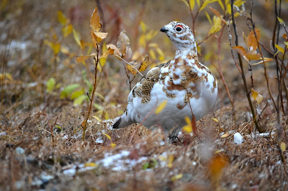 Birds of the Tundra Photo 1 shows a majestic snowy owl perched on a tree branch in the Arctic tundra. In photo 2, a group of colorful ptarmigans blend into their snowy surroundings, showcasing their impressive camouflage skills.