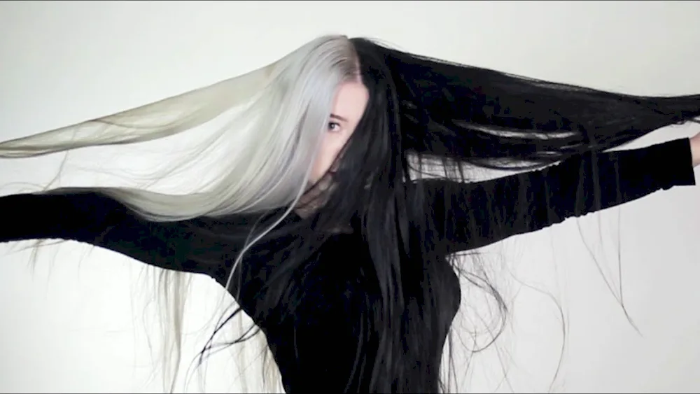 Black and white hair split down the middle gives a striking contrast, creating a bold and unique look that is sure to turn heads. The monochromatic color scheme adds a touch of sophistication and modernity to your hairstyle, making a powerful fashion statement.