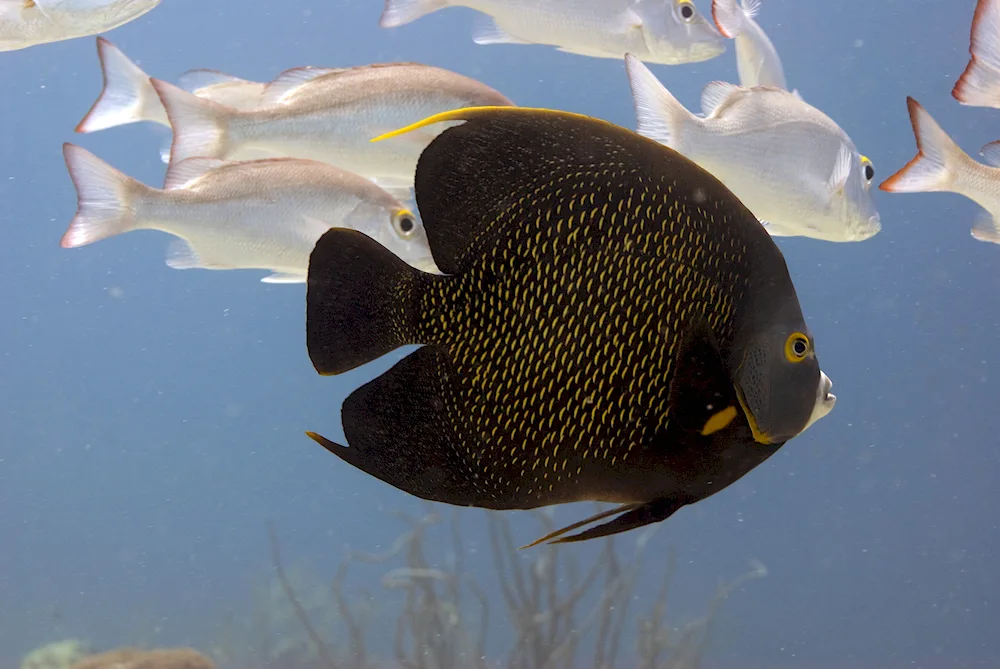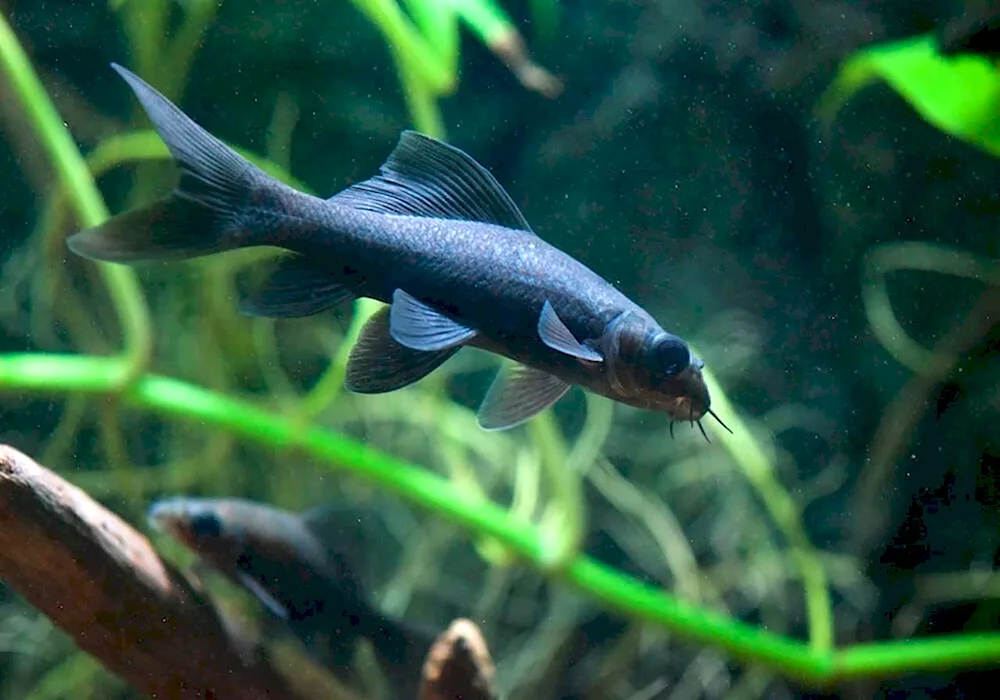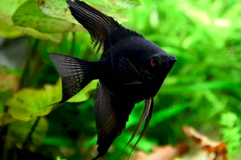 Black aquarium fish Various photos showcase striking black aquarium fish with shimmering scales and bright eyes, swimming gracefully in their underwater environment. These images capture the beauty and elegance of these unique aquatic creatures, making them a captivating addition to any fish tank.