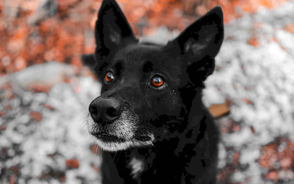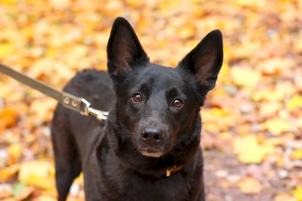 Black dog with pointed ears Photo 1: A sleek black canine with sharp, pointed ears standing proudly in a grassy field. Image 2: A close-up of a mysterious black dog with alert, pointed ears gazing off into the distance.