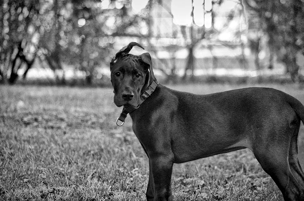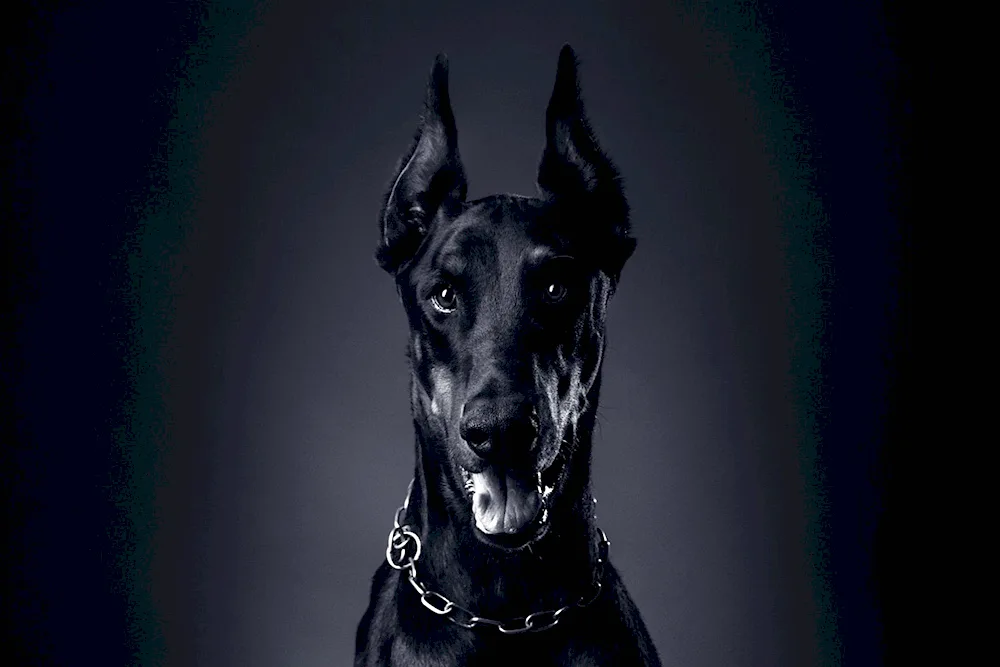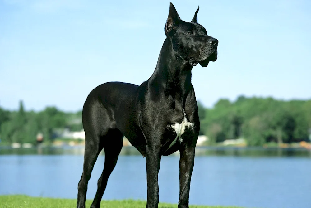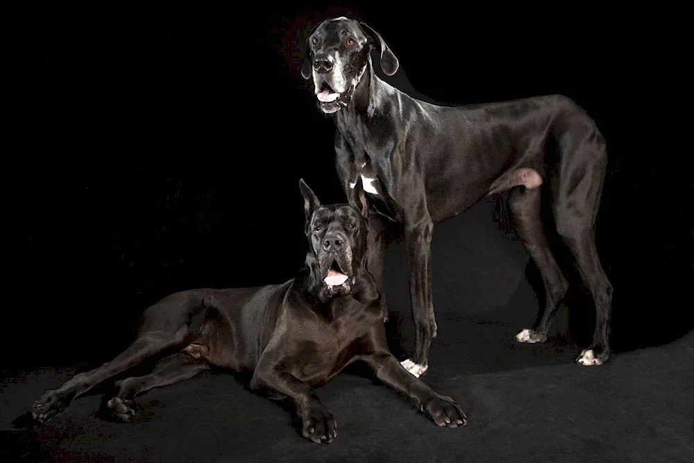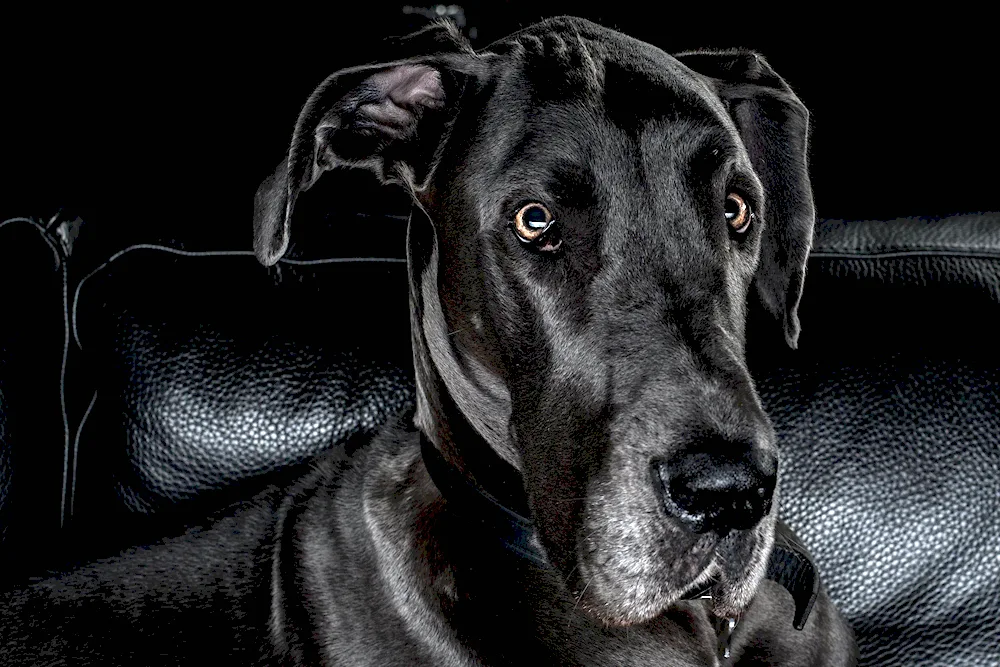 Photos of a majestic Black Great Dane standing proudly in a grassy field, showcasing its sleek coat and impressive stature. Images of a playful Black Great Dane interacting with children, highlighting their gentle and friendly nature. Close-up shots capturing the expressive eyes and unique features of a Black Great Dane, showcasing their beauty and grace.