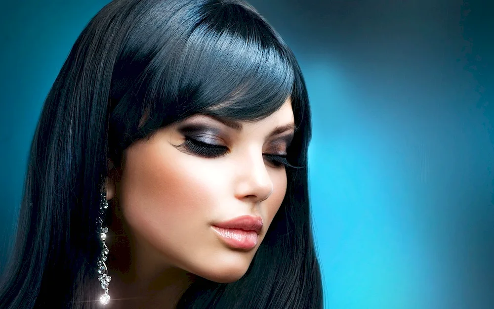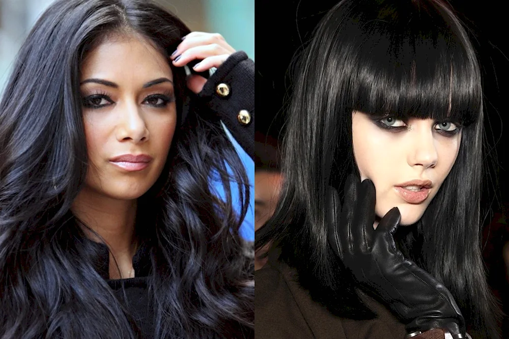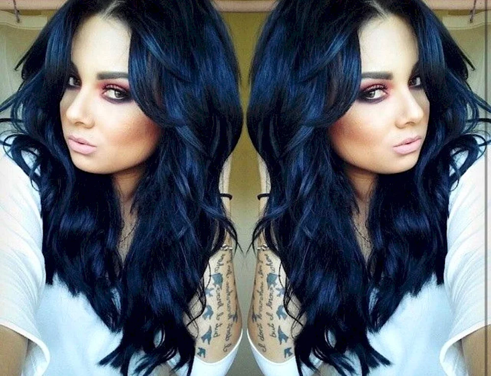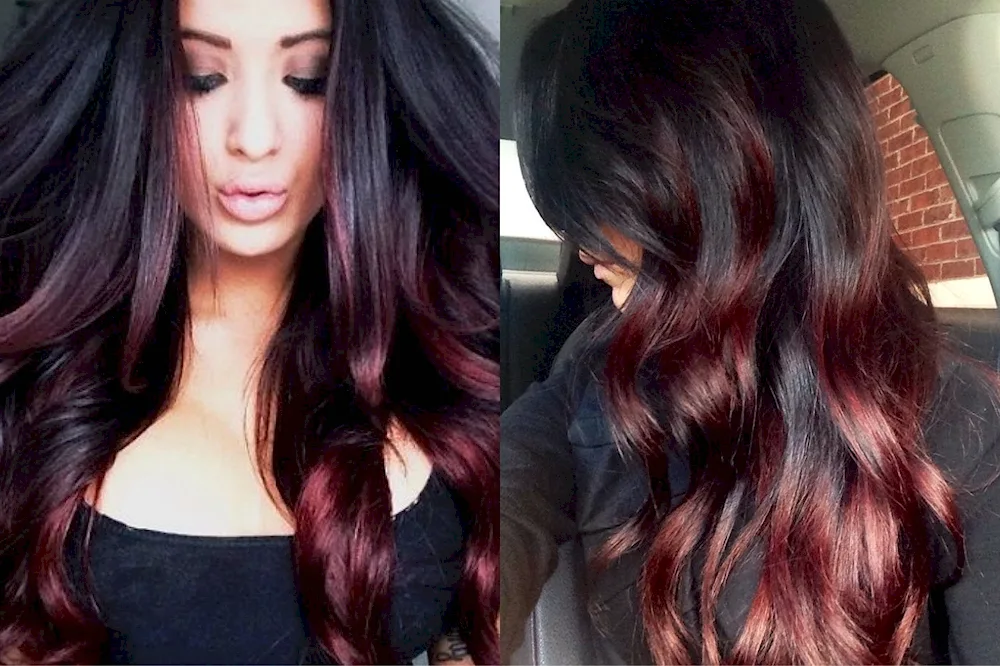Images of dark hair being colored with a vibrant blue dye, showcasing a dramatic and edgy transformation. Pictures of black hair being styled in intricate braids with pops of bright red highlights for a bold and unique look. Close-up shots of sleek black hair that has been dyed a rich plum color, adding depth and dimension to the hairstyle.