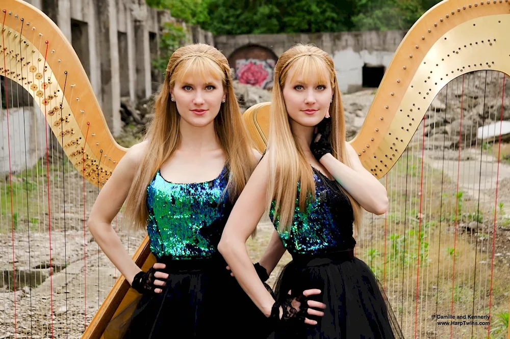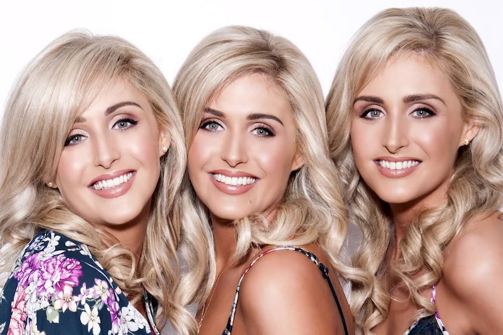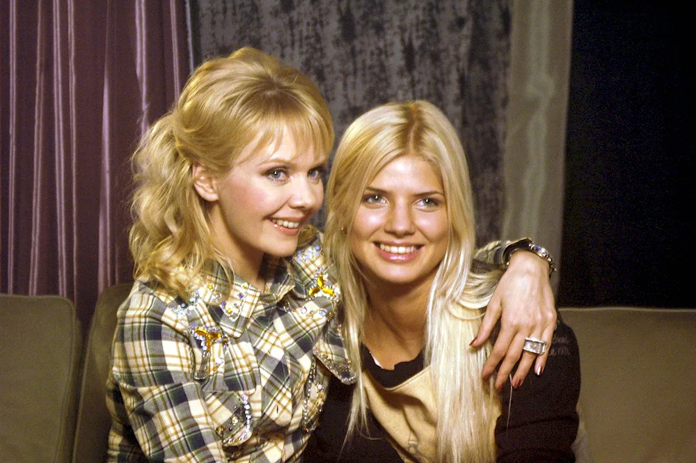 Blond-haired twins posing together in matching outfits, smiling brightly at the camera. The two sisters with similar features and hairstyles, looking like mirror images of each other.