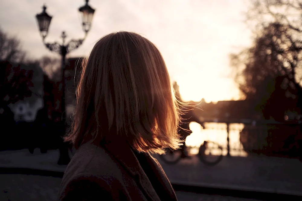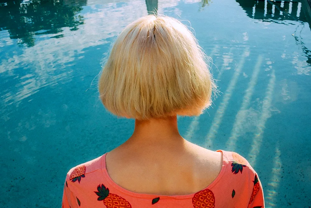 Blonde with a bob without a face  Blond woman with a bob hairstyle captured from behind, her face out of frame. The focus is on the elegant and timeless silhouette of the hair and neck.
