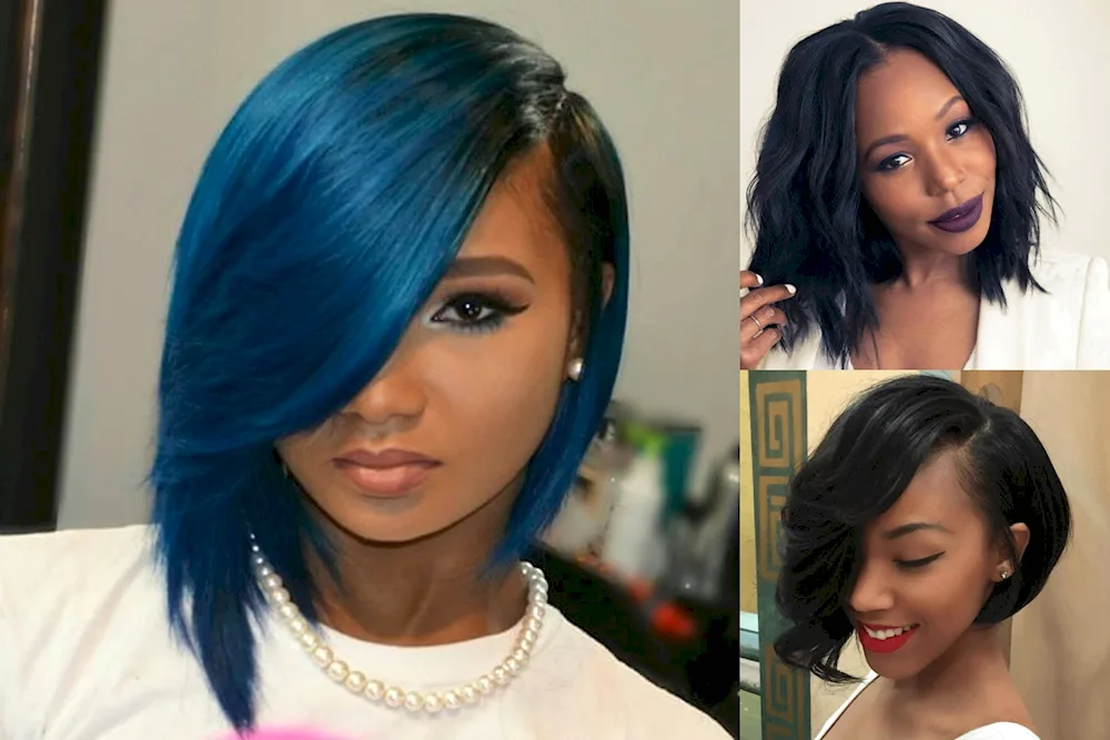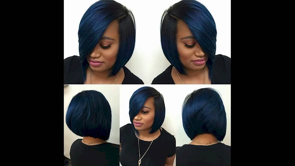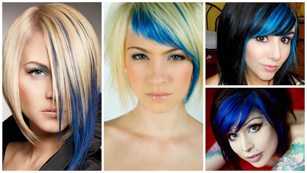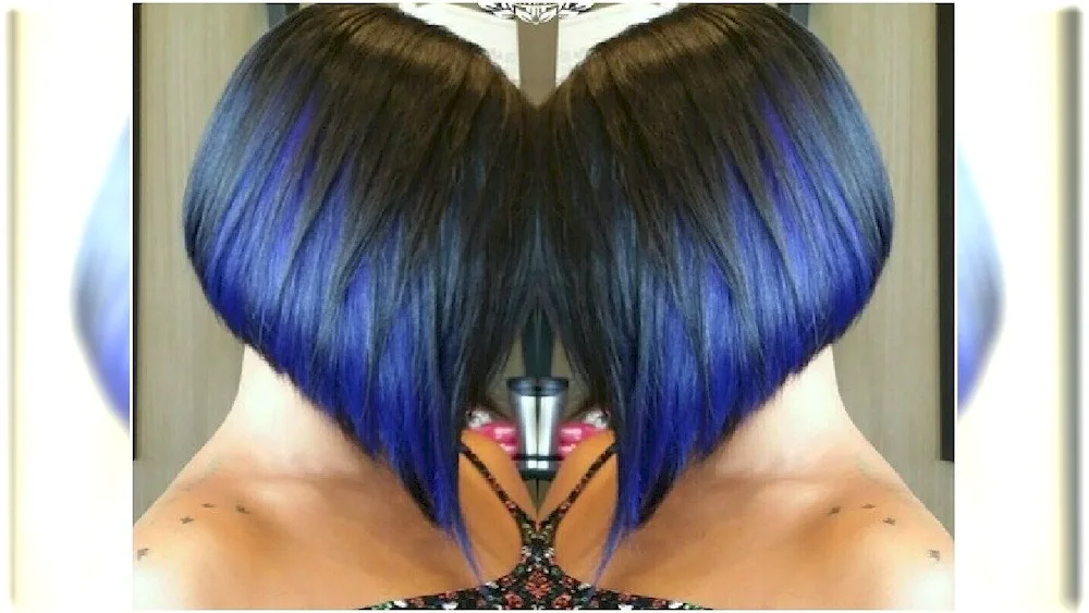 Blue highlights on dark bob hair Examples of blue streaks on a sleek dark bob hair cut, showcasing a modern and edgy look. The vivid blue accents add a pop of color and personality to the classic bob hairstyle.