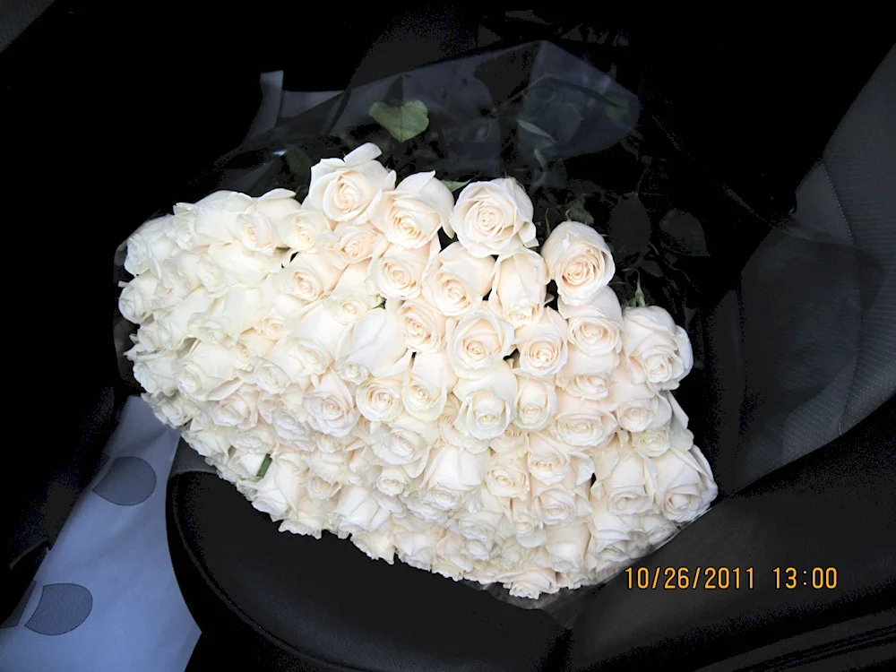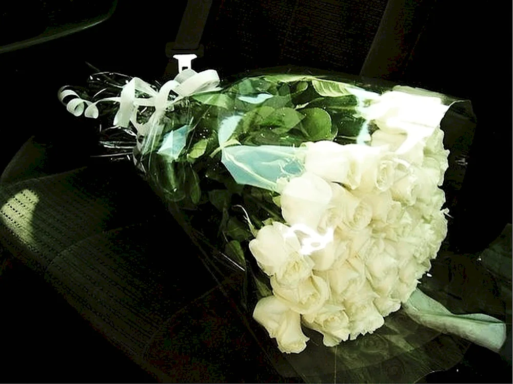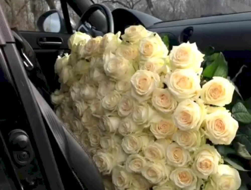 Bouquet of white roses in the car
