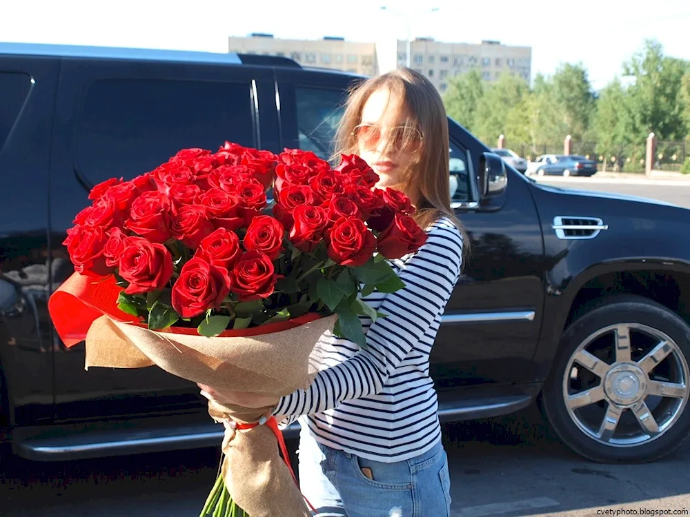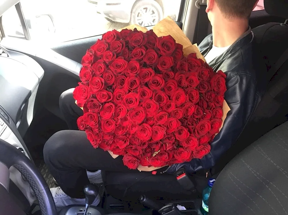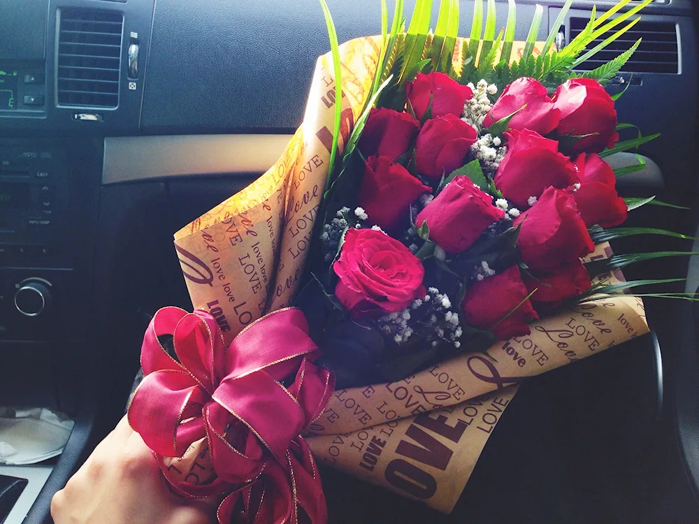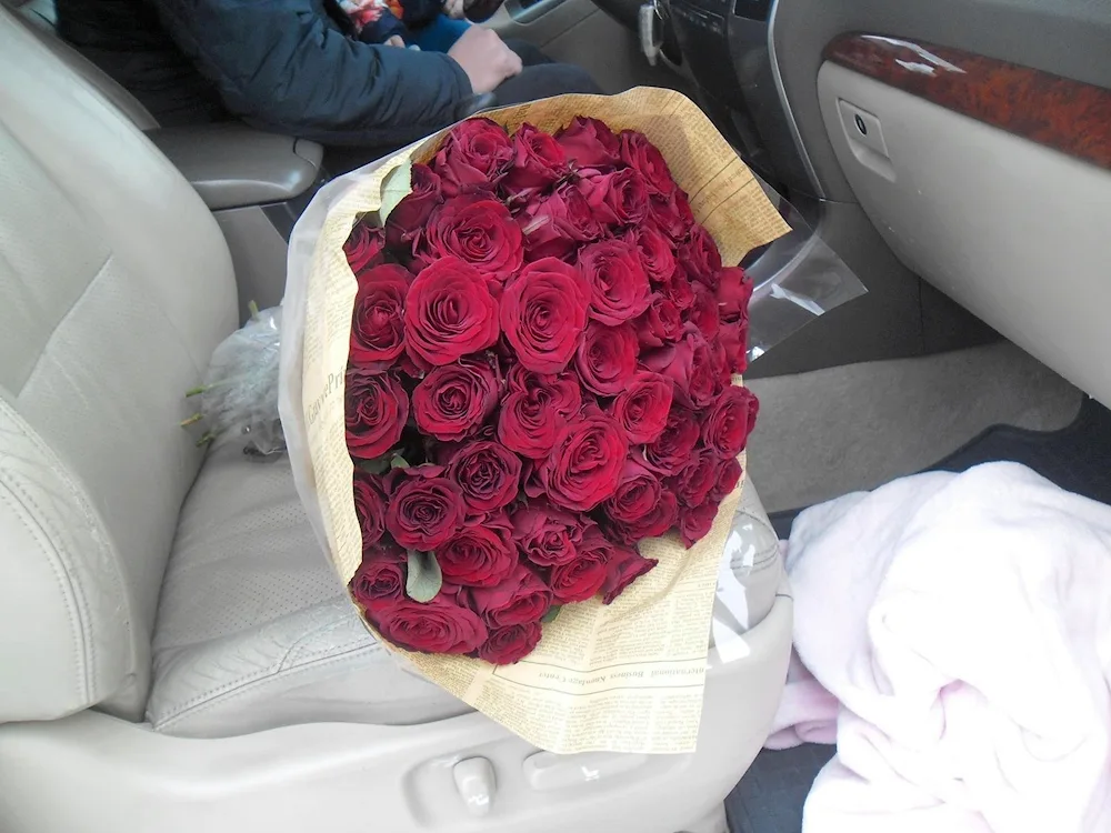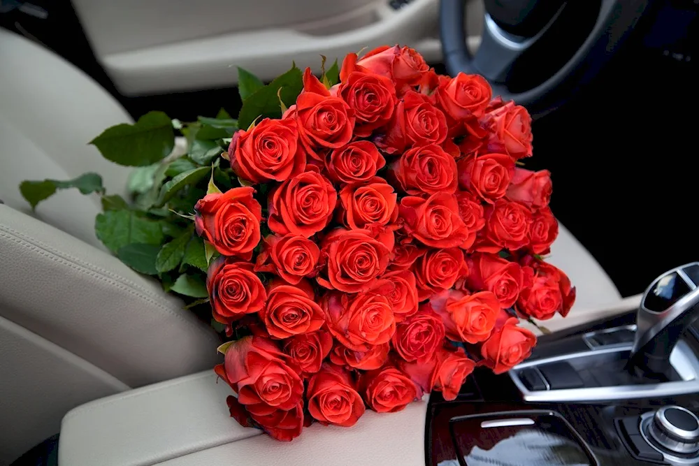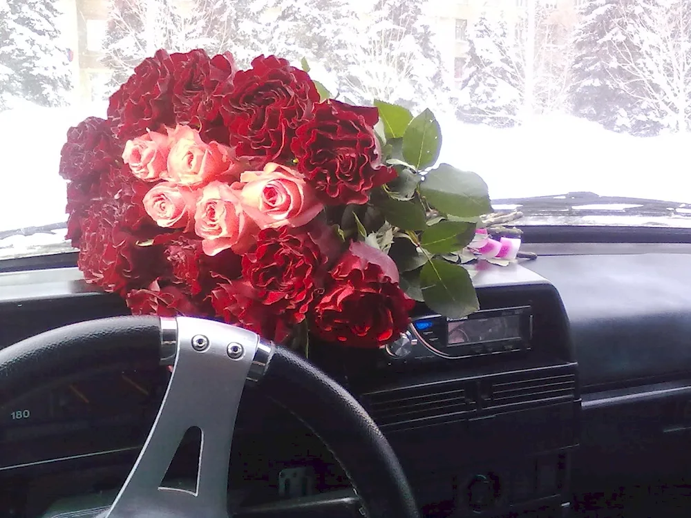 Bouquet of roses in the car