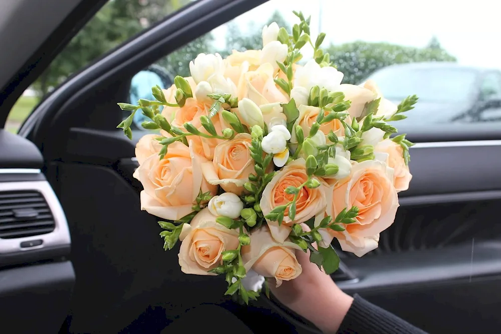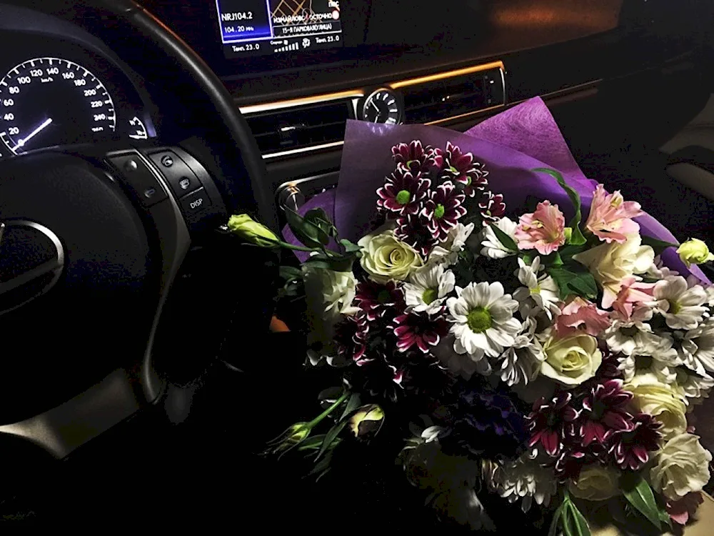 Bouquet of flowers in the car