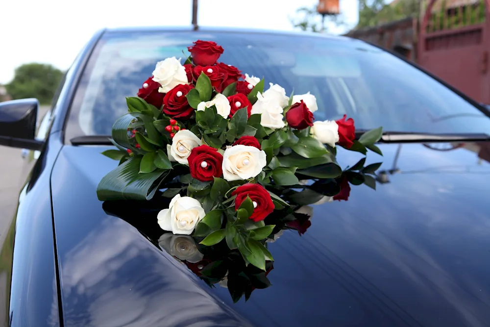 A bunch of flowers on the bonnet of the car