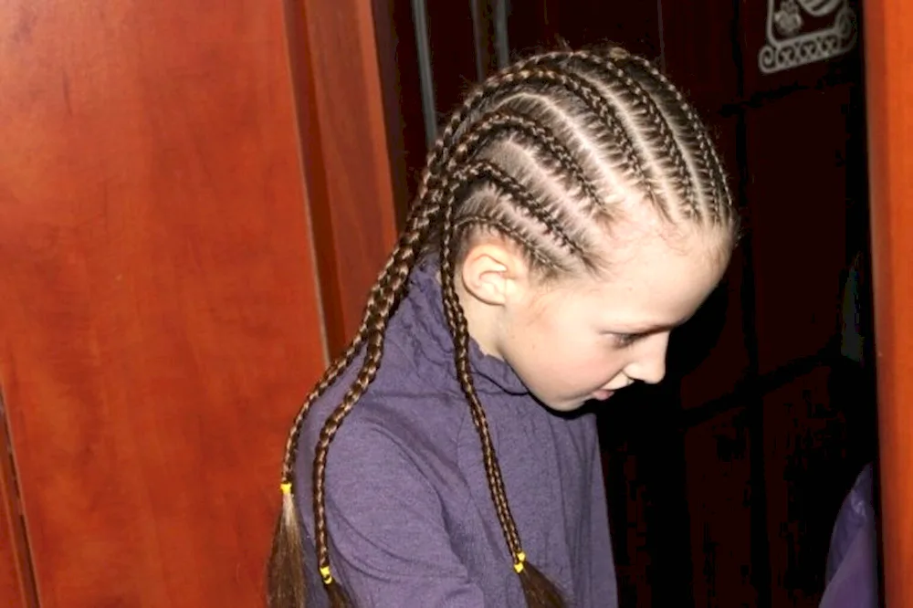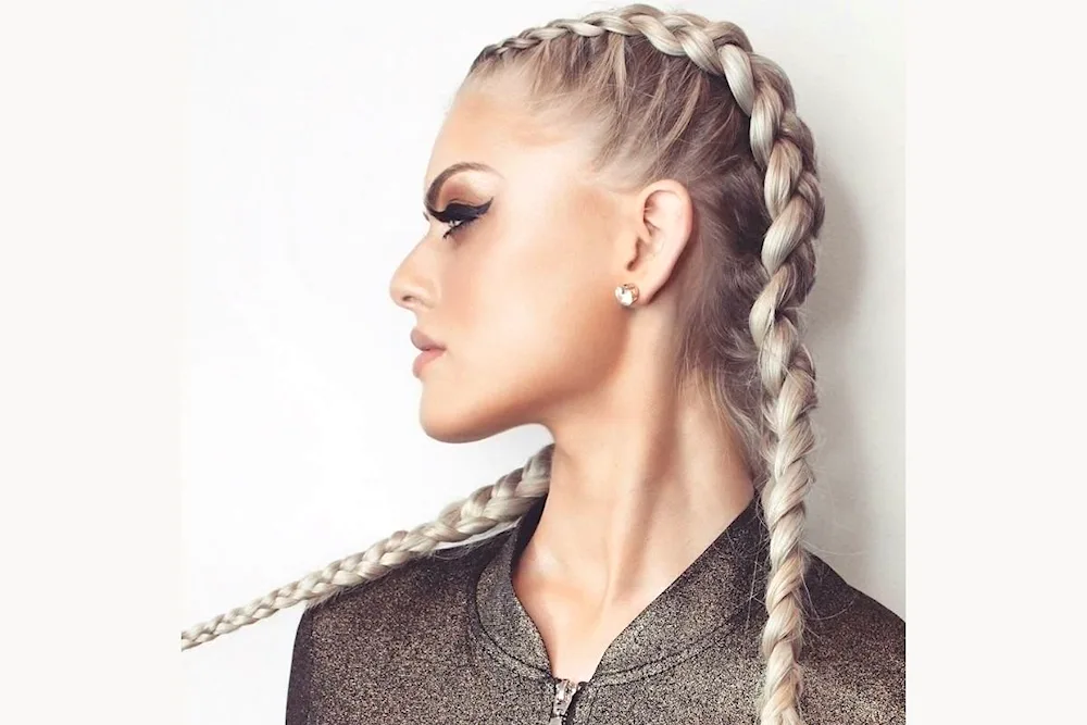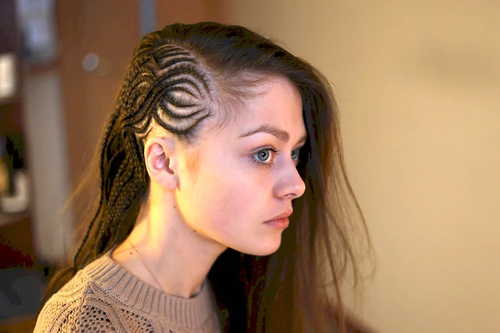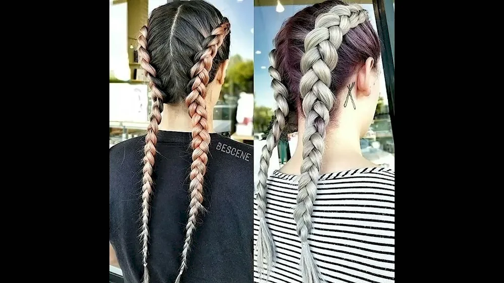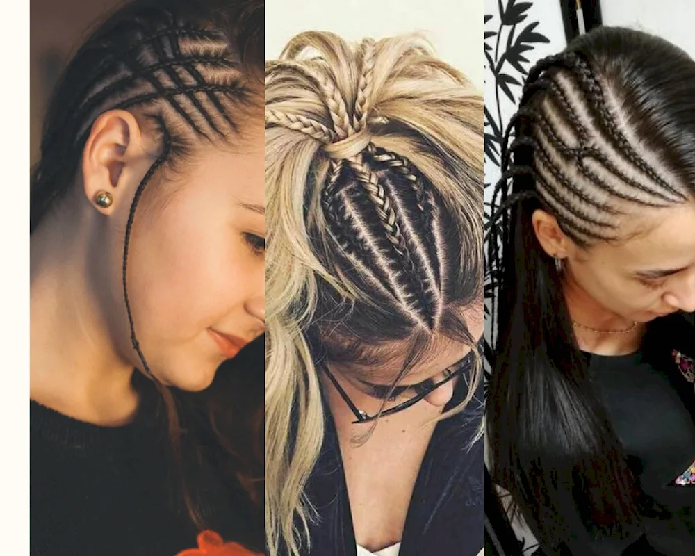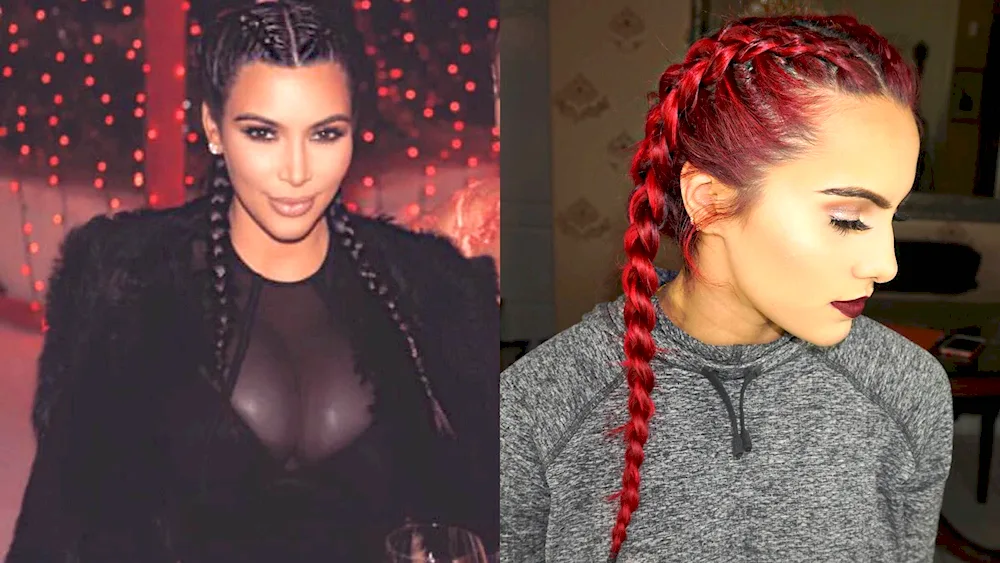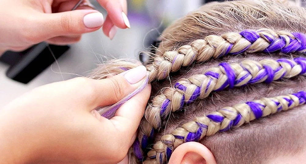 Photos of intricate braids with kanekalon extensions woven into someone's hair at the temple, creating a striking and unique hairstyle. The images showcase the beautiful and detailed craftsmanship of the braids, perfect for anyone looking for a bold and stylish hair look.
