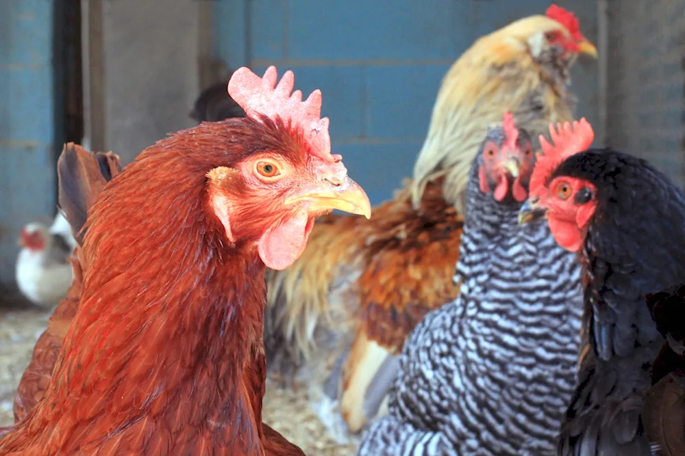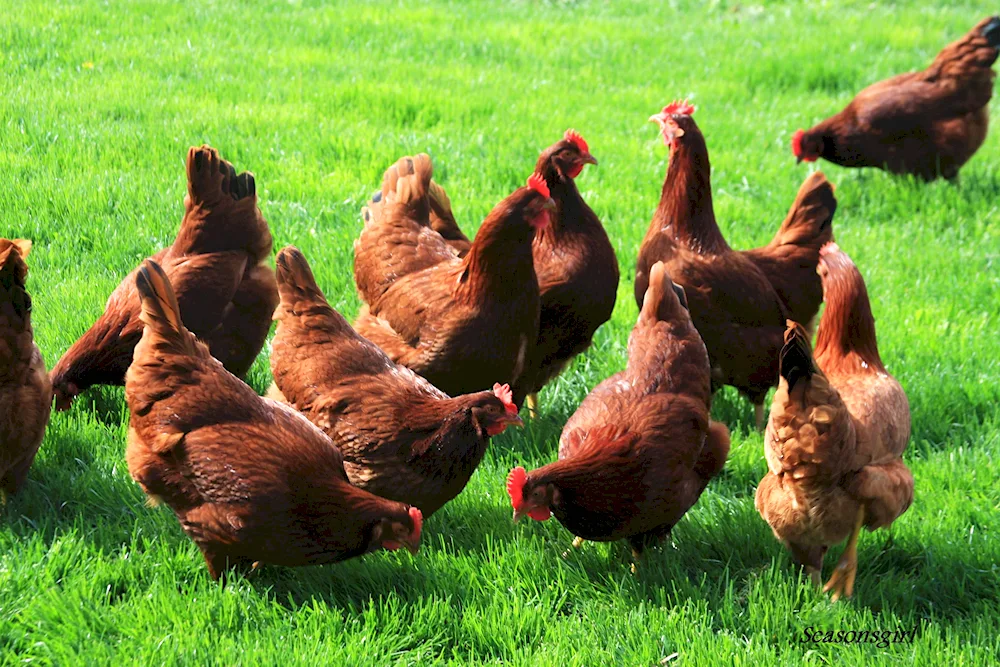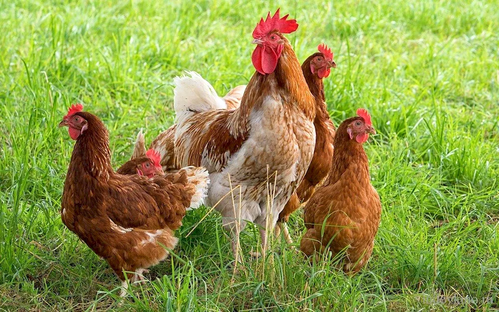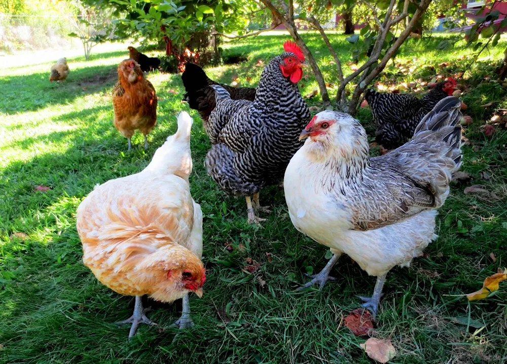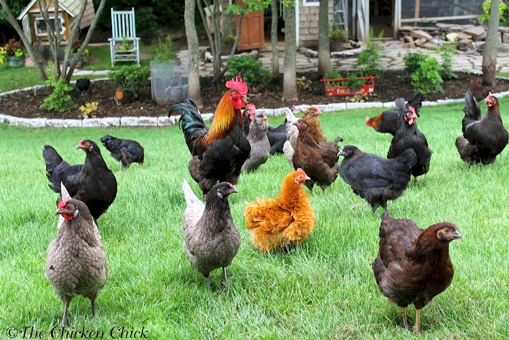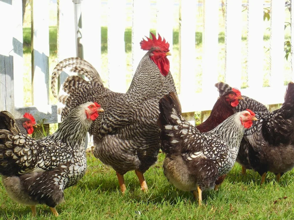 Different types of laying hens are shown in the selection of photos, showcasing various breeds like Rhode Island Reds, Leghorns, and Australorps. Each image highlights the unique characteristics and colors of these poultry breeds, perfect for anyone interested in raising backyard chickens.