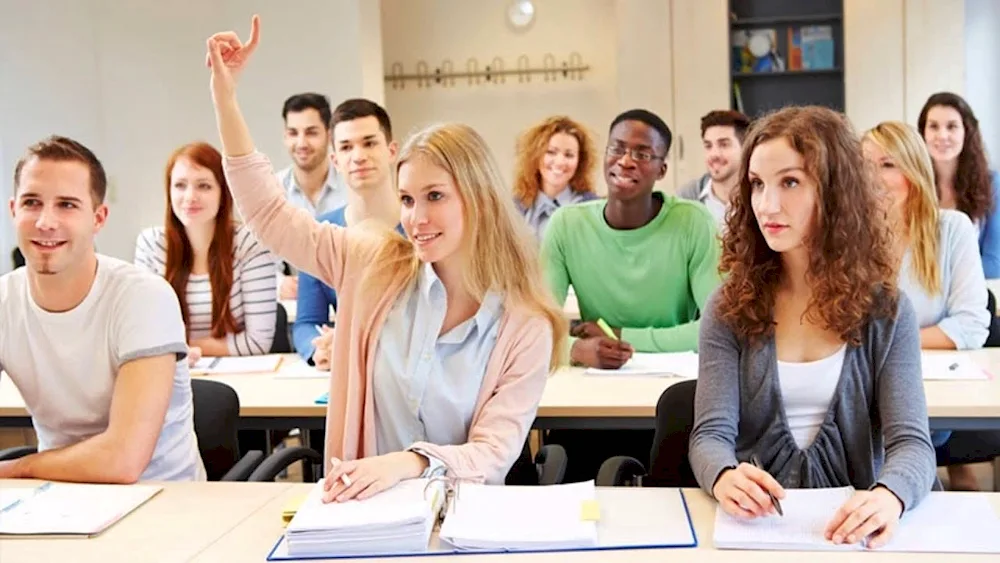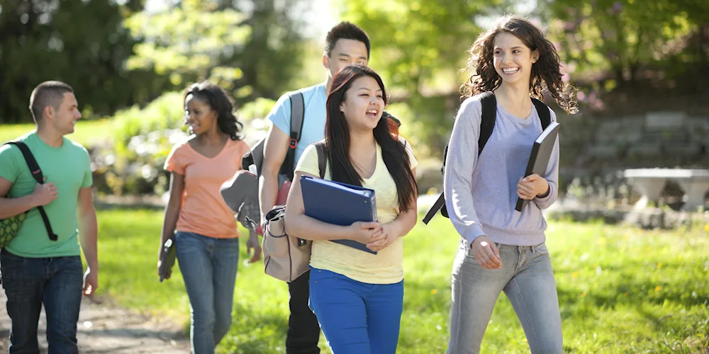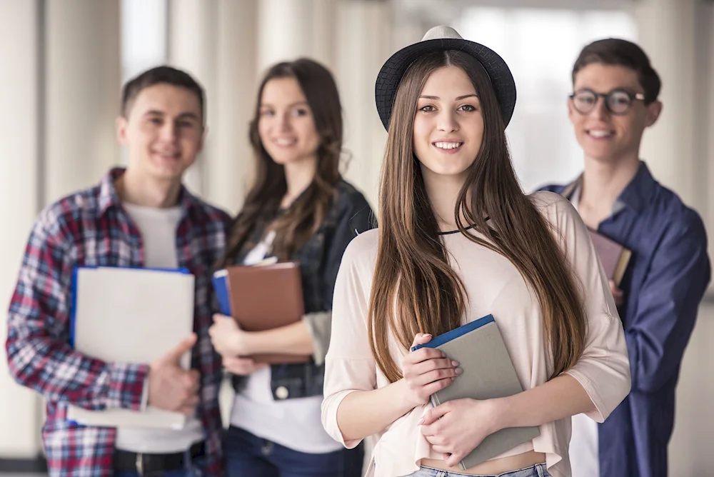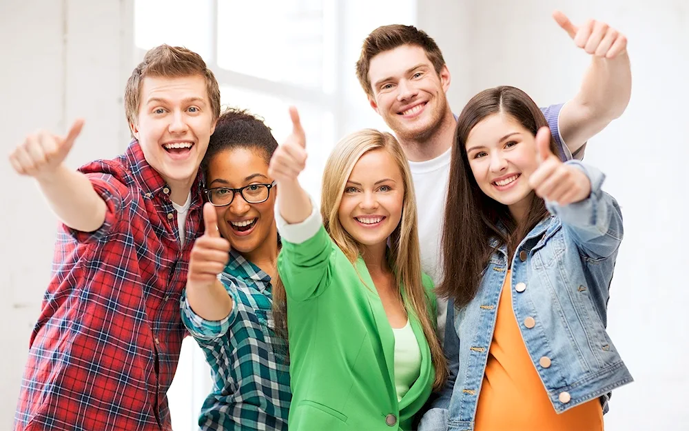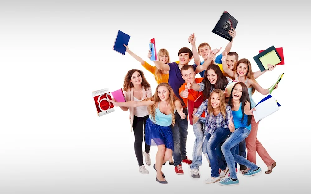 Cheerful students  Photos of happy young learners laughing and high-fiving each other after a successful project presentation at school. Images showing students with big smiles on their faces while working together on a group assignment in a bright and colorful classroom.