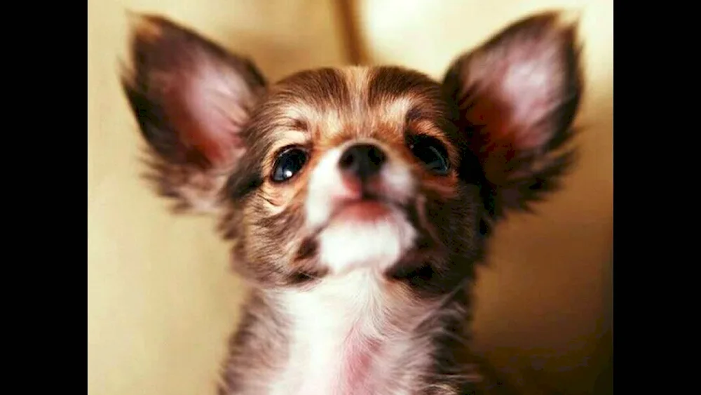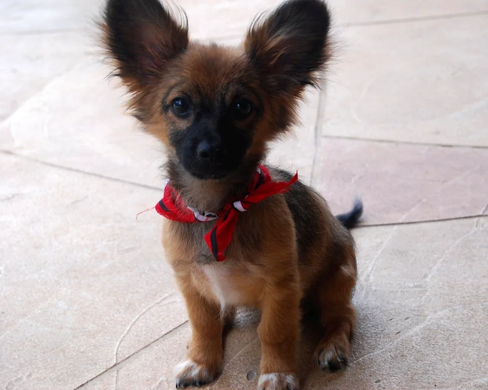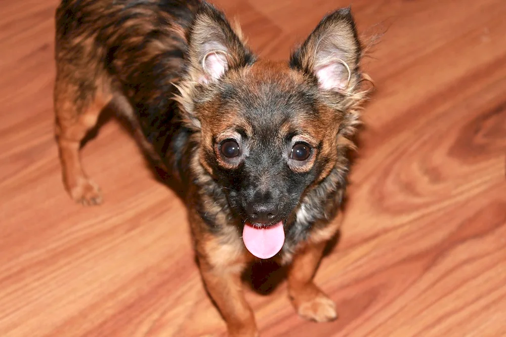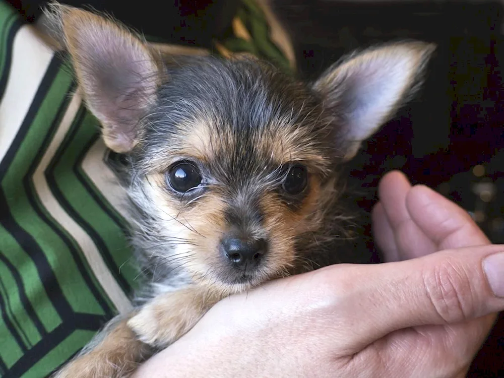 Chihuahua mix Chihuahua crossbreed: A cute fluffy pup with big floppy ears and big expressive eyes sitting on a cozy blanket. A small dog with a mix of Chihuahua traits playing with a toy in a sunny garden.