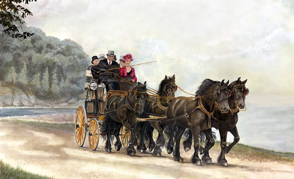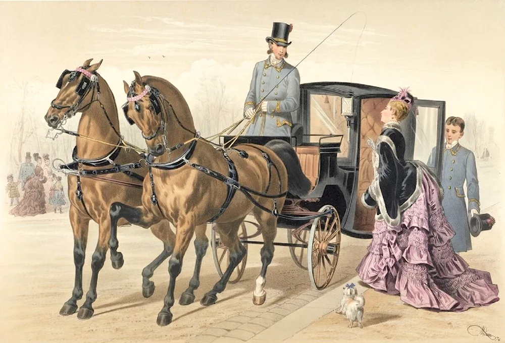Selection of images featuring coachmen in traditional attire, driving horse-drawn carriages through city streets. These pictures capture the elegance and nostalgia of a bygone era, with the coachmen skillfully guiding their carriages through bustling urban landscapes.