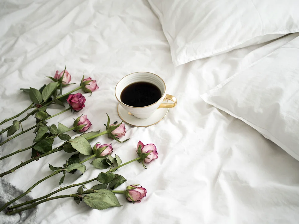 Coffee and flowers in bed Enjoy a cozy morning with these lovely photos of a delicious cup of coffee and beautiful flowers in bed. Treat yourself to a relaxing moment surrounded by warmth and beauty.