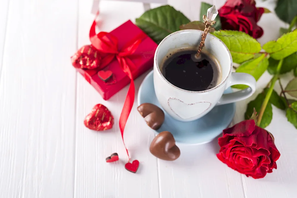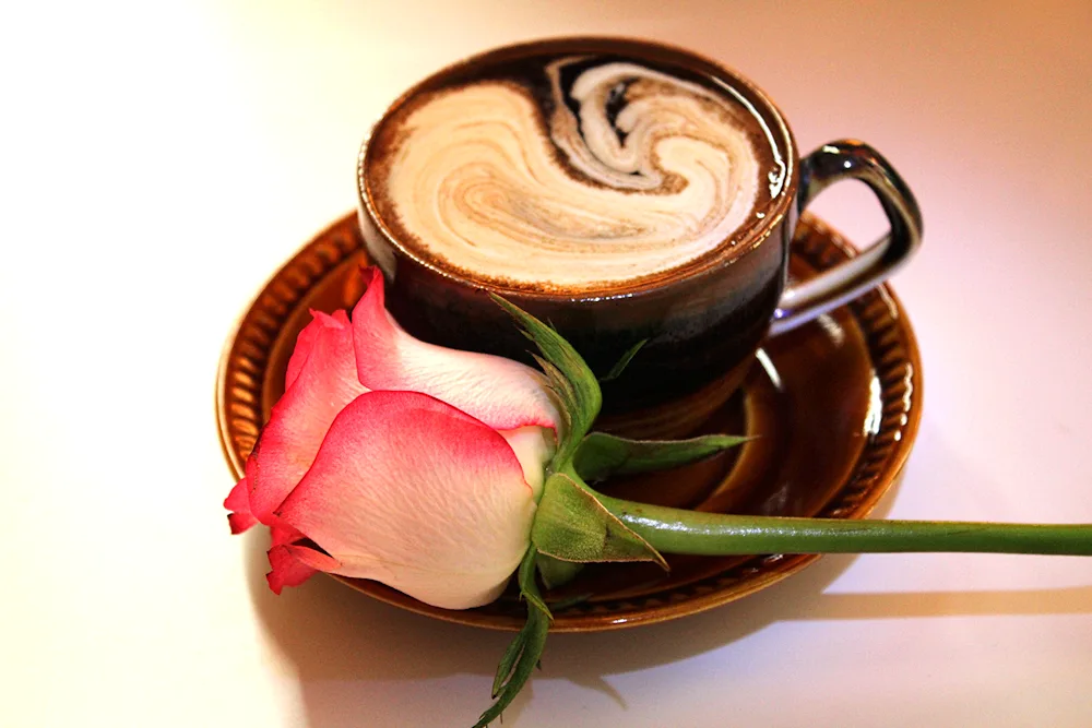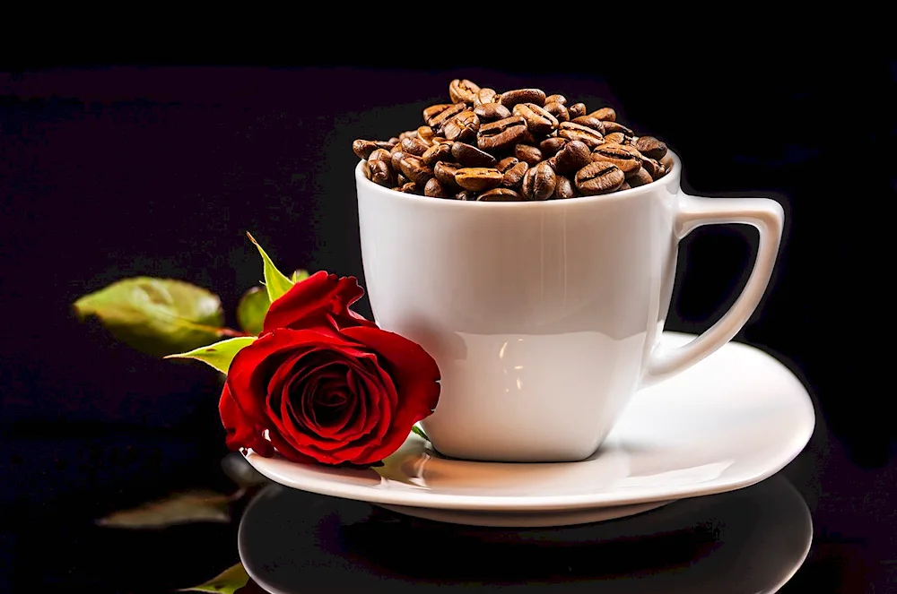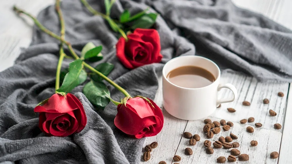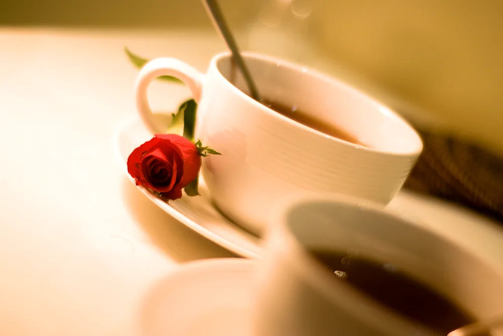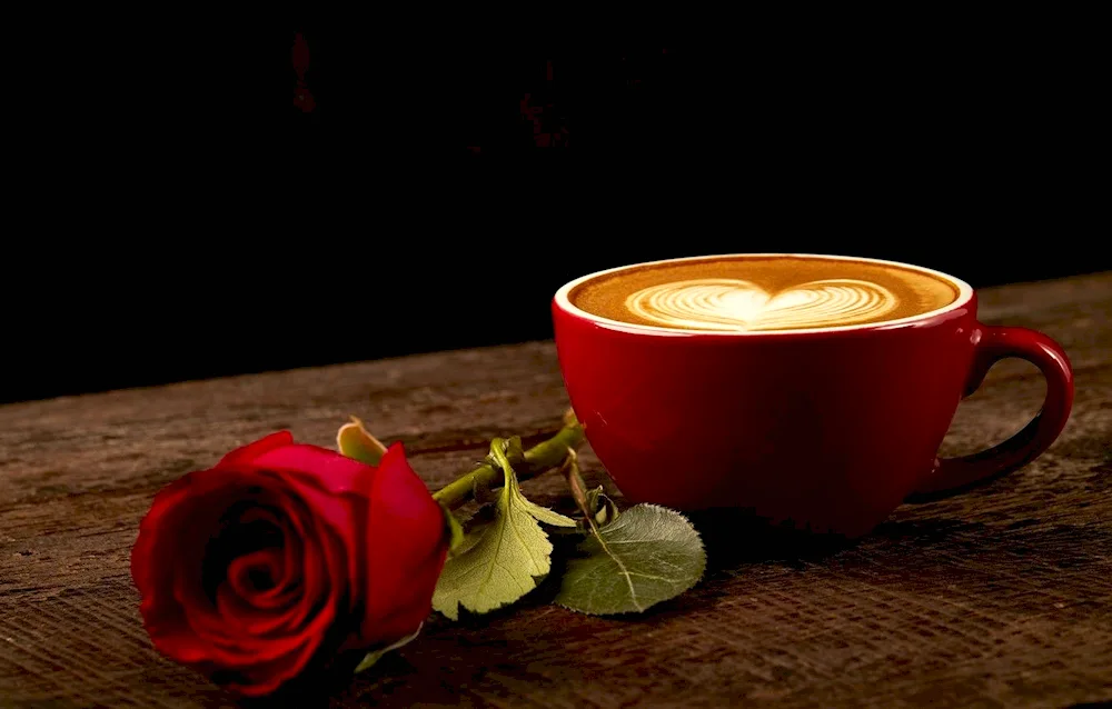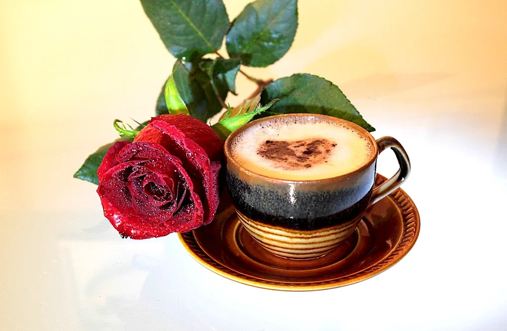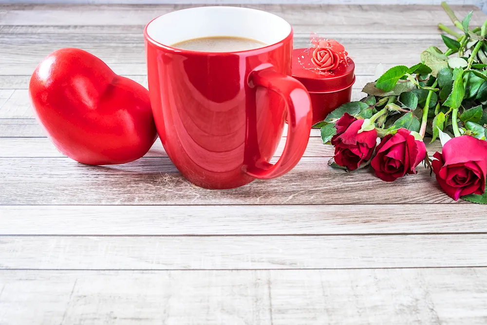 Photos of beautiful red roses nestled next to steaming cups of coffee on a cozy table in a sunlit cafe, creating a romantic and inviting atmosphere perfect for a relaxing afternoon date with your significant other or close friend. The contrast of the vibrant petals against the dark liquid in the cups adds a visually pleasing element to the scene, making it a perfect setting for a moment of connection and warmth.