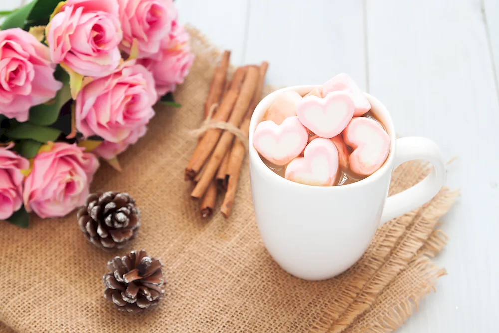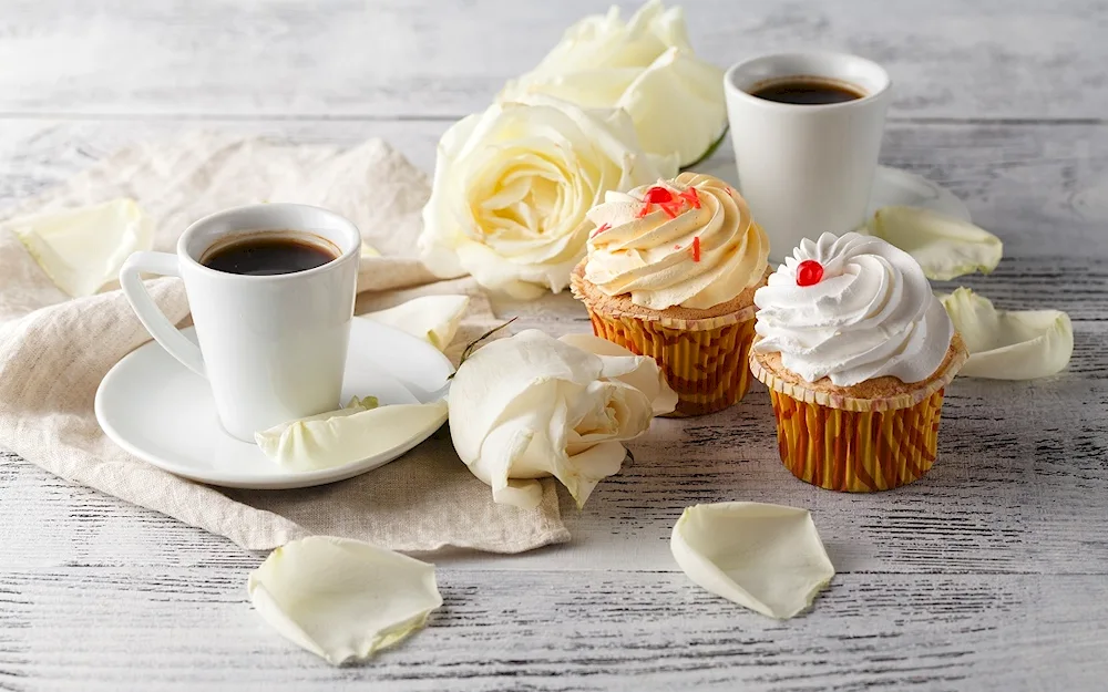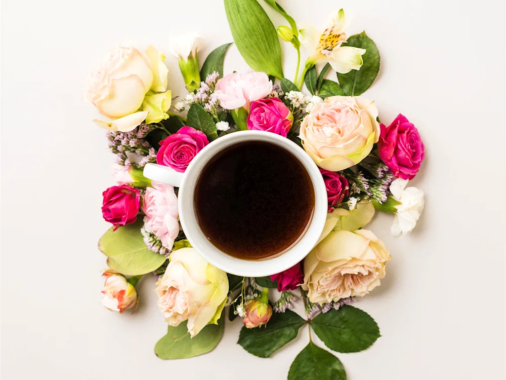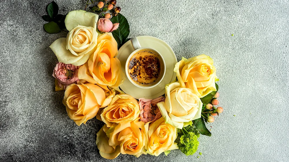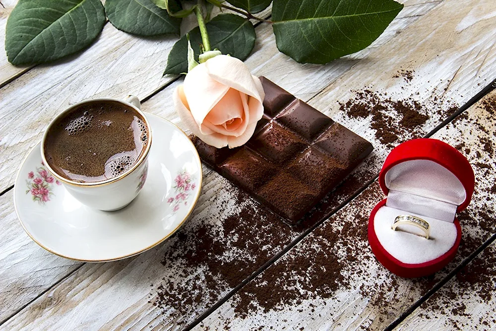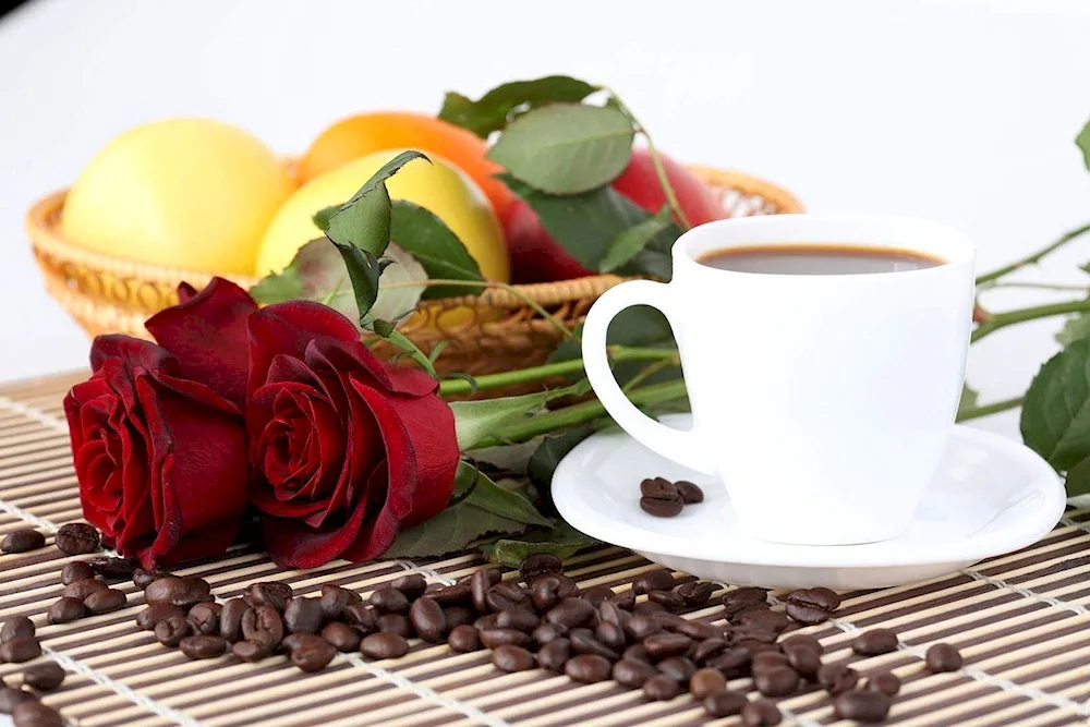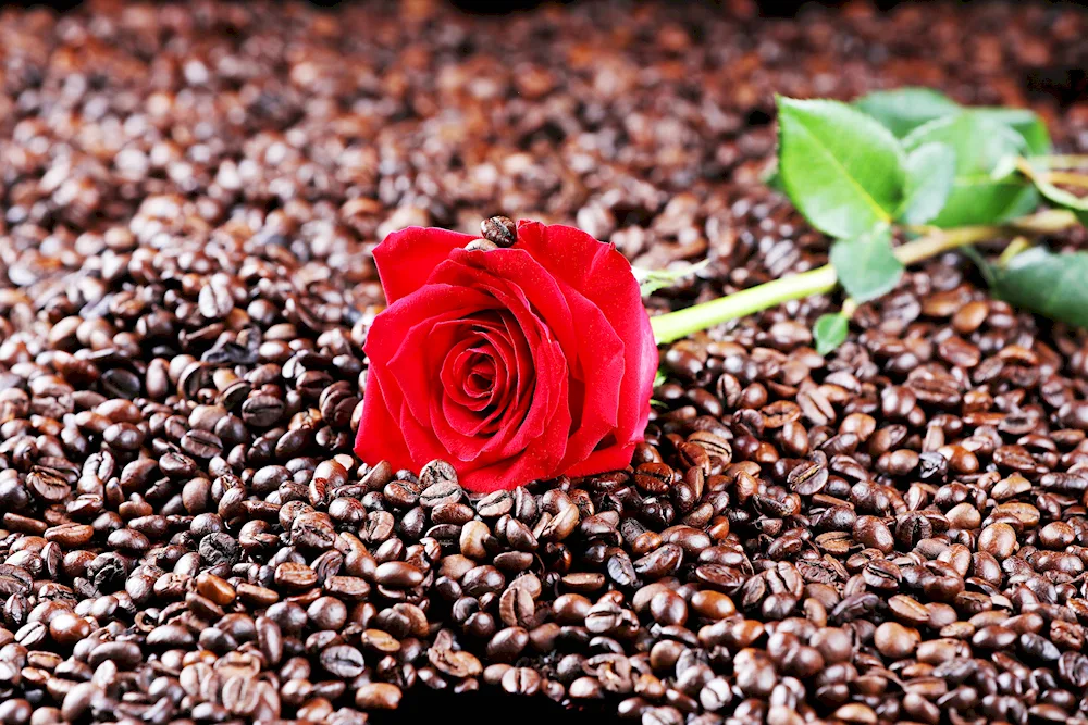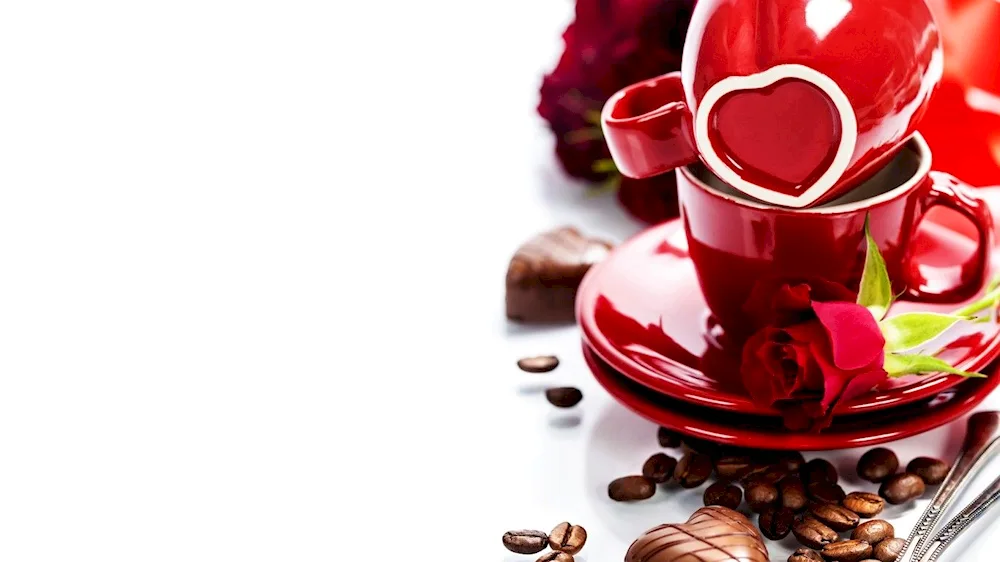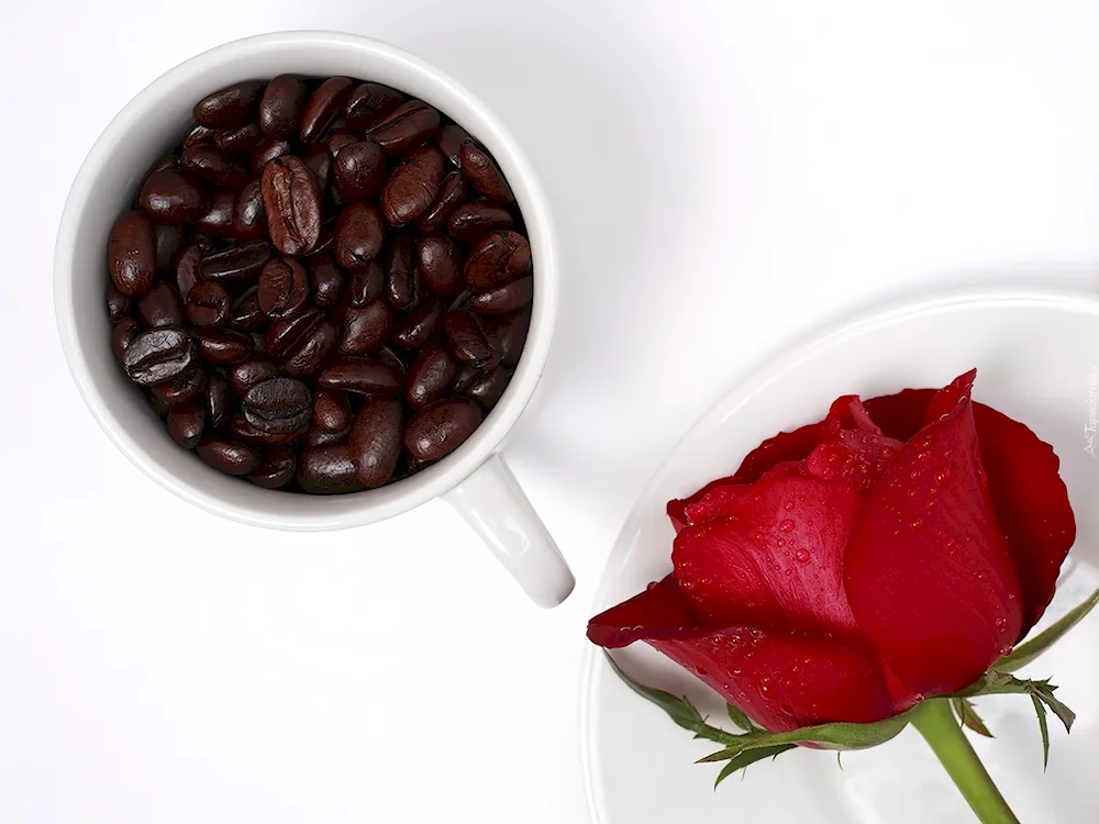 Photos of beautiful red roses nestled next to steaming cups of coffee on a cozy table in a sunlit cafe, creating a romantic and inviting atmosphere perfect for a relaxing afternoon date with your significant other or close friend. The contrast of the vibrant petals against the dark liquid in the cups adds a visually pleasing element to the scene, making it a perfect setting for a moment of connection and warmth.