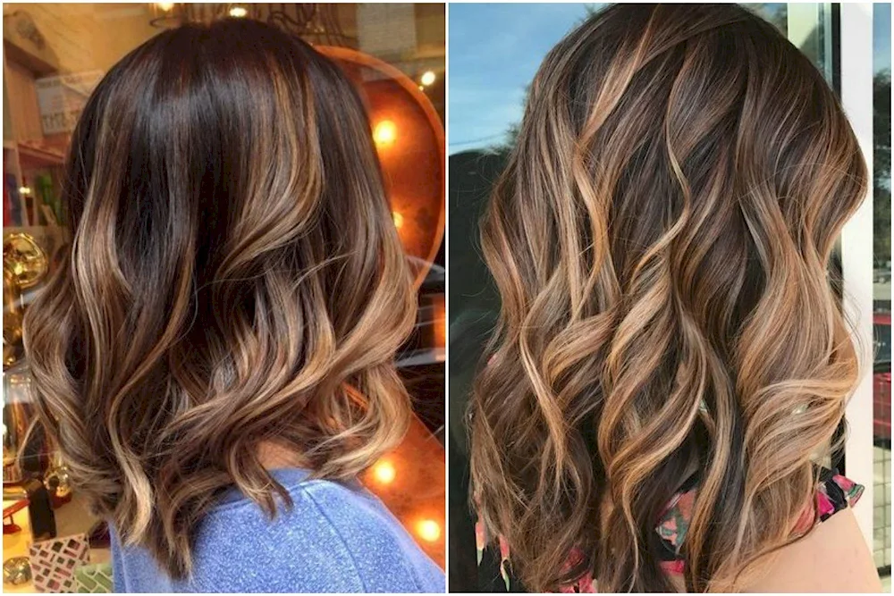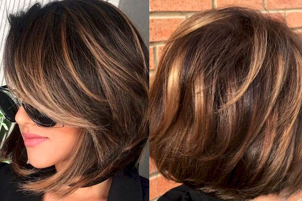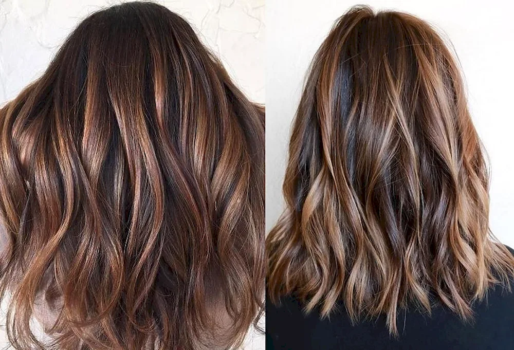 1. Stunning brunette highlights on shoulder-length hair, adding depth and dimension. 2. Rich chocolate tones complementing dark medium-length hair for a beautiful, natural look. 3. Subtle caramel balayage on dark hair, creating a soft and elegant style.
