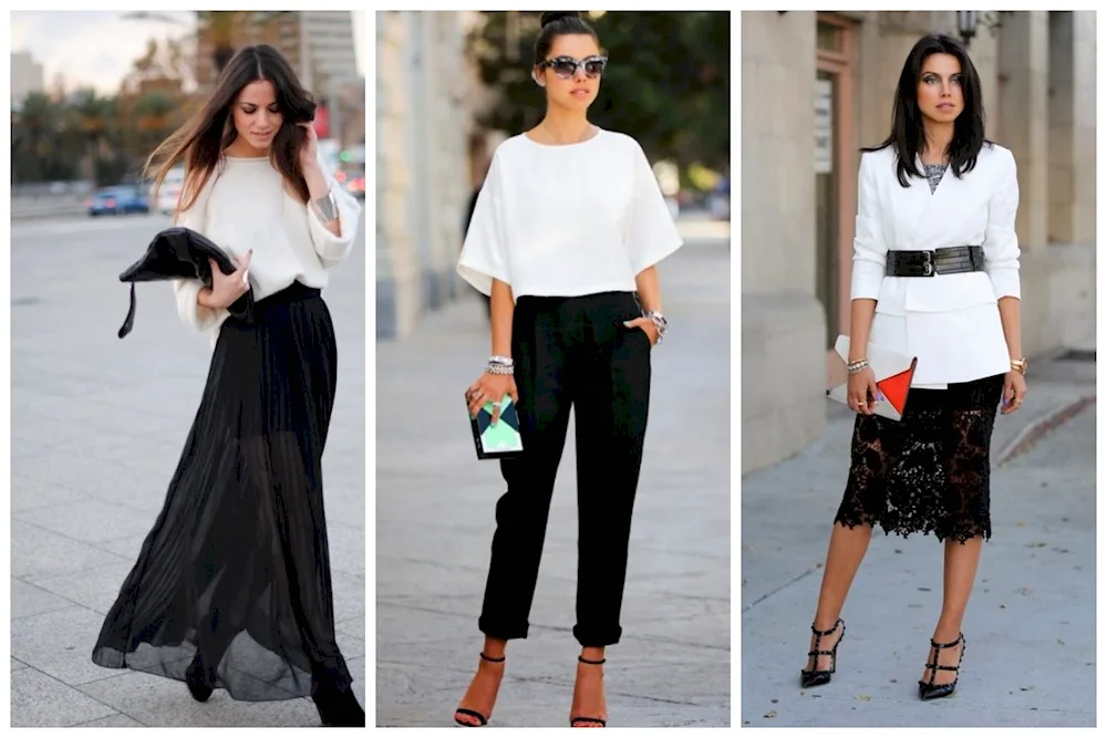 Photos of black and white outfits showcasing a unique style with white tops and black bottoms, perfect for a bold and sophisticated look. These images feature various combinations such as white blouses paired with black skirts or black pants for a sleek and modern aesthetic.