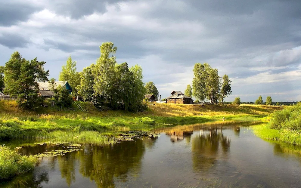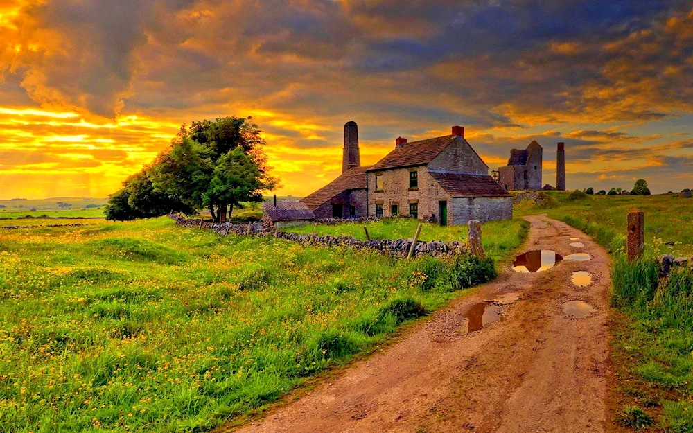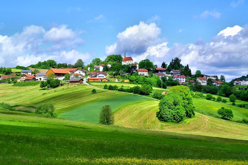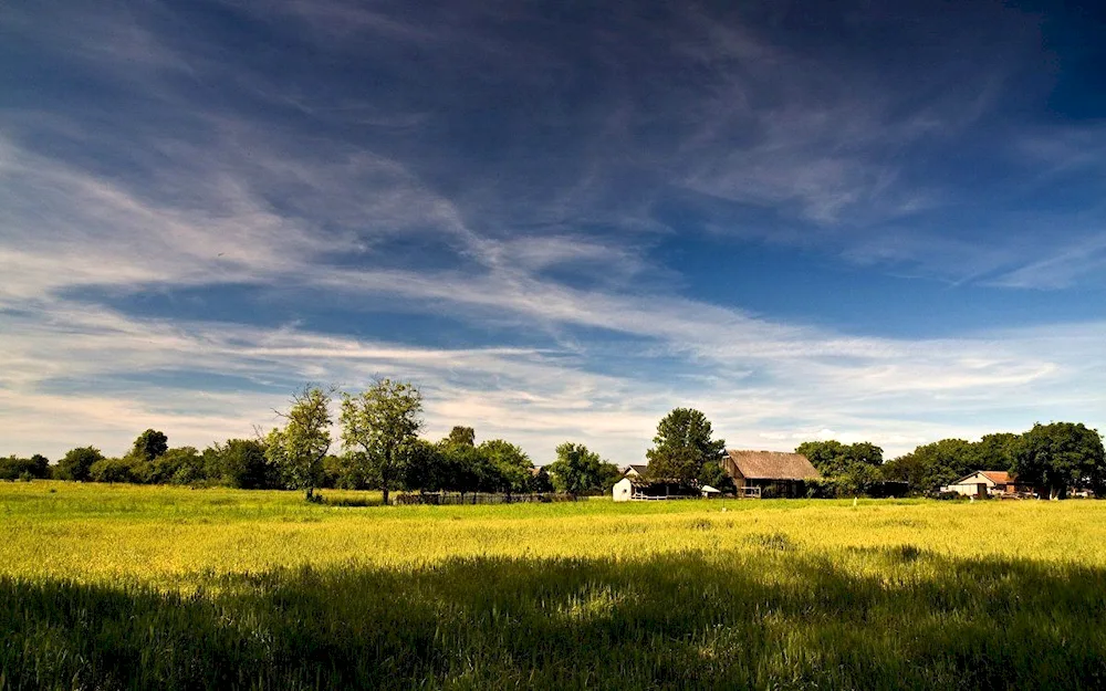 Countryside views captured through the lens: rolling green hills under a clear blue sky, a secluded farm nestled among trees, a peaceful stream winding through meadows. These images will transport you to a serene and tranquil rural setting, perfect for escaping the hustle and bustle of city life.