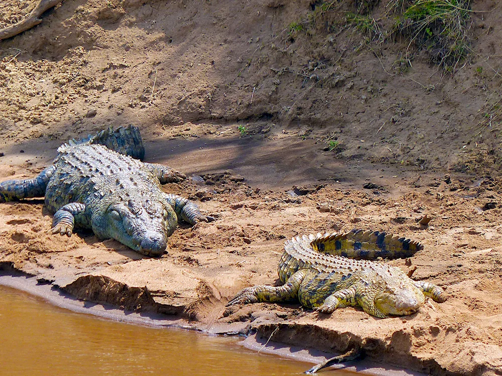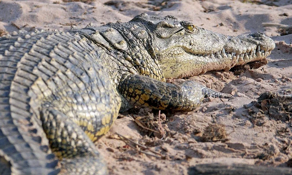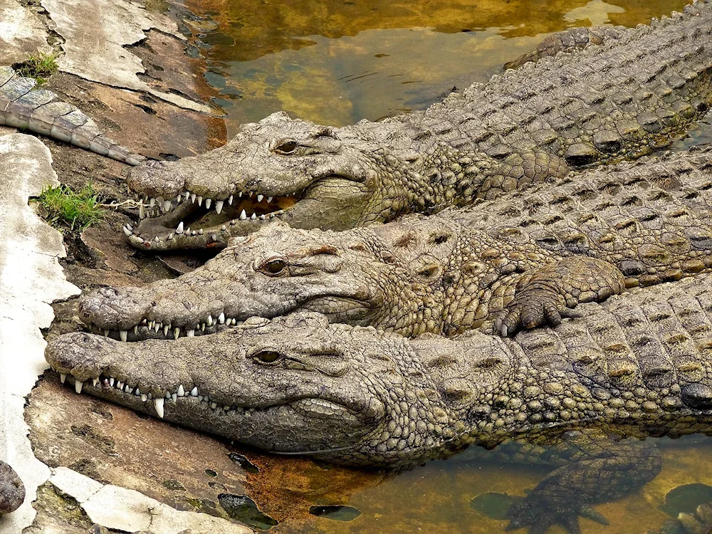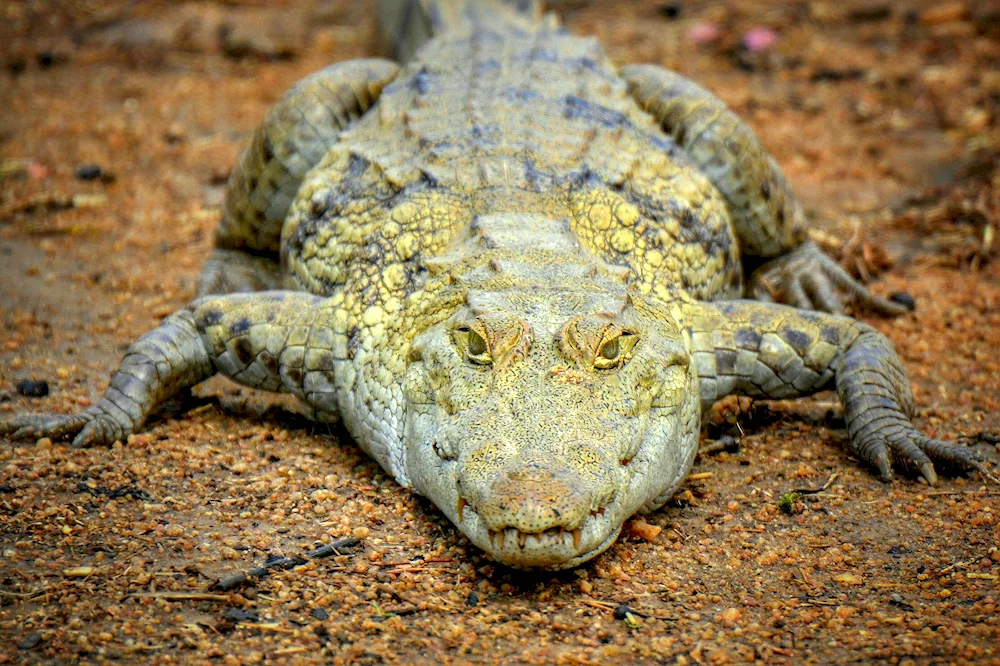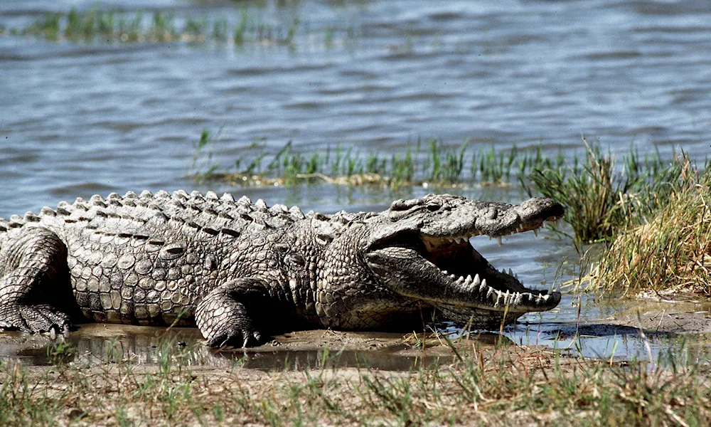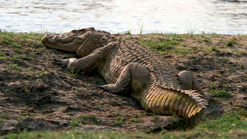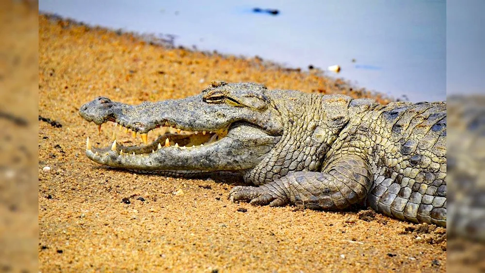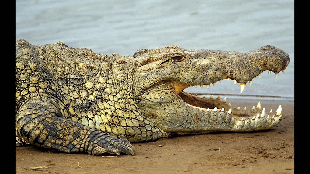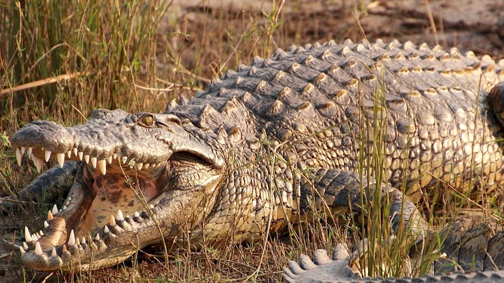 A fierce crocodile basking in the sun on a riverbank in Africa, with its sharp teeth and scaly skin on full display. Another photo shows a massive crocodile gliding through murky waters, blending in perfectly with its natural habitat in the wilds of Africa.