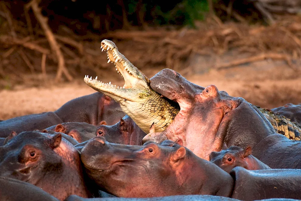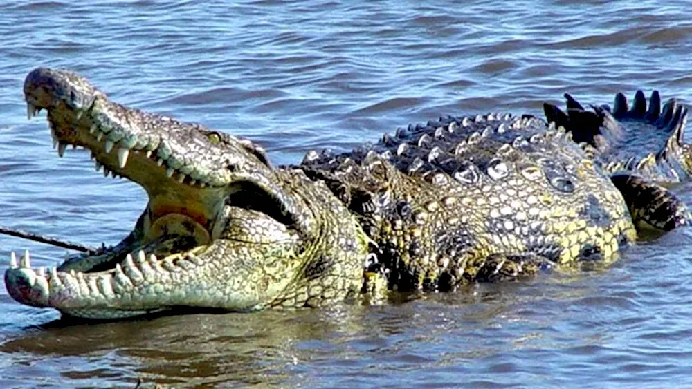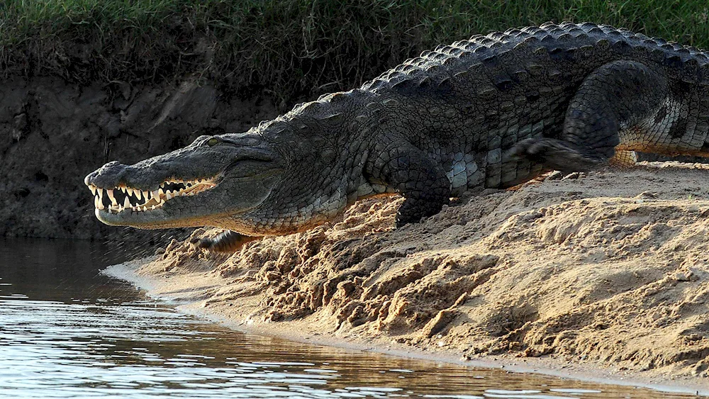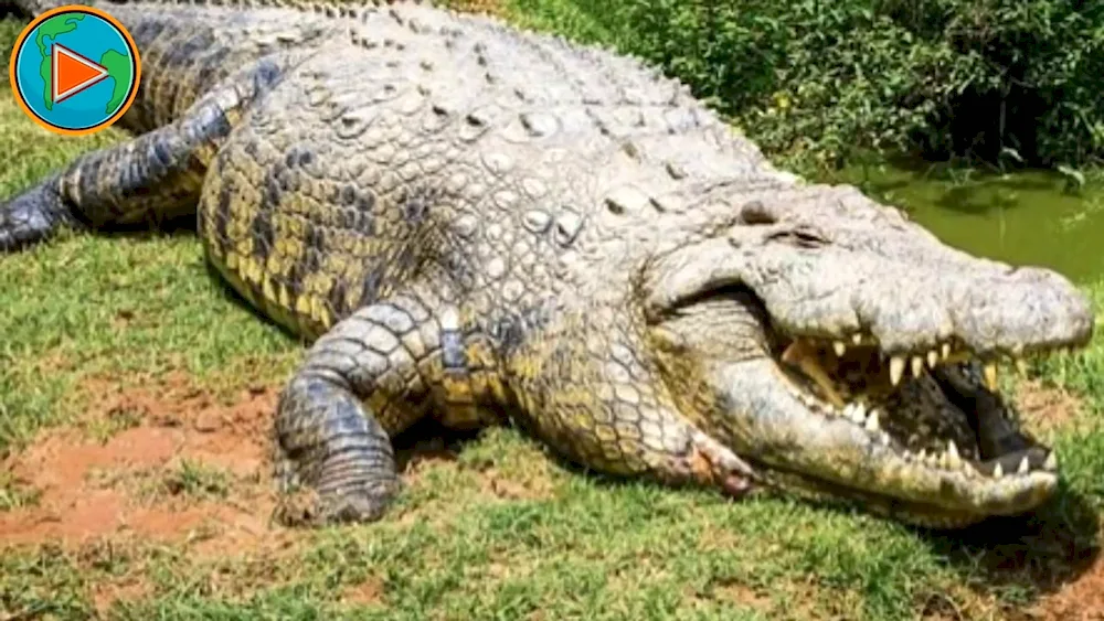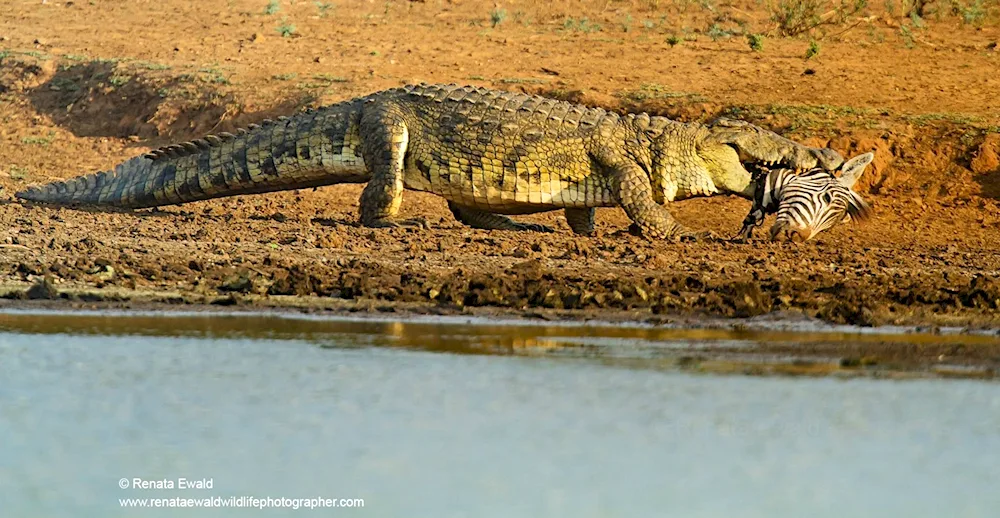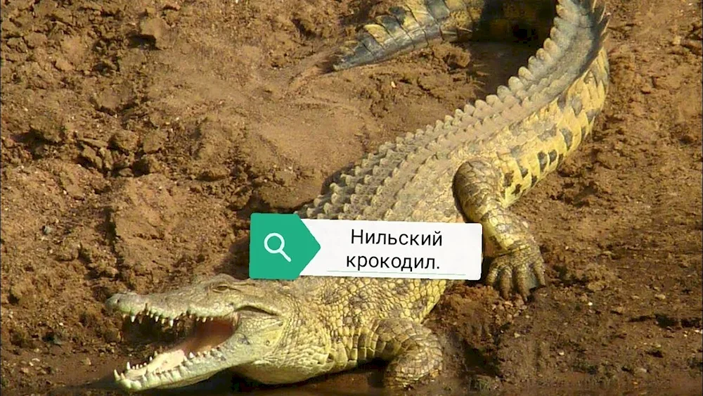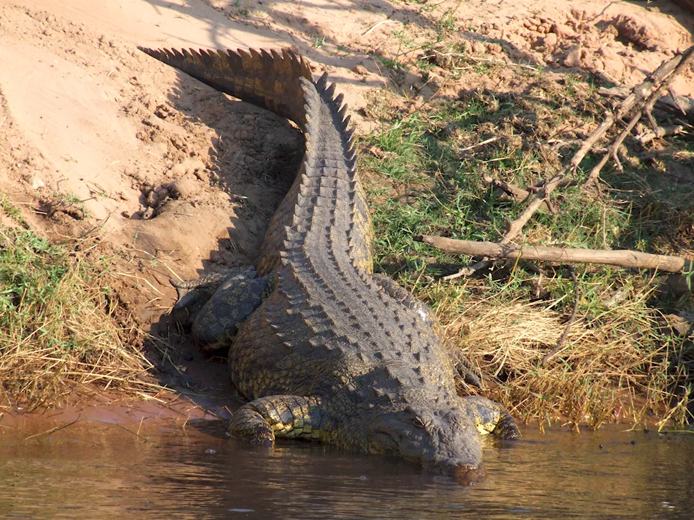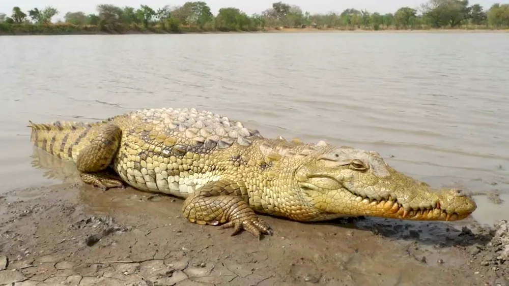 A fierce crocodile basking in the sun on a riverbank in Africa, with its sharp teeth and scaly skin on full display. Another photo shows a massive crocodile gliding through murky waters, blending in perfectly with its natural habitat in the wilds of Africa.