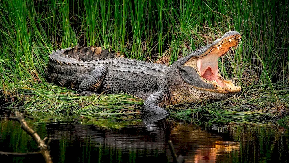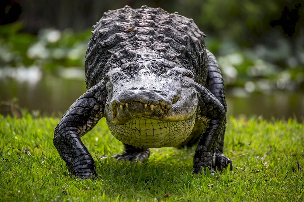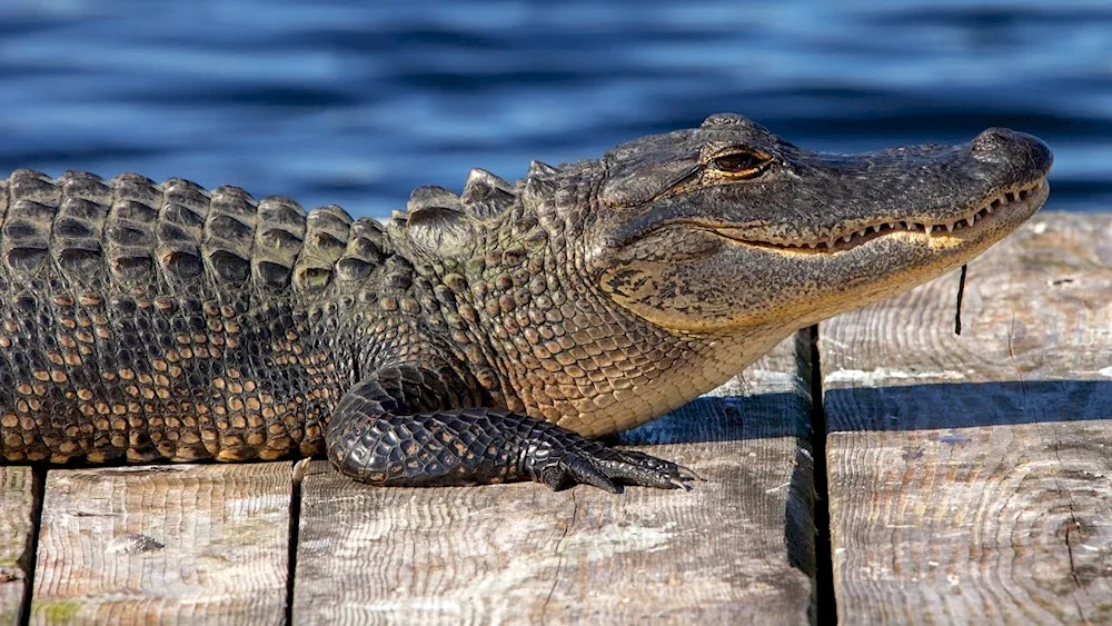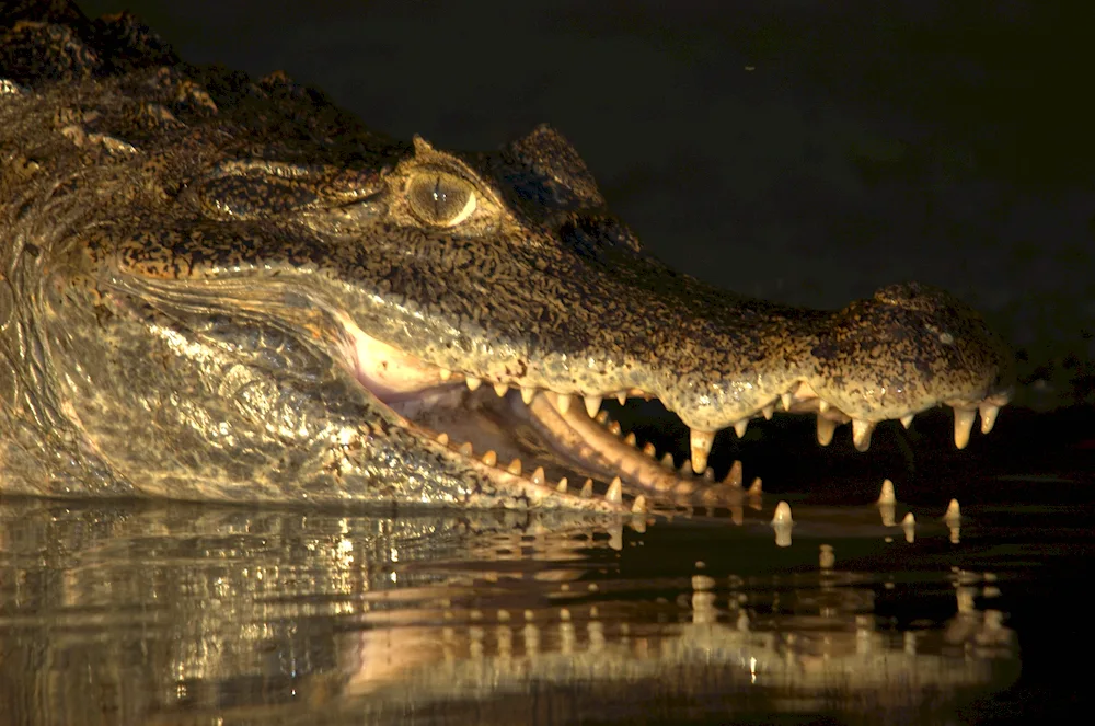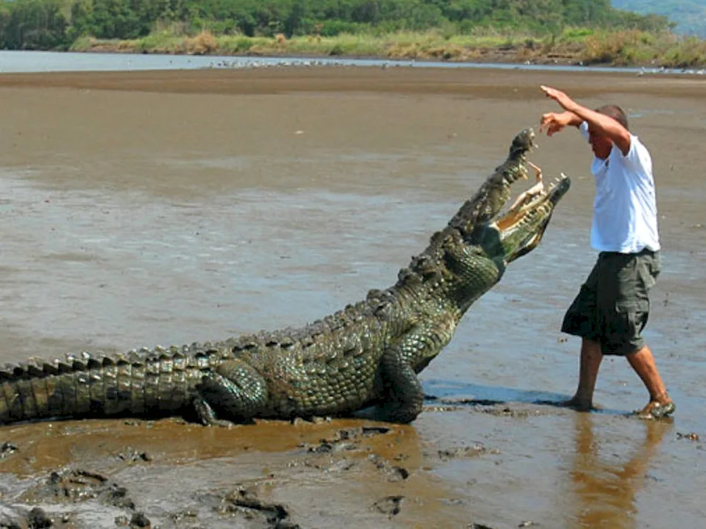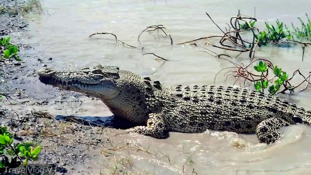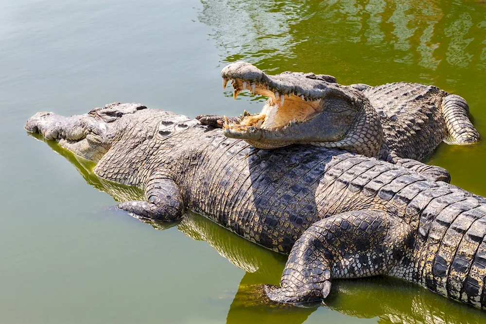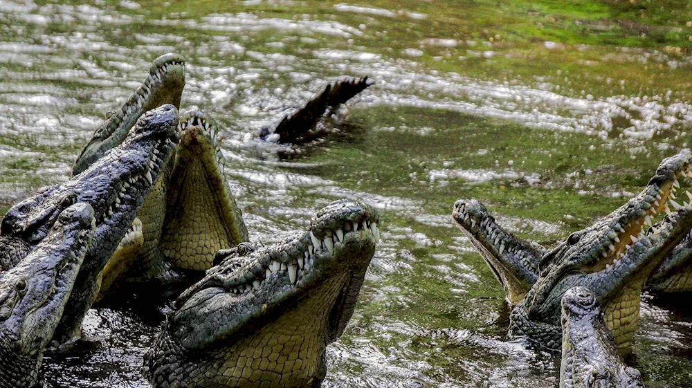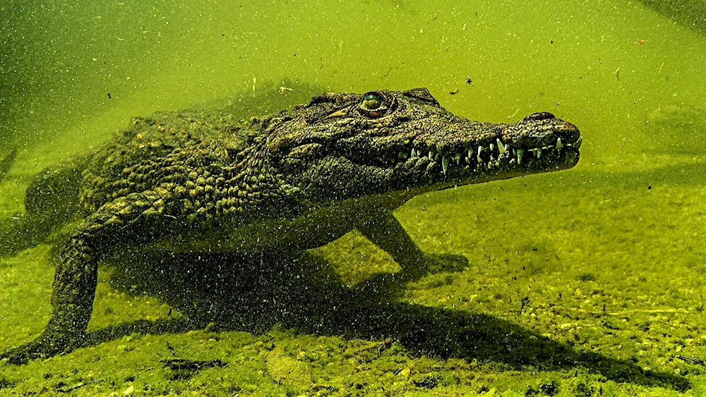A fierce crocodile basking in the sun on a riverbank in Africa, with its sharp teeth and scaly skin on full display. Another photo shows a massive crocodile gliding through murky waters, blending in perfectly with its natural habitat in the wilds of Africa.