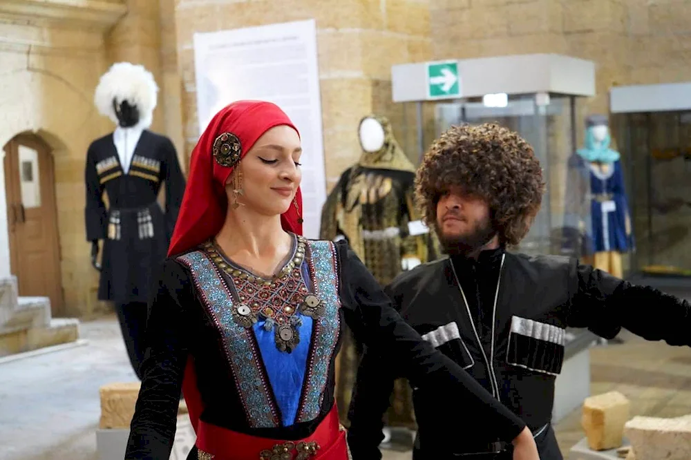 Dagestan traditional hats with intricate hairstyles woven into the fabric are displayed in a variety of vibrant colors, showcasing the rich cultural heritage of the region. The photos capture the beauty and craftsmanship of these unique headpieces, perfect for adding a touch of ethnic flair to any outfit.