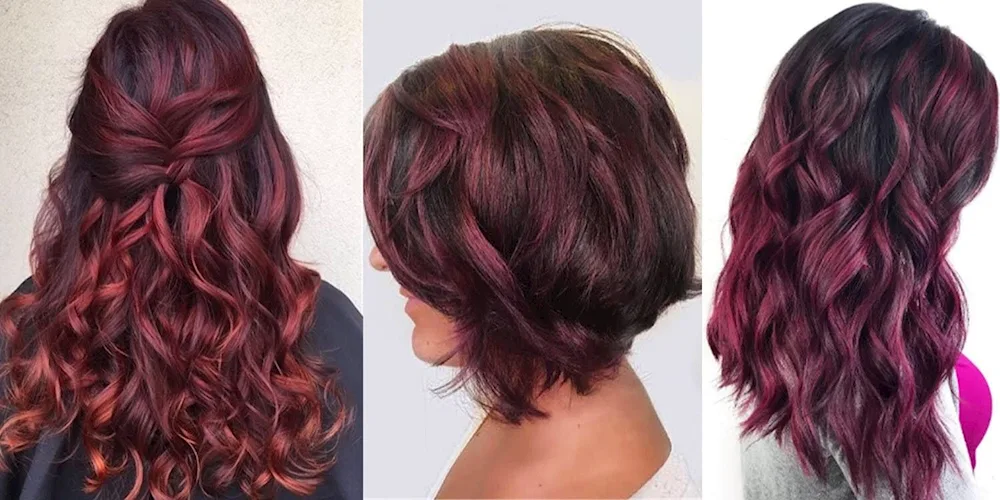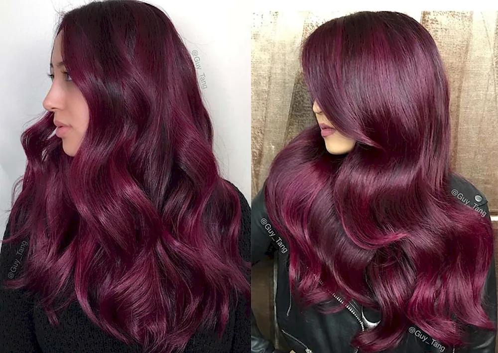 Eggplant colored hair Here are some pictures of hair dyed in a deep, rich shade of eggplant. The color is dark and vibrant, perfect for those looking to make a bold statement with their hair.