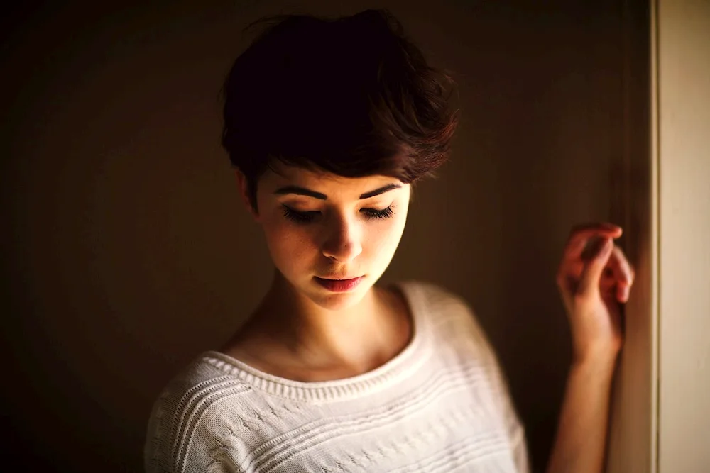 Check out these striking images of a young lady sporting a trendy short haircut, but with her face hidden or obscured from view. The anonymity adds a mysterious and intriguing element to the portraits.