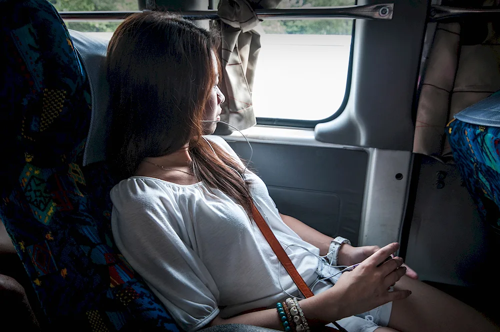 Girls on buses Collection of photographs capturing teenage girls laughing and talking on crowded city buses, their faces lit up with joy and excitement. Images showcasing the diversity and camaraderie among young women navigating public transportation together.