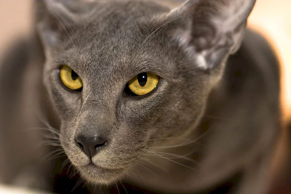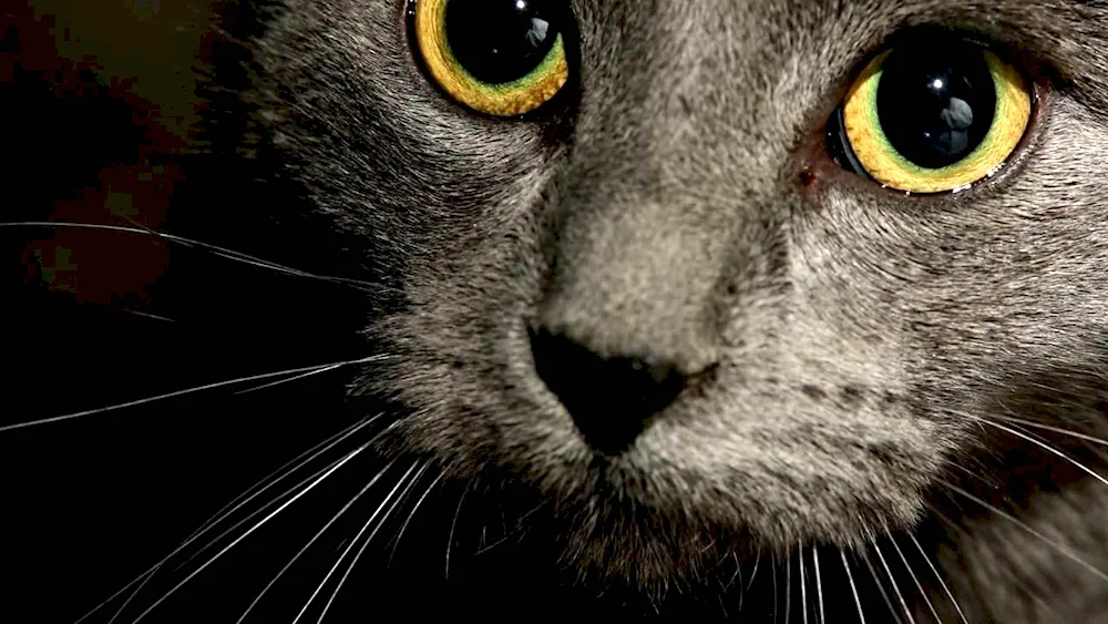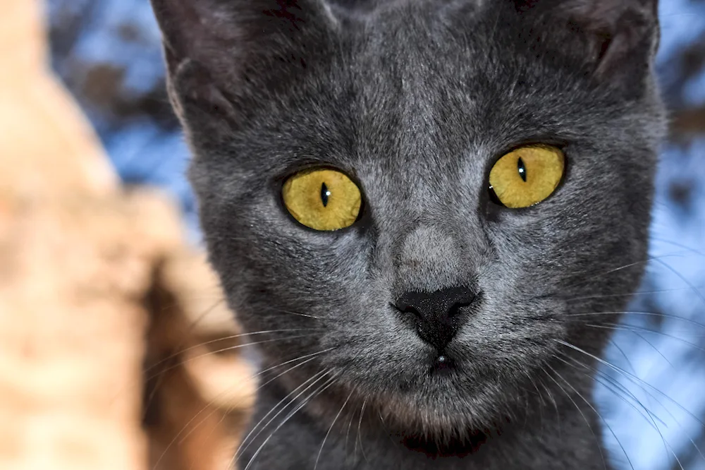 Here are some pictures of a grey kitty with striking yellow eyes. The cat looks majestic and intense, its piercing gaze drawing you in.