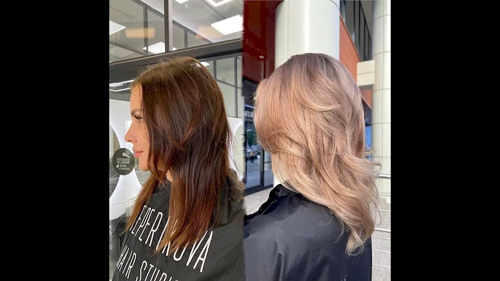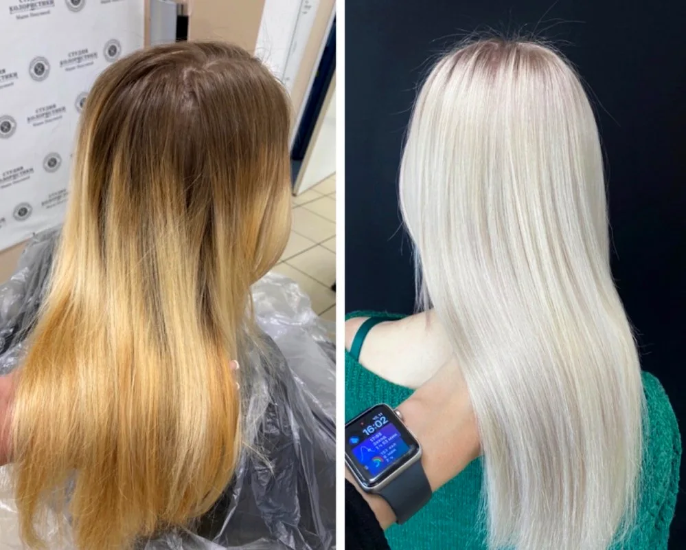 Here are some pictures showing the process of toning and stretching hair color. You can see how the color is applied, blended, and seamlessly transitioned for a natural and beautiful result. Check out these images for inspiration on achieving the perfect hair tone with color stretching techniques.