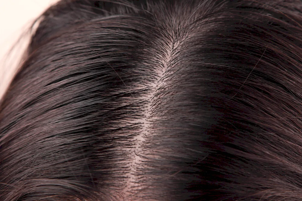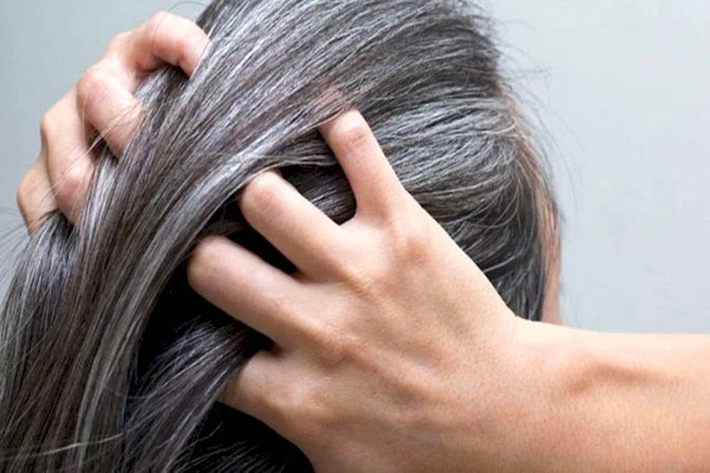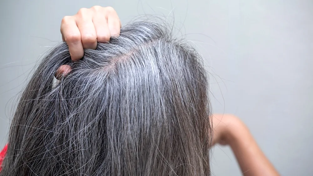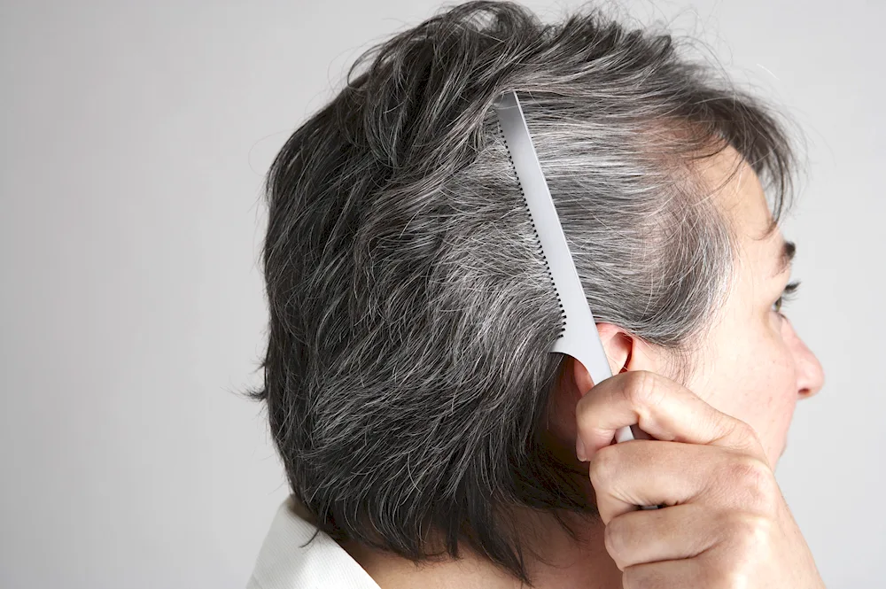 Hair with graying  Grey hair creeping in on a middle-aged woman, blending with her original dark locks, a visual representation of aging gracefully. Close-up shots of silver strands intertwined with brown hair, showcasing the natural process of hair turning grey over time.