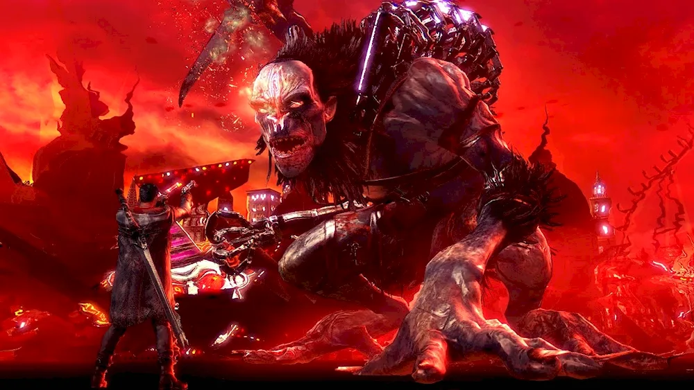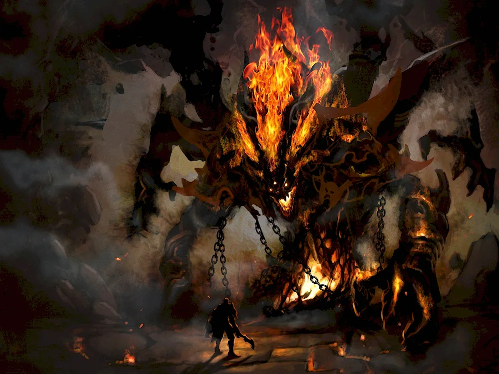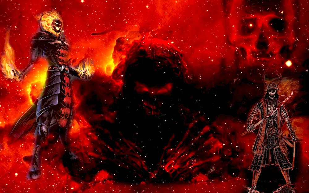 Photos of the intimidating Hell boss show a powerful figure in a dark suit, surrounded by flames and smoke. The images capture the intense and commanding presence of the boss, conveying a sense of fear and authority.