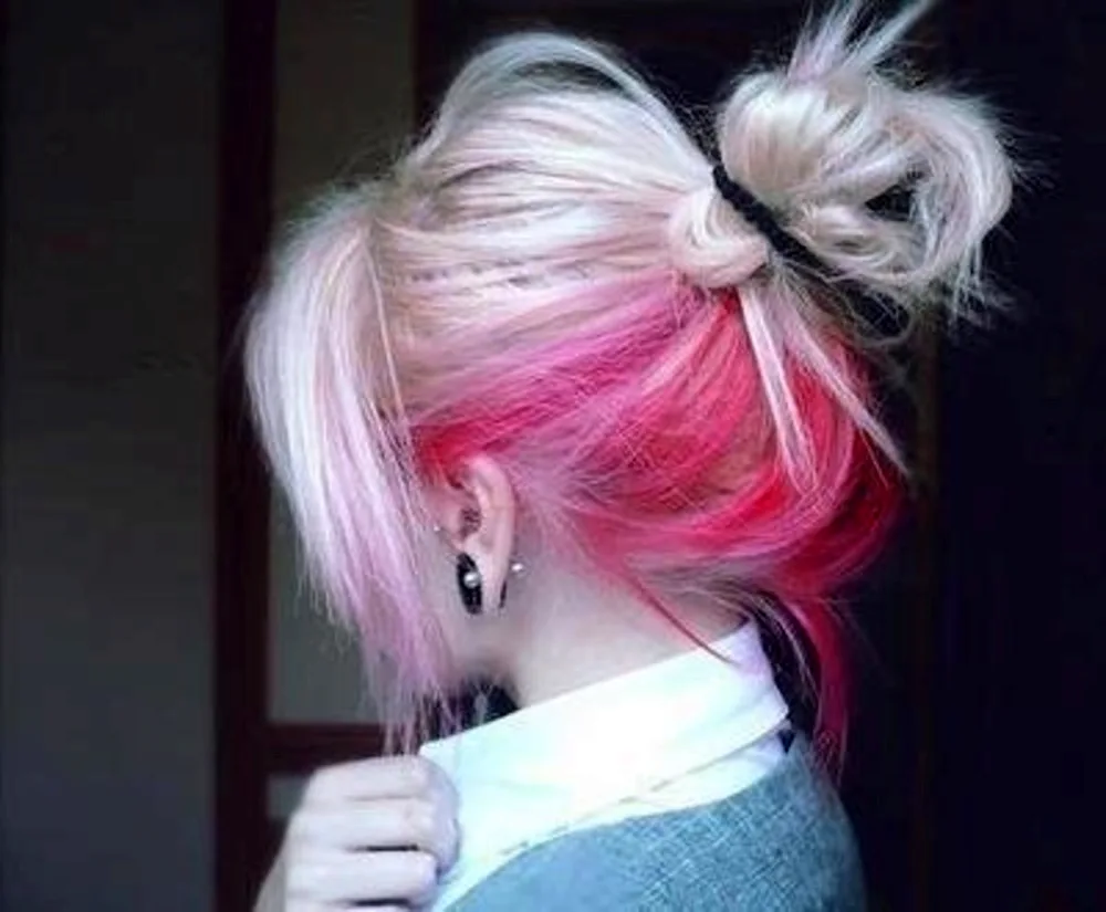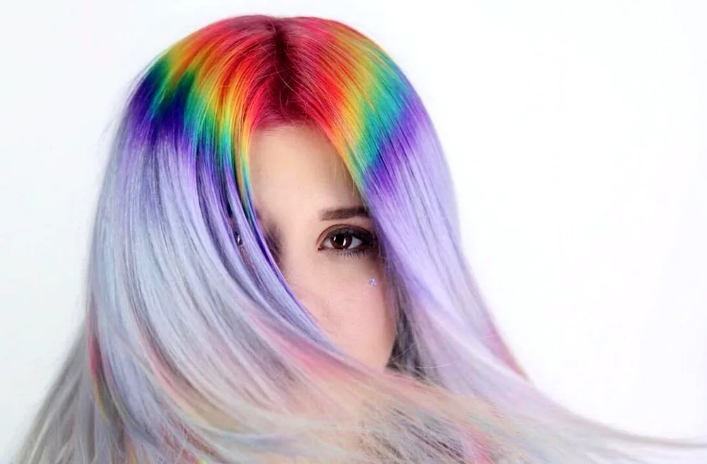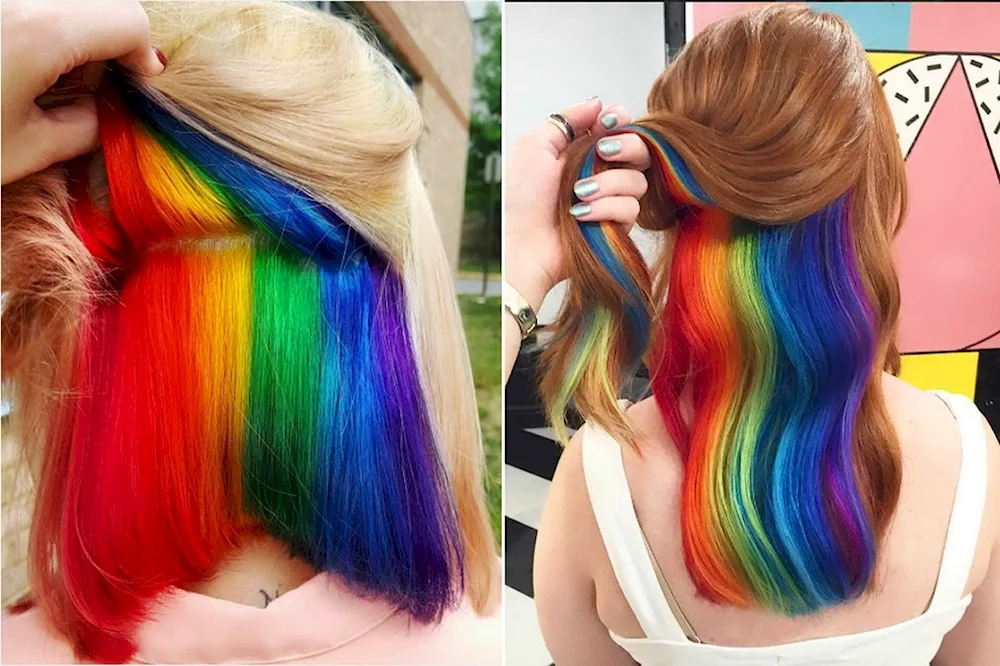 Hidden hair coloring white White hair color hidden under layers of vibrant rainbow hues, peeking out subtly for a surprising twist. A close-up shot capturing the intricate details of the hidden white strands blending seamlessly with the colorful palette.