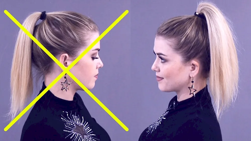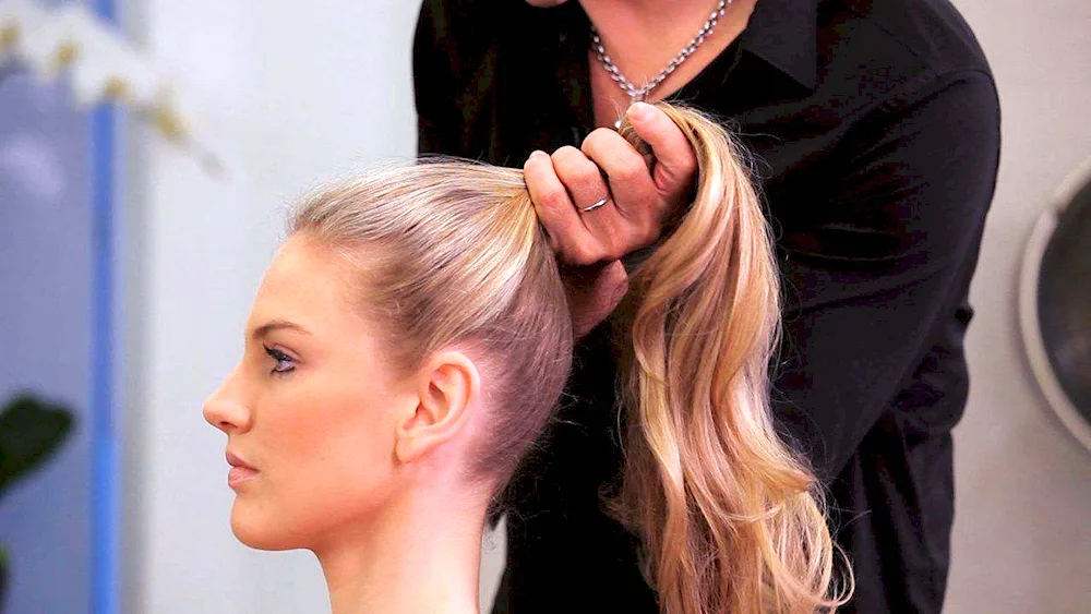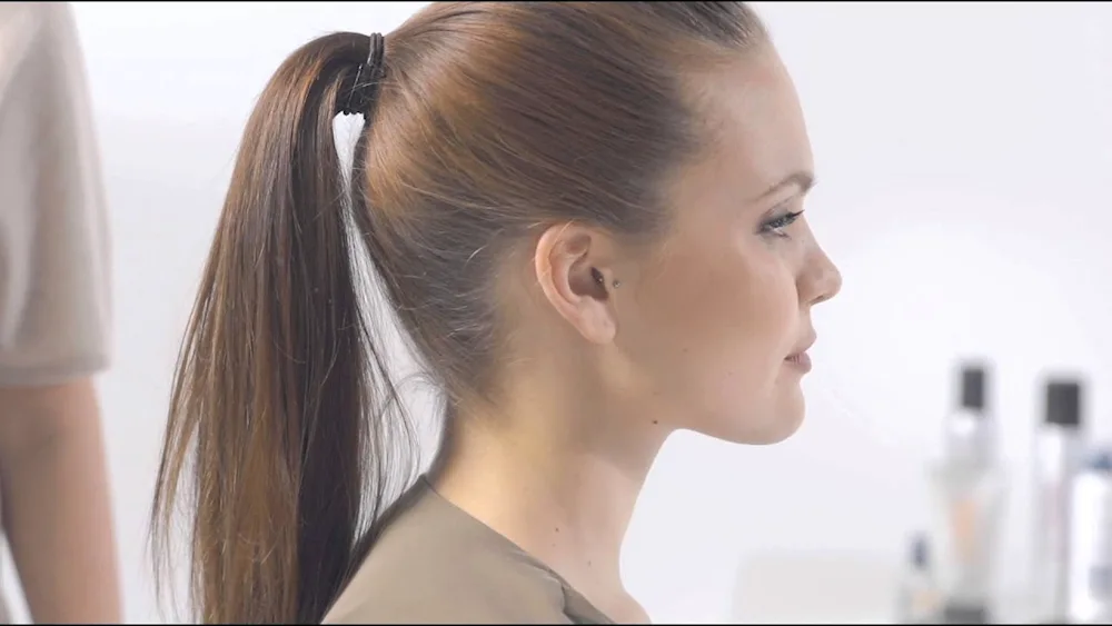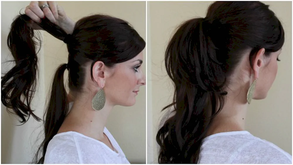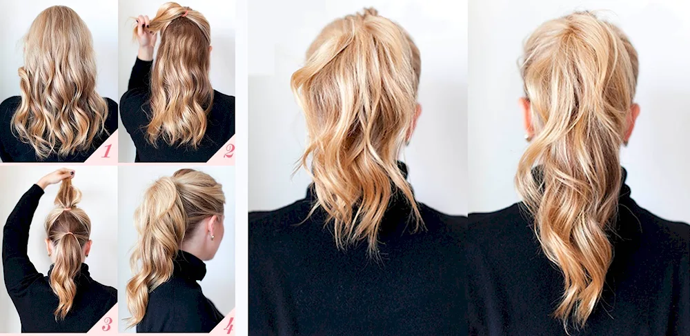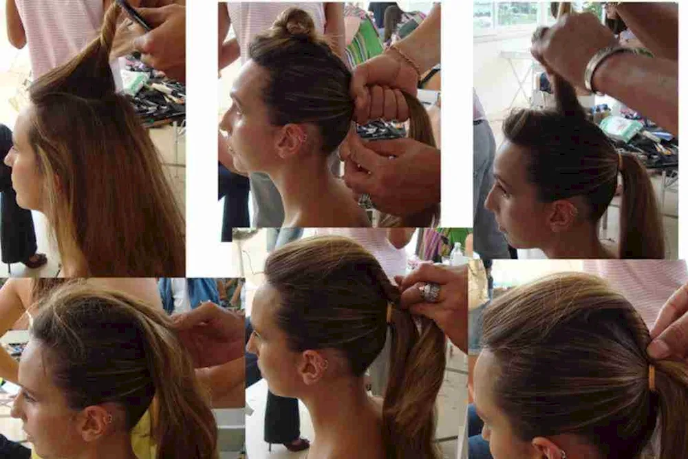 Tutorial on creating a sleek high ponytail, complete with step-by-step photos showcasing each stage from brushing through to securing with a hair tie. Helpful visual guide for achieving a stylish and polished hairstyle for any occasion.