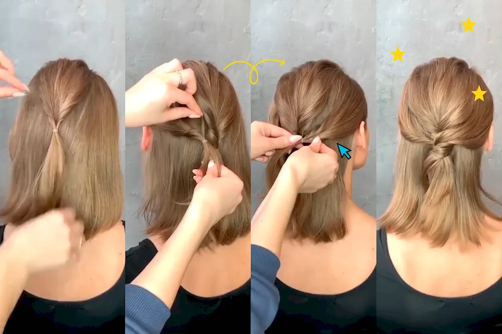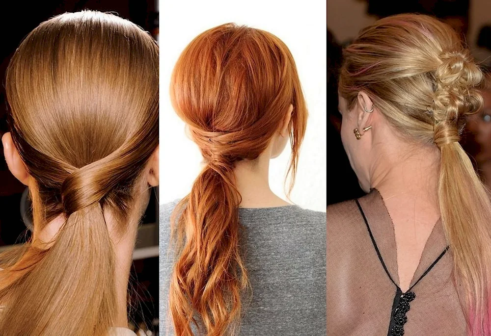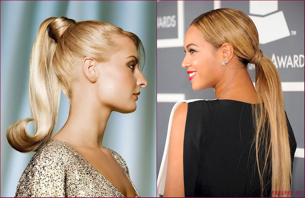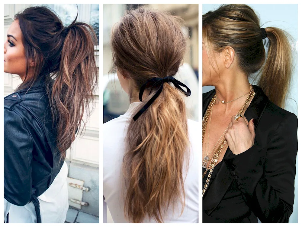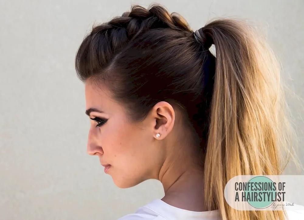 Tutorial on creating a sleek high ponytail, complete with step-by-step photos showcasing each stage from brushing through to securing with a hair tie. Helpful visual guide for achieving a stylish and polished hairstyle for any occasion.