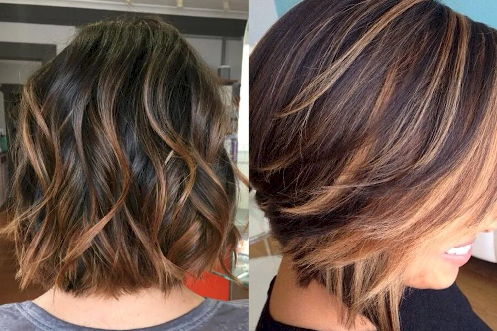 Check out these stunning images showcasing highlights on dark short hair! You'll love the way the color adds depth and dimension to each hairstyle.