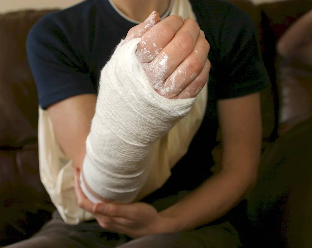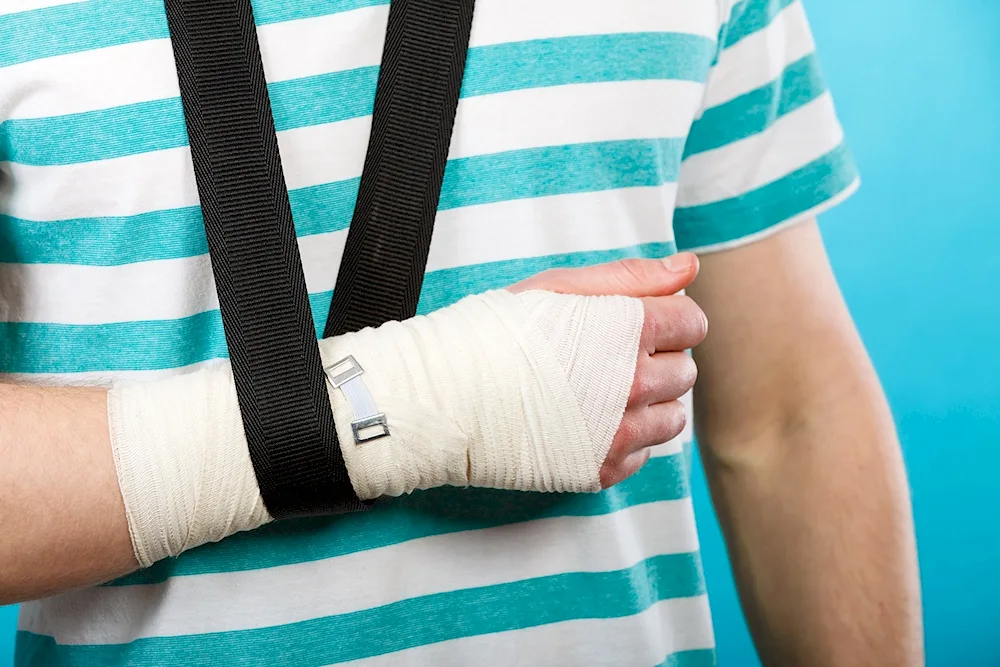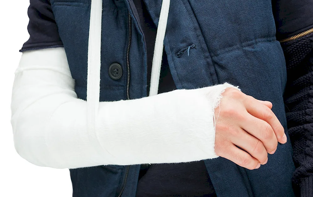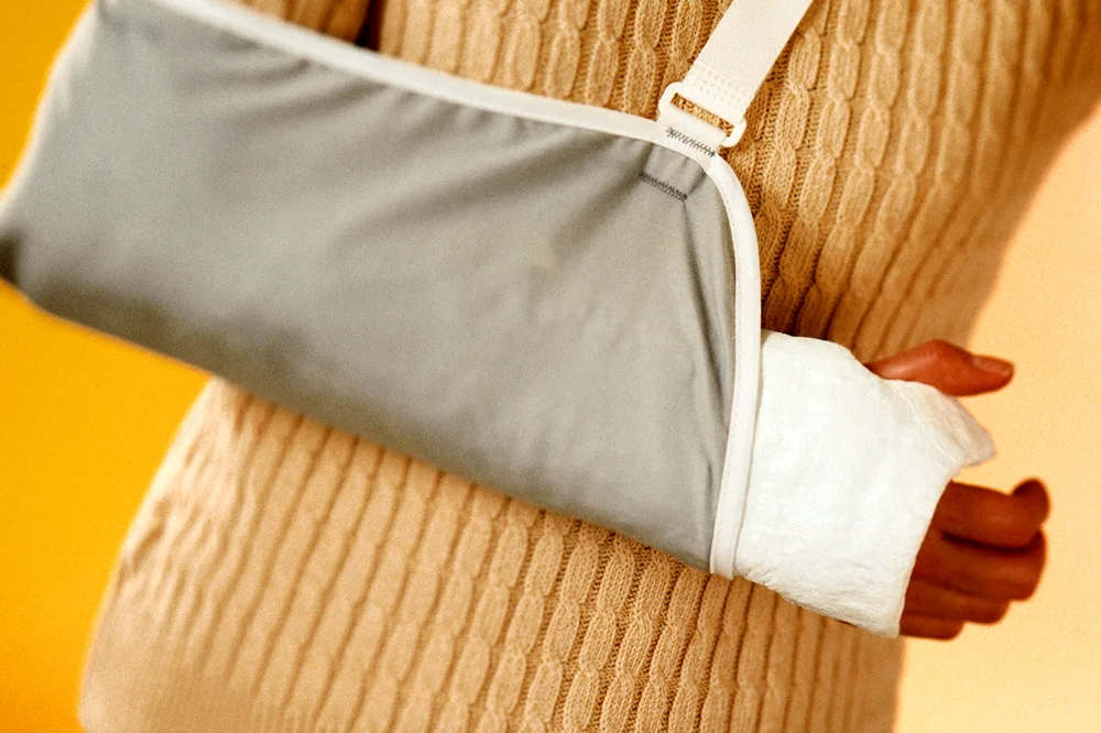 Tips on dressing with a broken arm: photo 1 shows a person wearing a button-up shirt with the unaffected arm through the sleeve, while photo 2 demonstrates how to adapt a jacket by leaving the affected arm out of the sleeve.