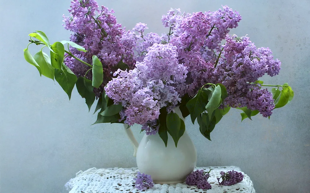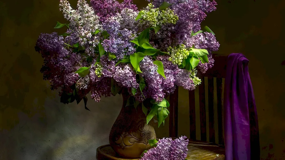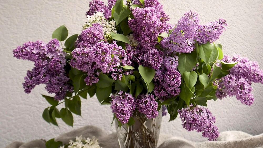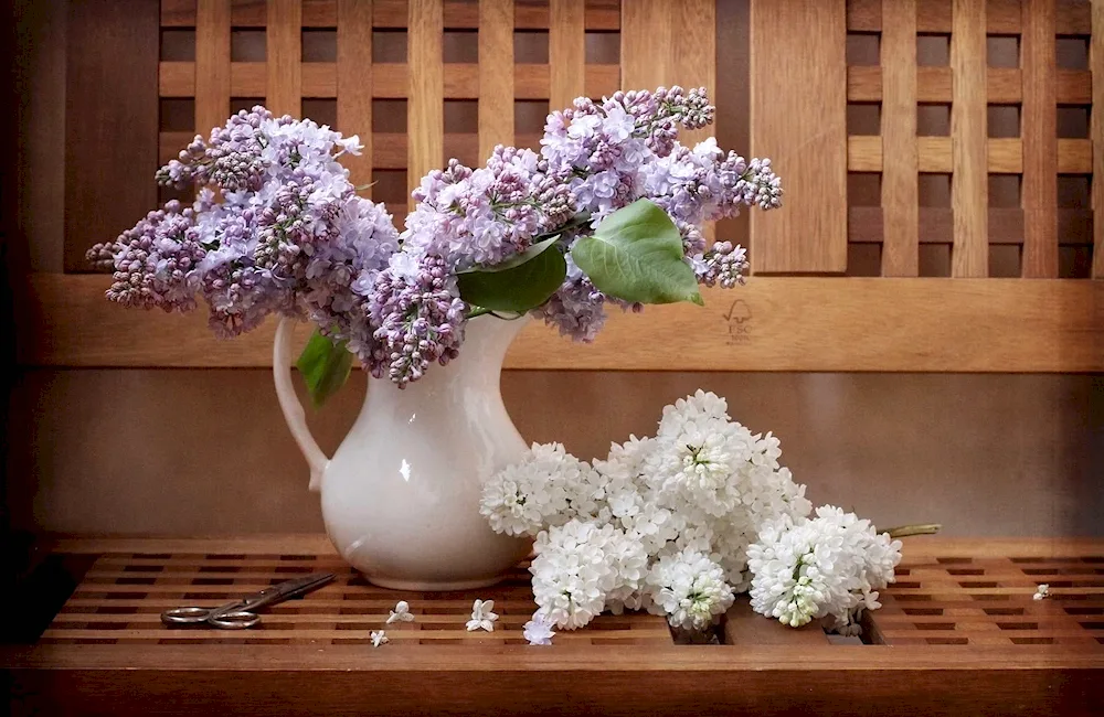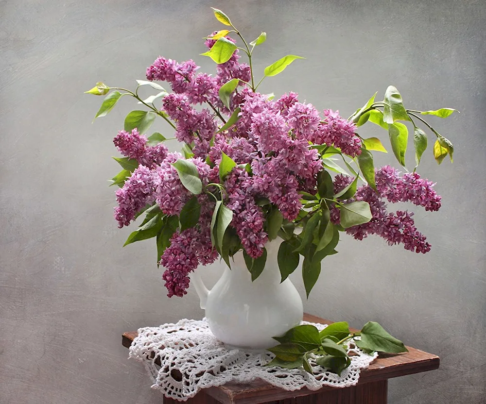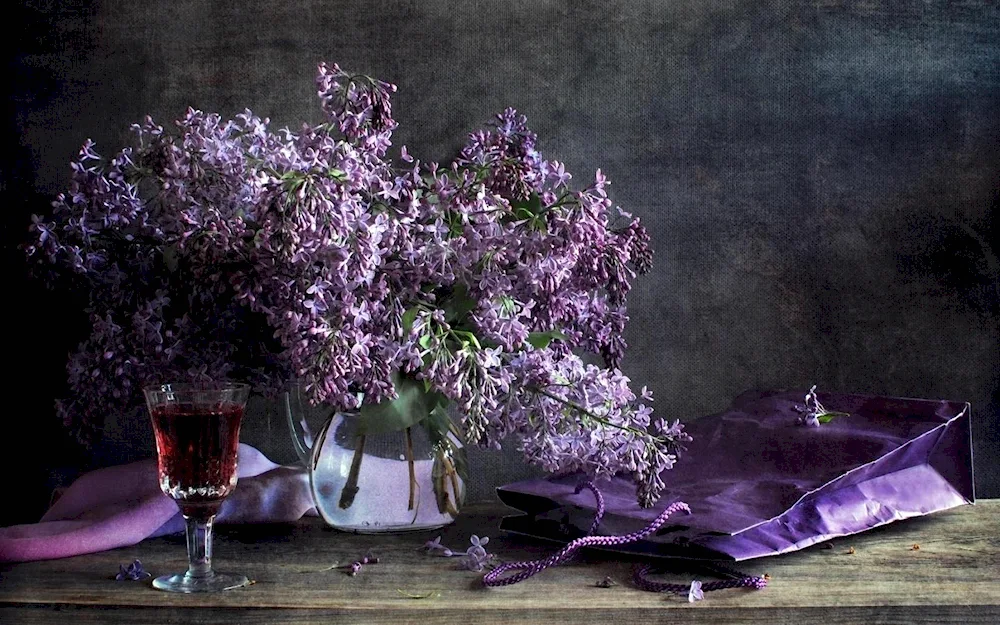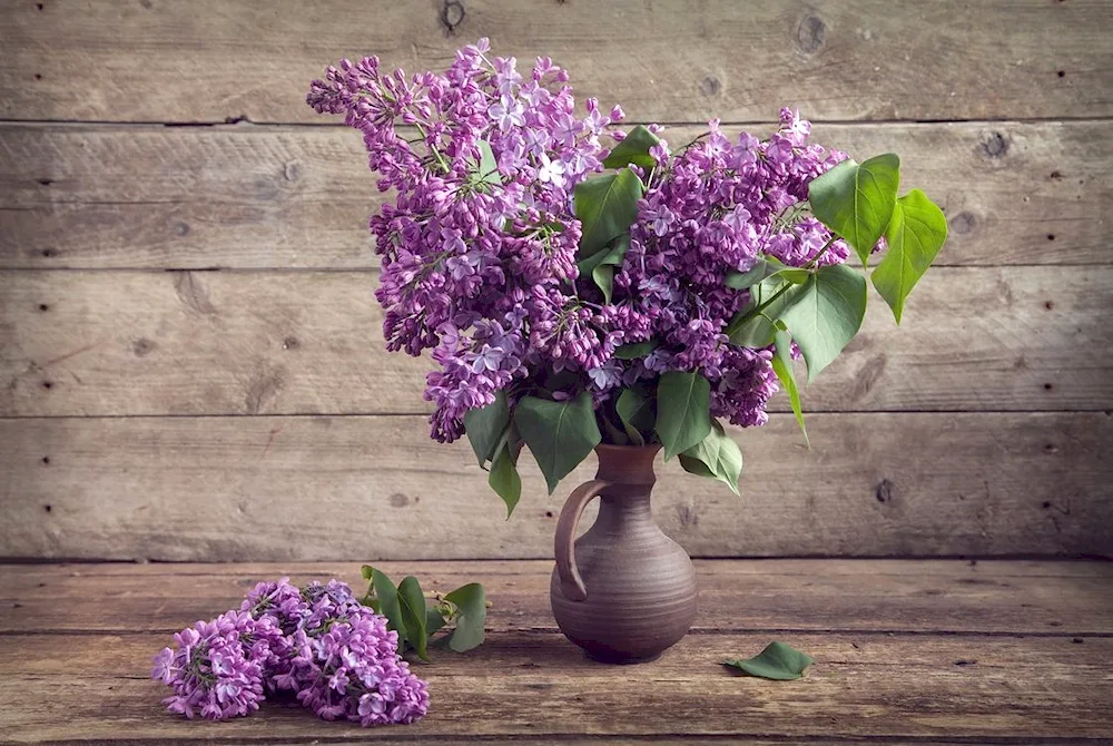 Photos of beautiful lilac flowers arranged in a glass vase, with soft natural light streaming in through a nearby window, creating a stunning and serene still life scene. The delicate purple hues of the lilac contrast beautifully with the clear glass vase, making it a perfect springtime centerpiece for any home decor.