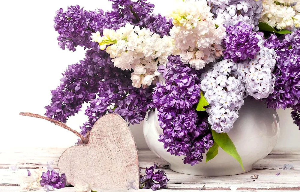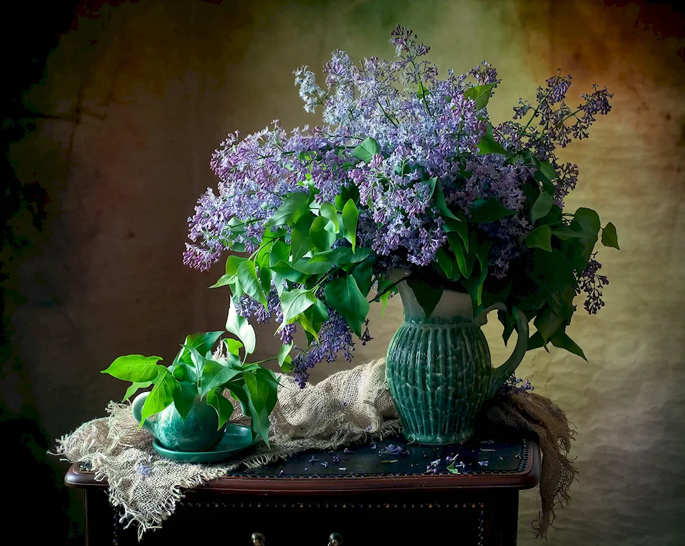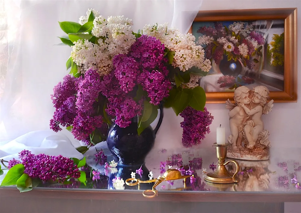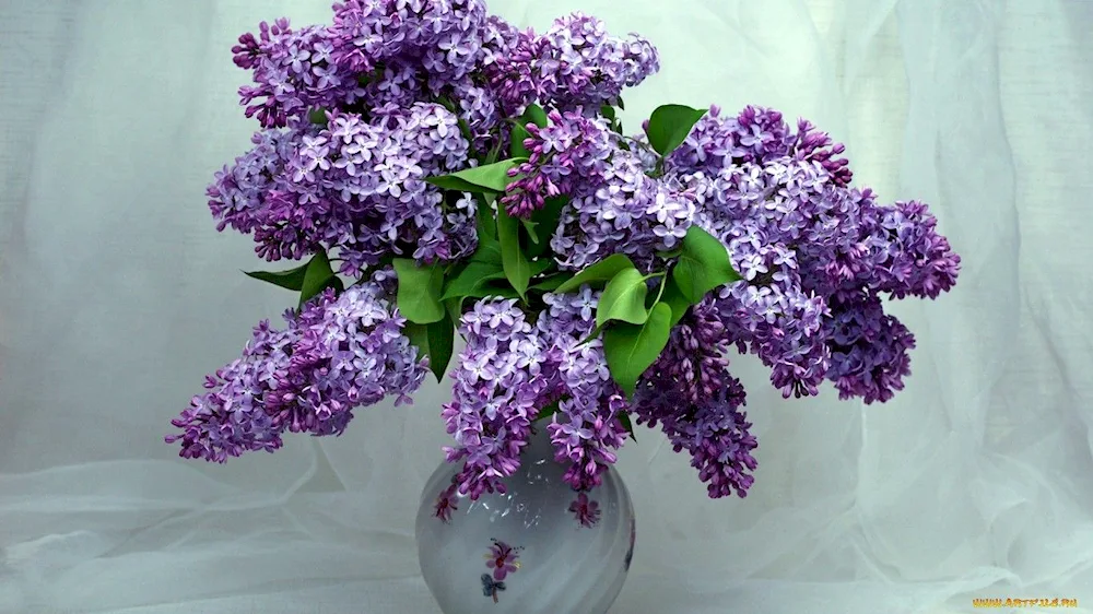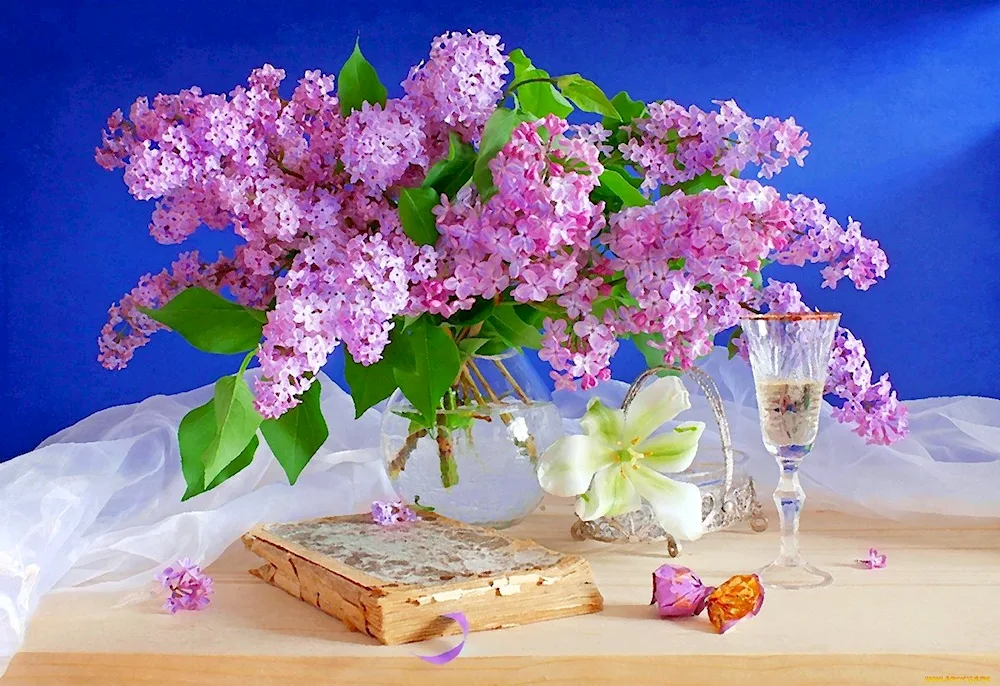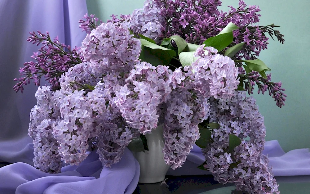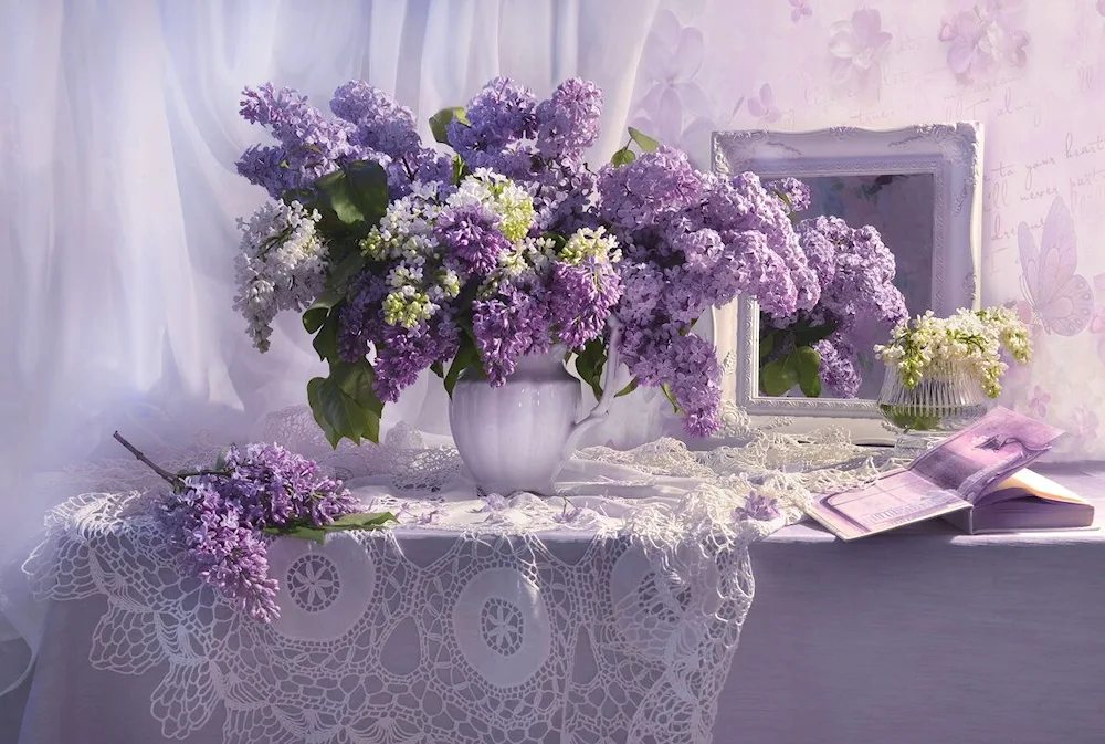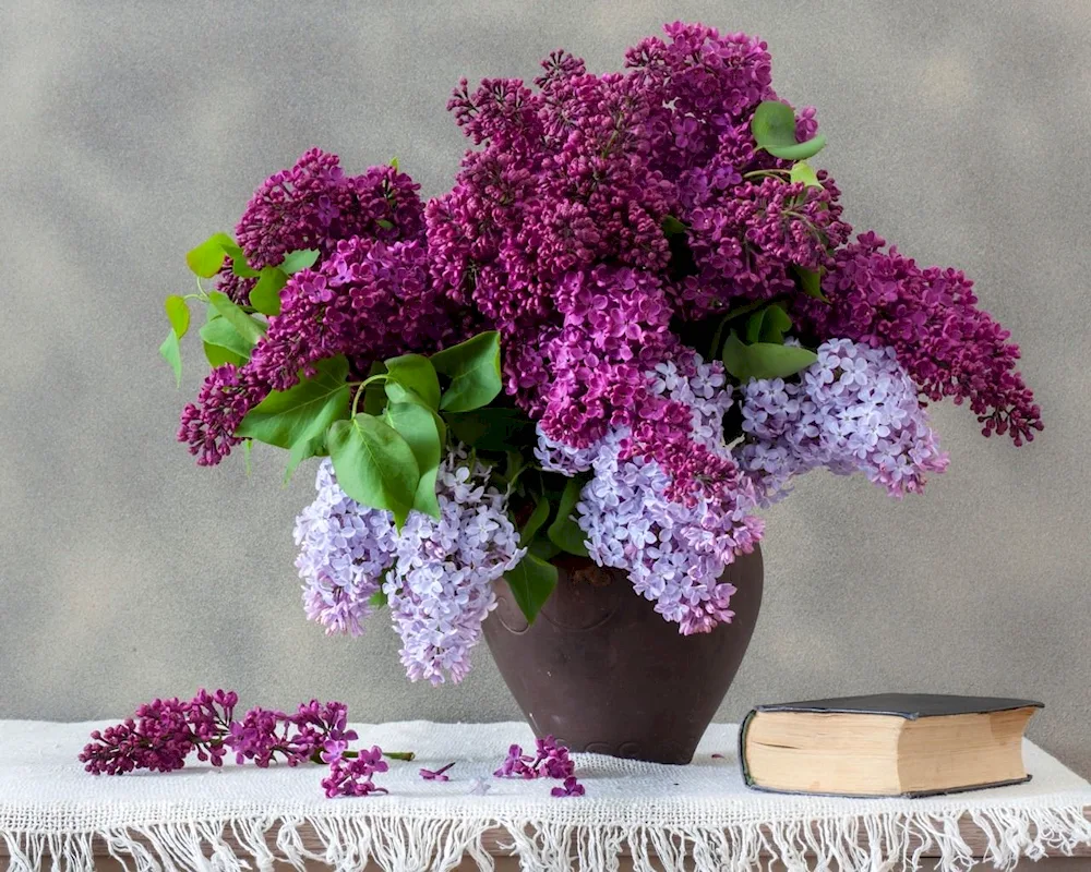 Photos of beautiful lilac flowers arranged in a glass vase, with soft natural light streaming in through a nearby window, creating a stunning and serene still life scene. The delicate purple hues of the lilac contrast beautifully with the clear glass vase, making it a perfect springtime centerpiece for any home decor.