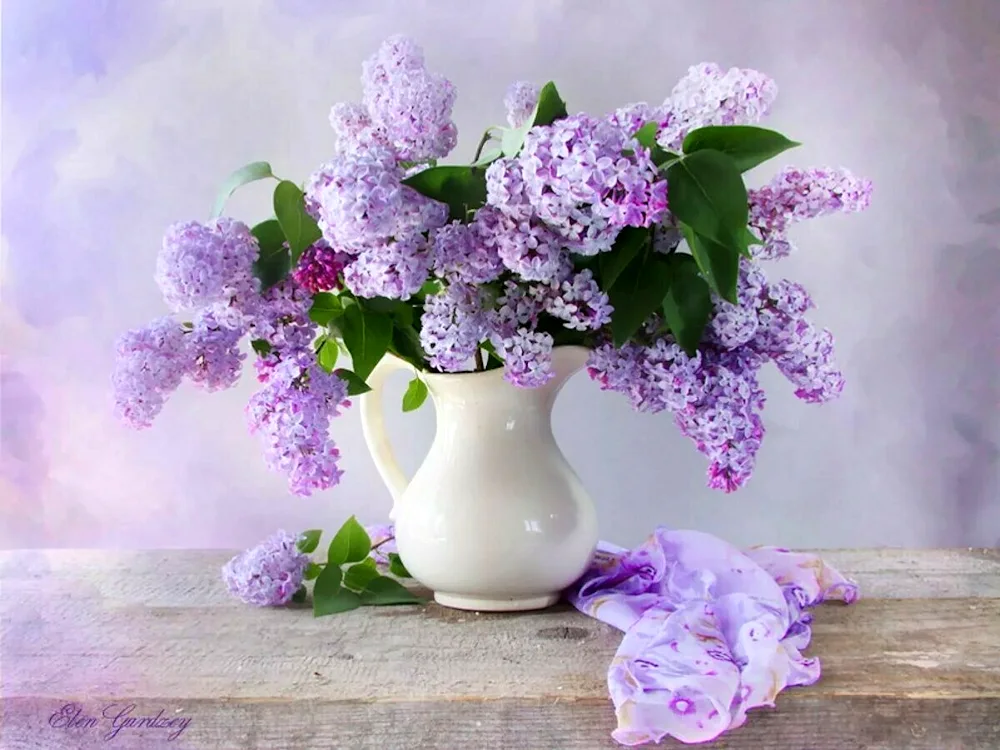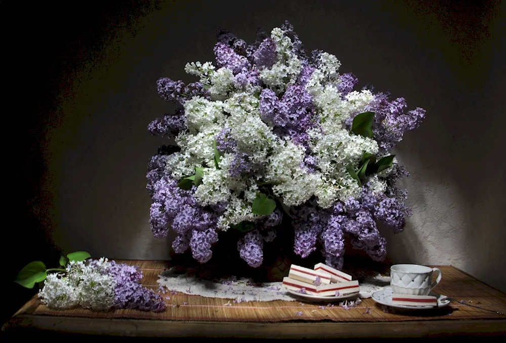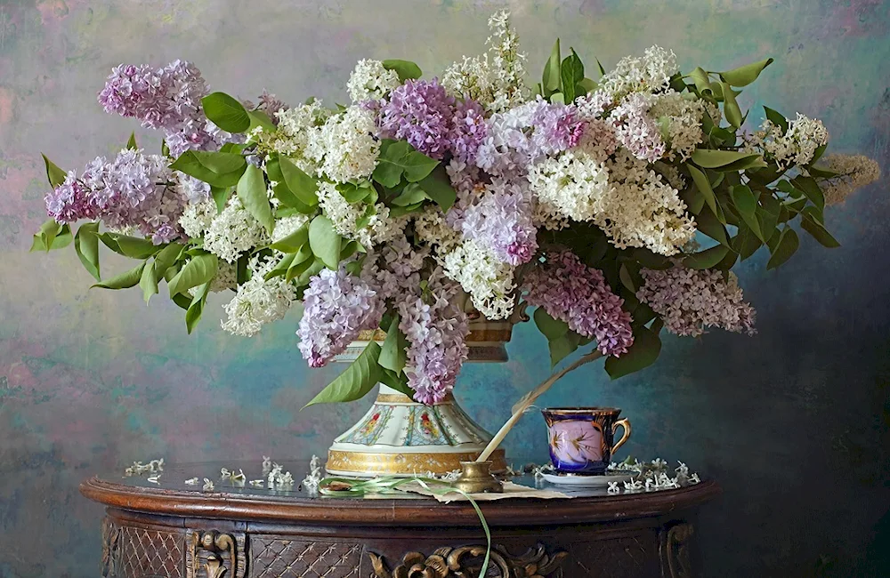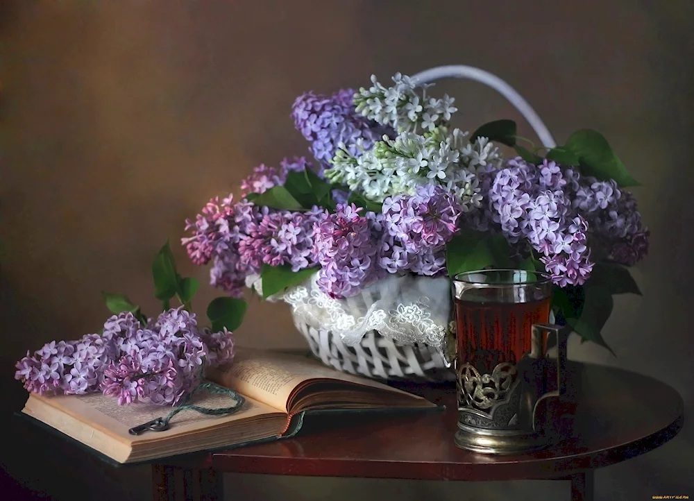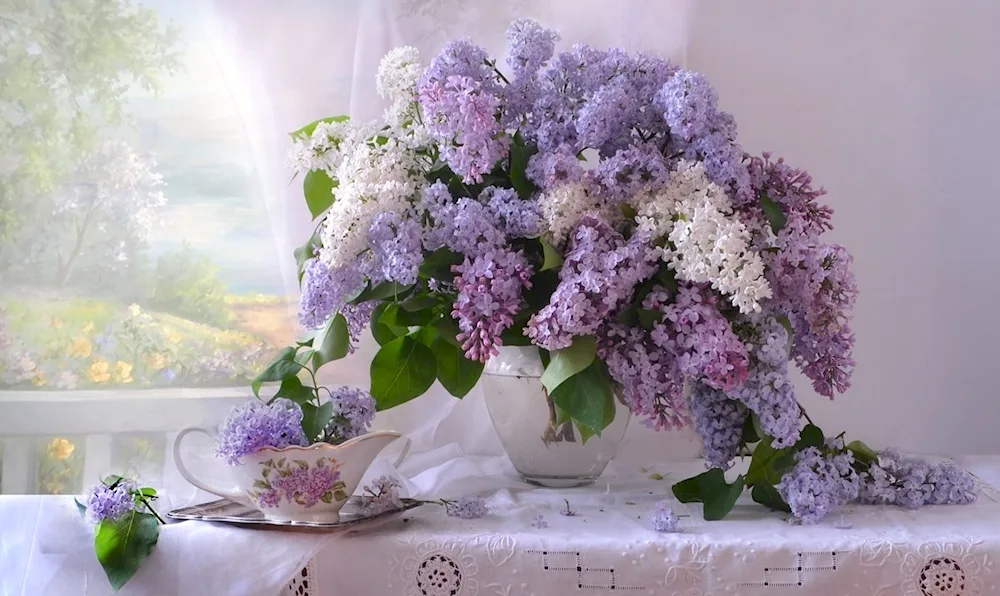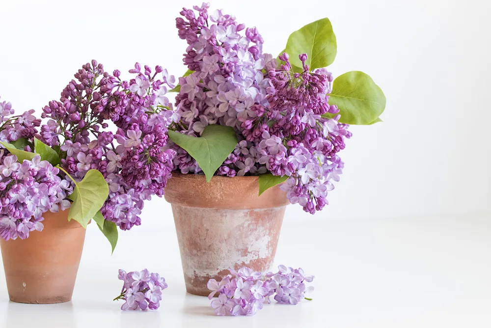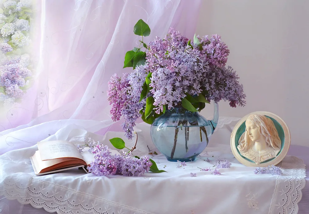 Photos of beautiful lilac flowers arranged in a glass vase, with soft natural light streaming in through a nearby window, creating a stunning and serene still life scene. The delicate purple hues of the lilac contrast beautifully with the clear glass vase, making it a perfect springtime centerpiece for any home decor.