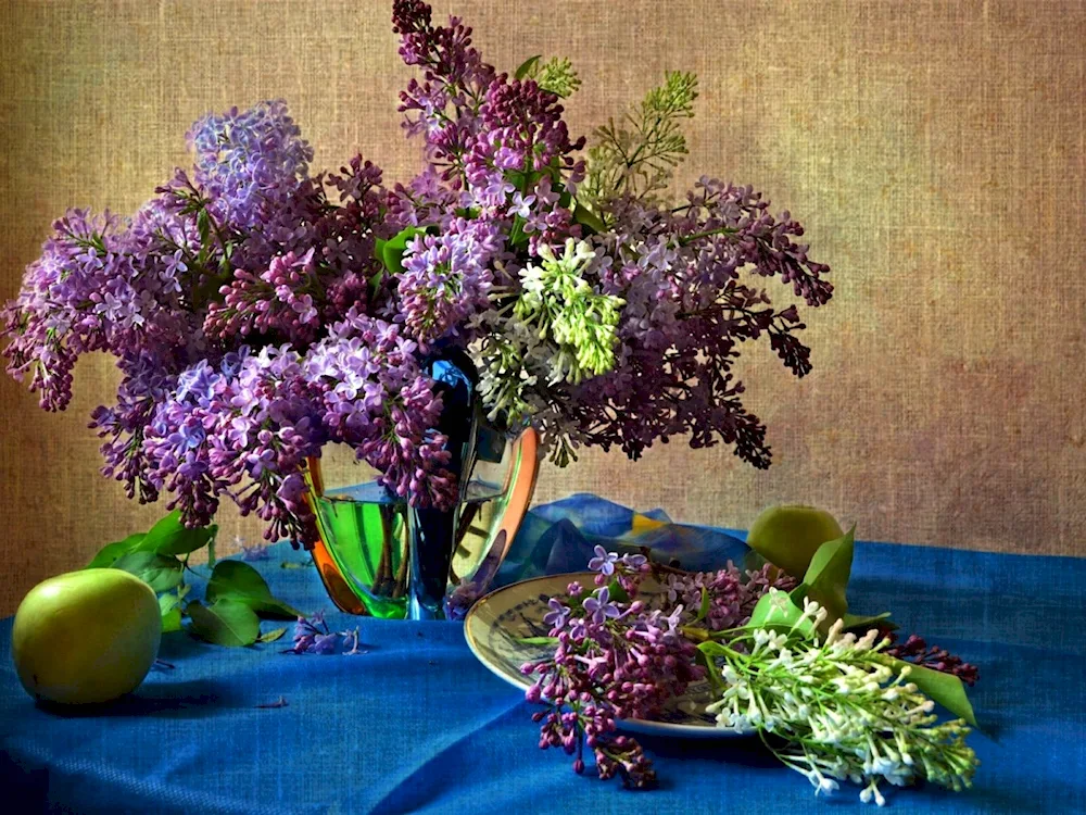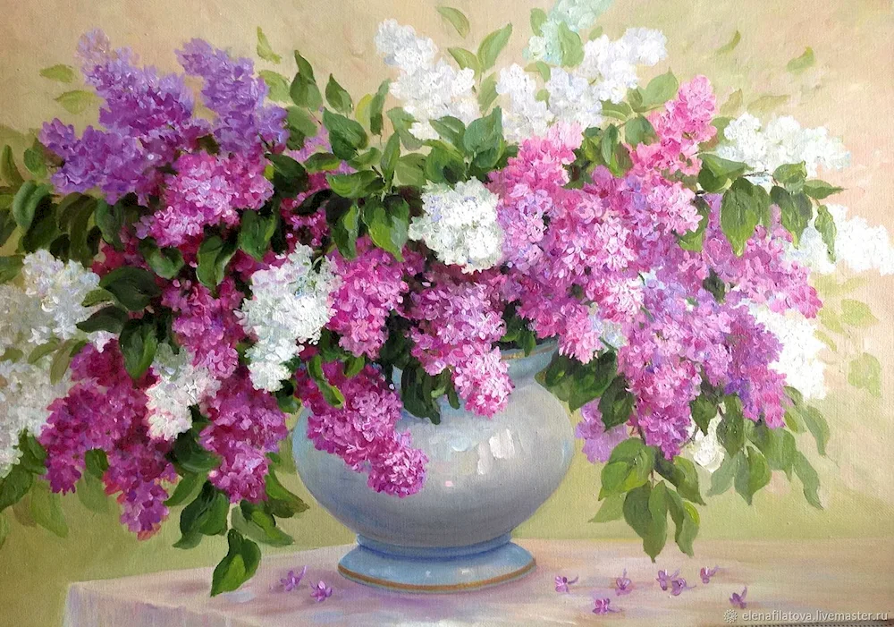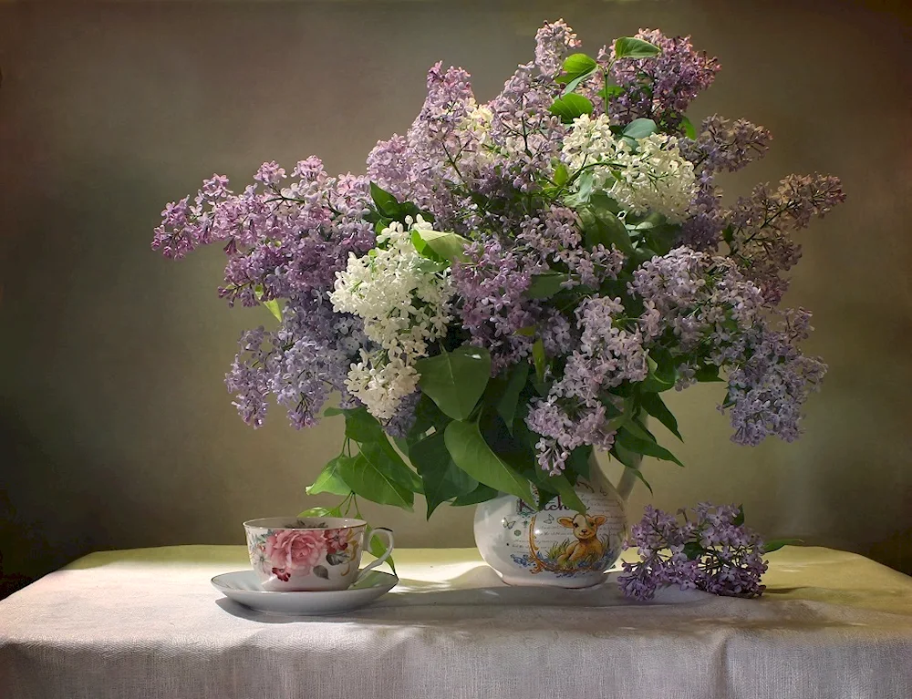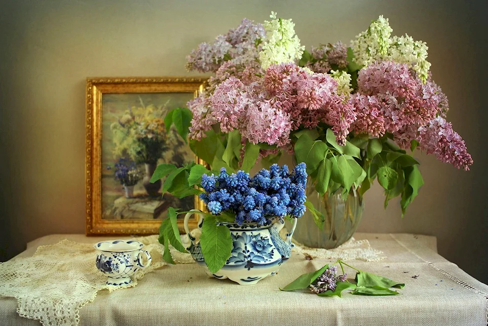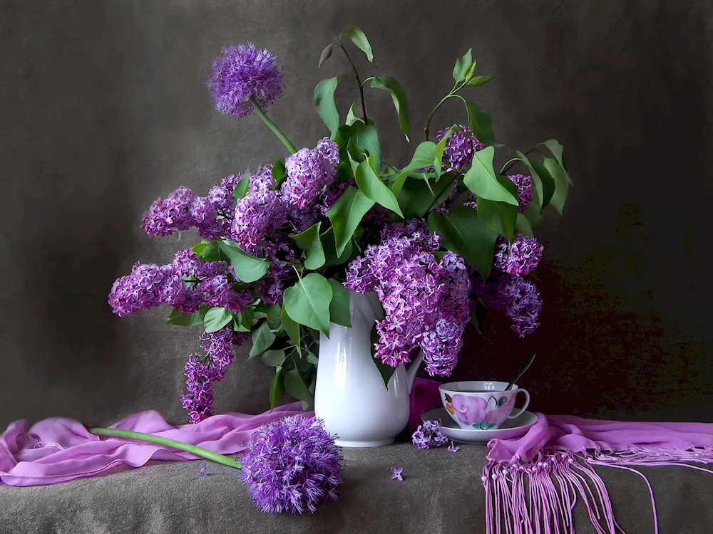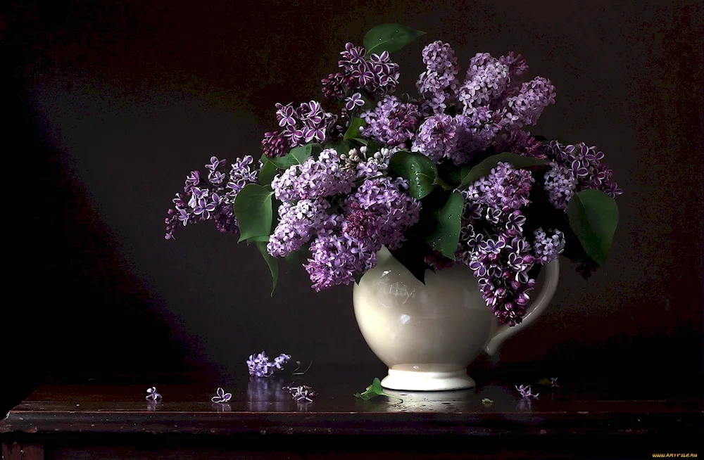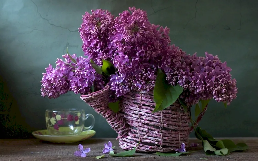 Photos of beautiful lilac flowers arranged in a glass vase, with soft natural light streaming in through a nearby window, creating a stunning and serene still life scene. The delicate purple hues of the lilac contrast beautifully with the clear glass vase, making it a perfect springtime centerpiece for any home decor.