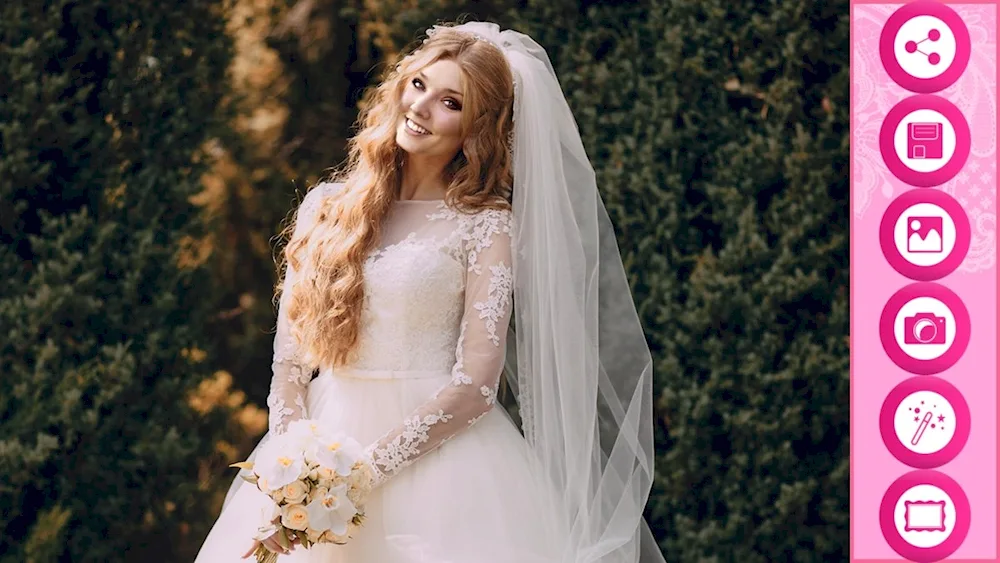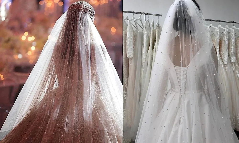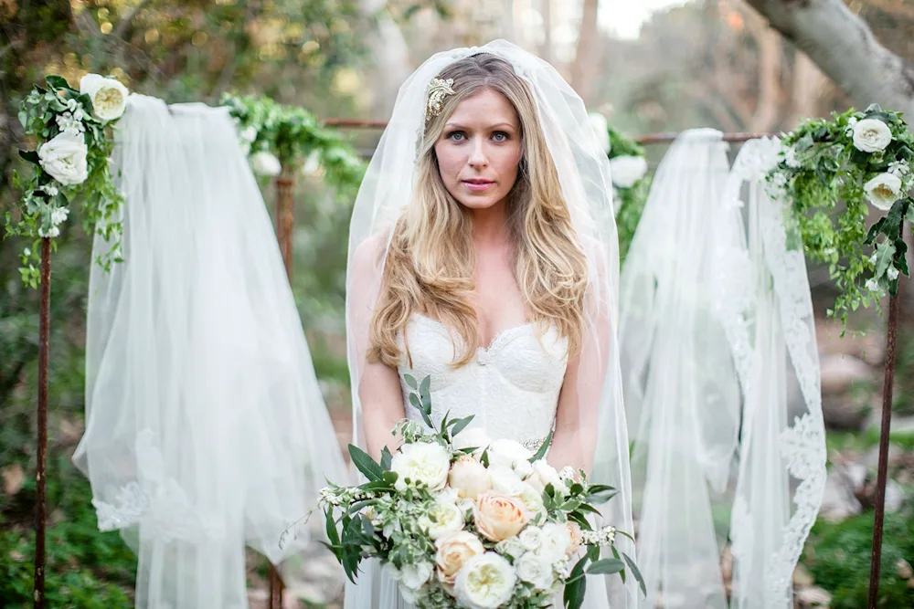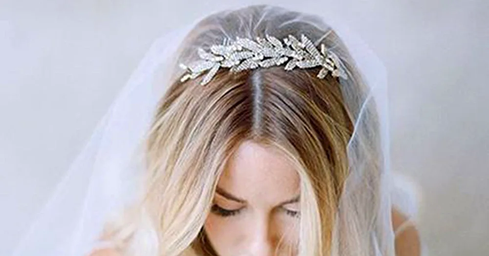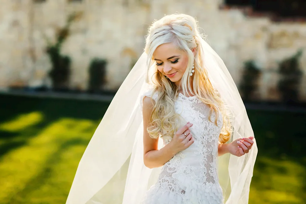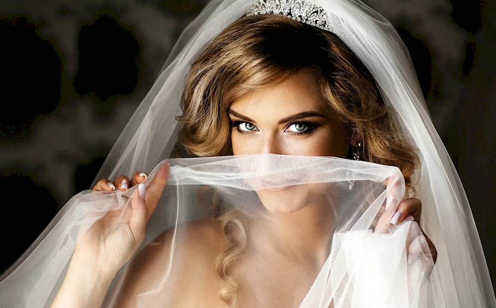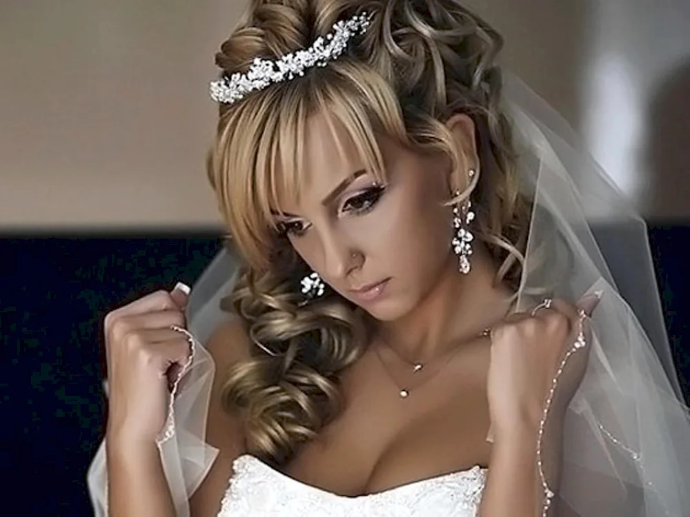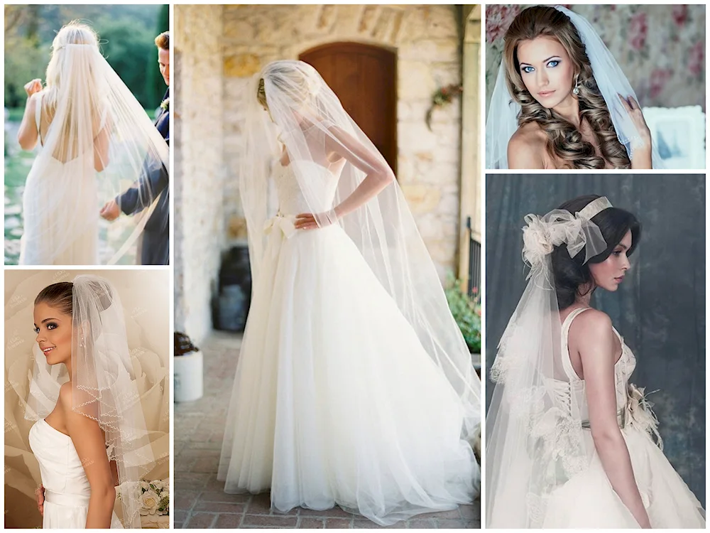 Images of flowing hair cascading over a delicate veil, creating a romantic and ethereal look perfect for a bride's wedding day. The loose curls and waves peeking out from beneath the veil add a touch of softness and elegance to the overall bridal ensemble.